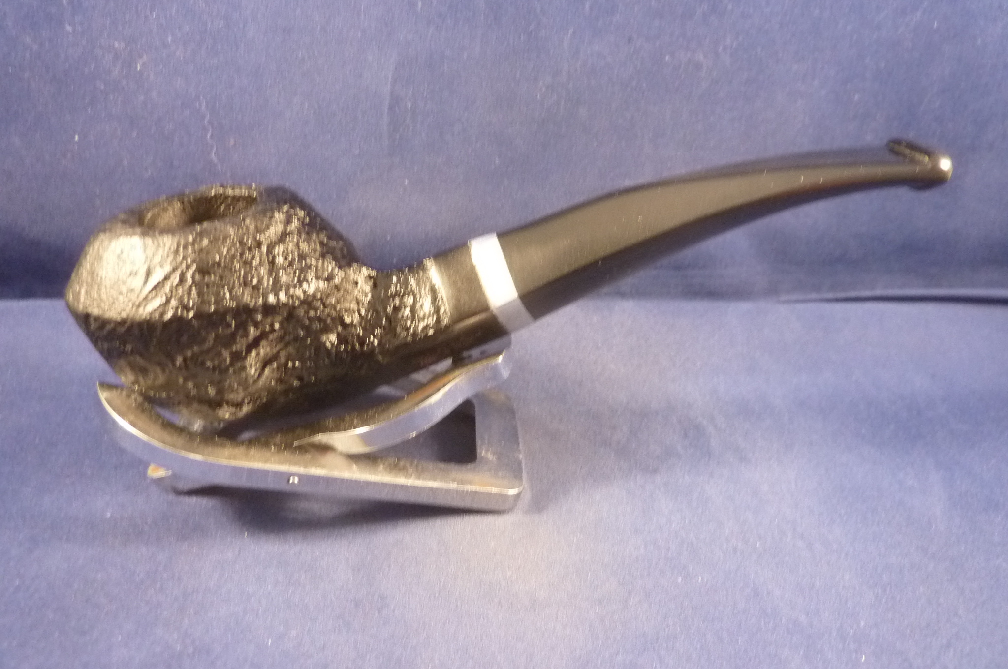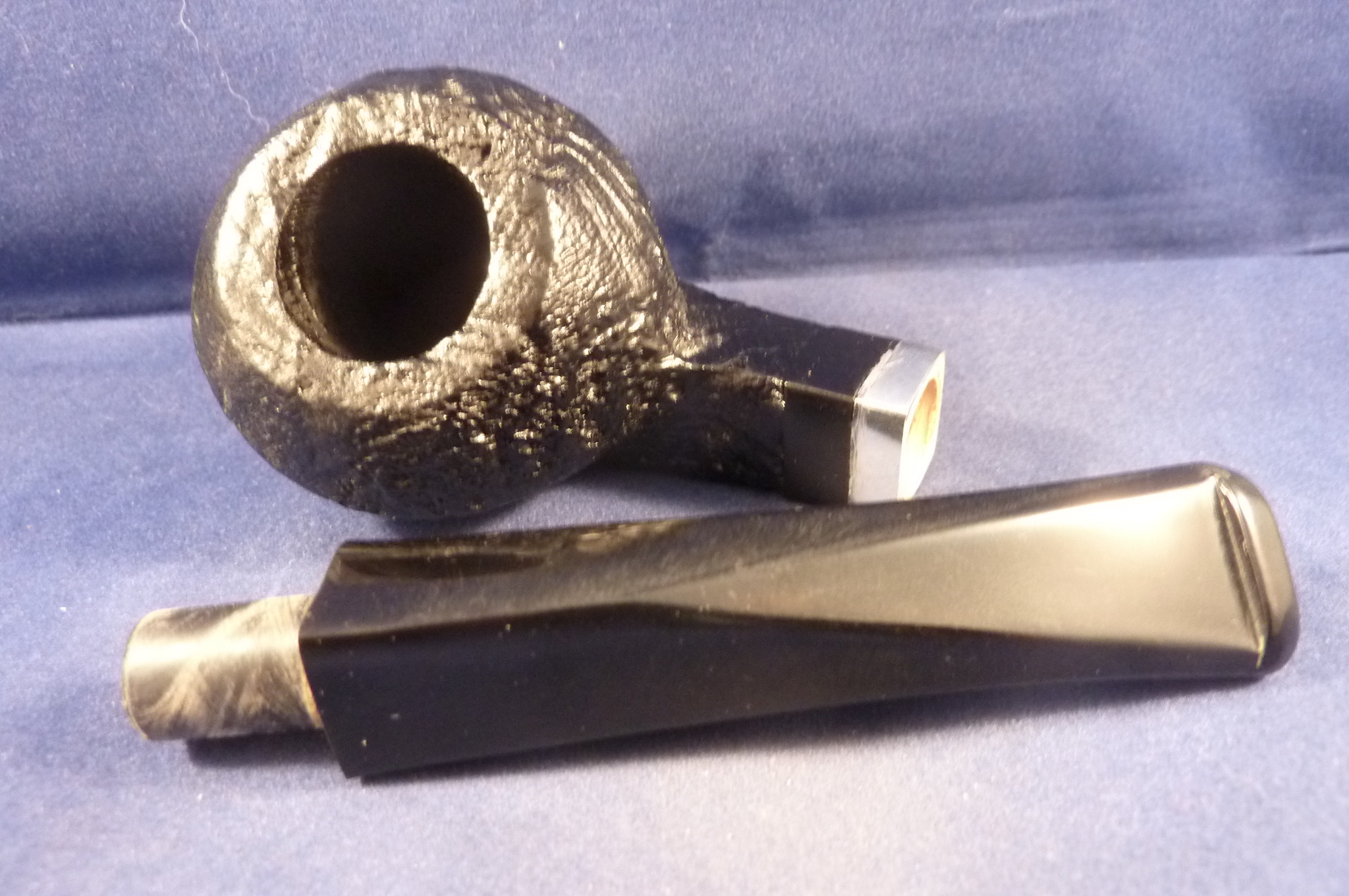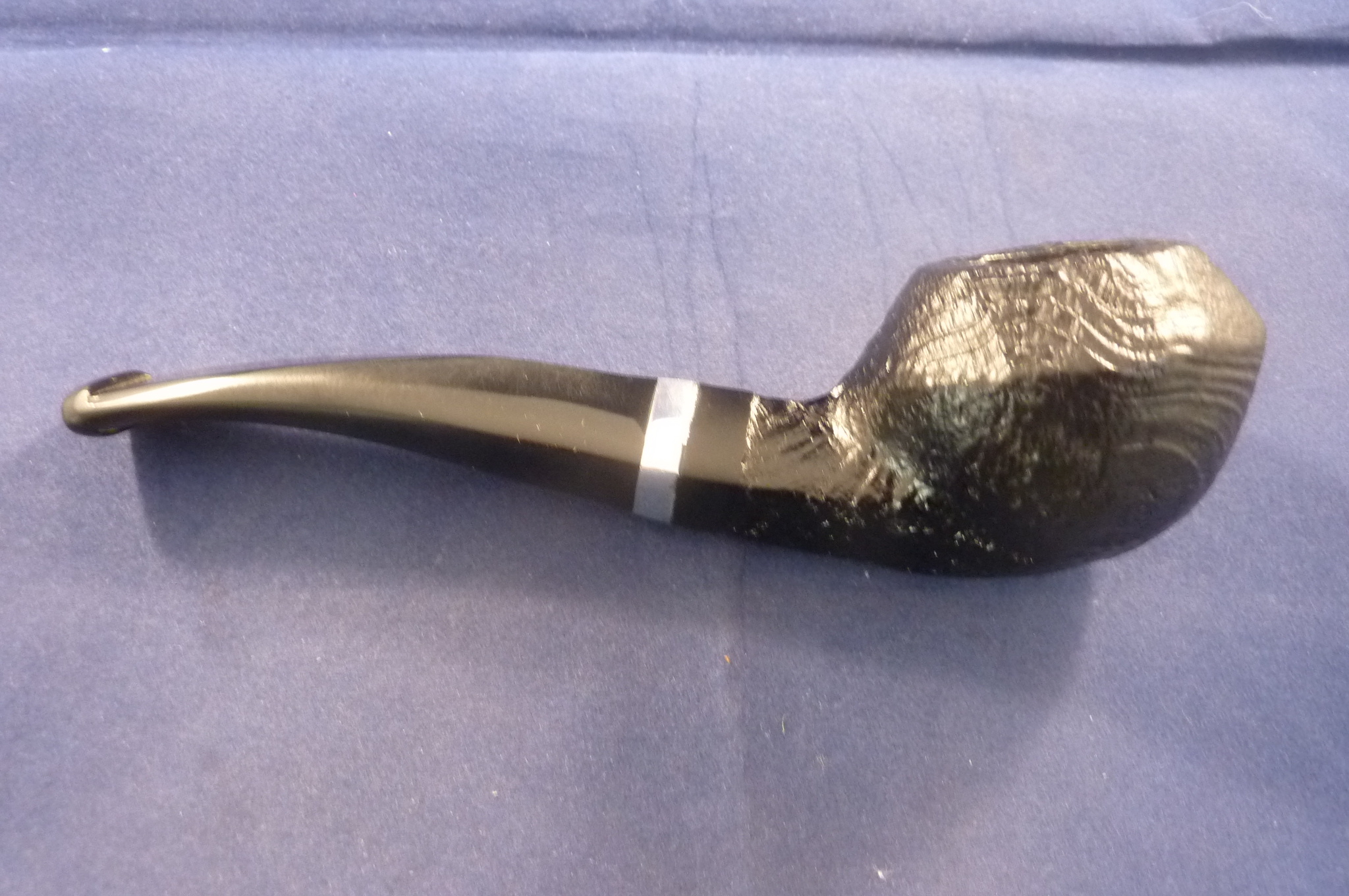 This is a briar pipe in a carved rusicated finish made in Italy for Giordano. Acrylic mouthpiece with a metal ring, 9 mm. filter.