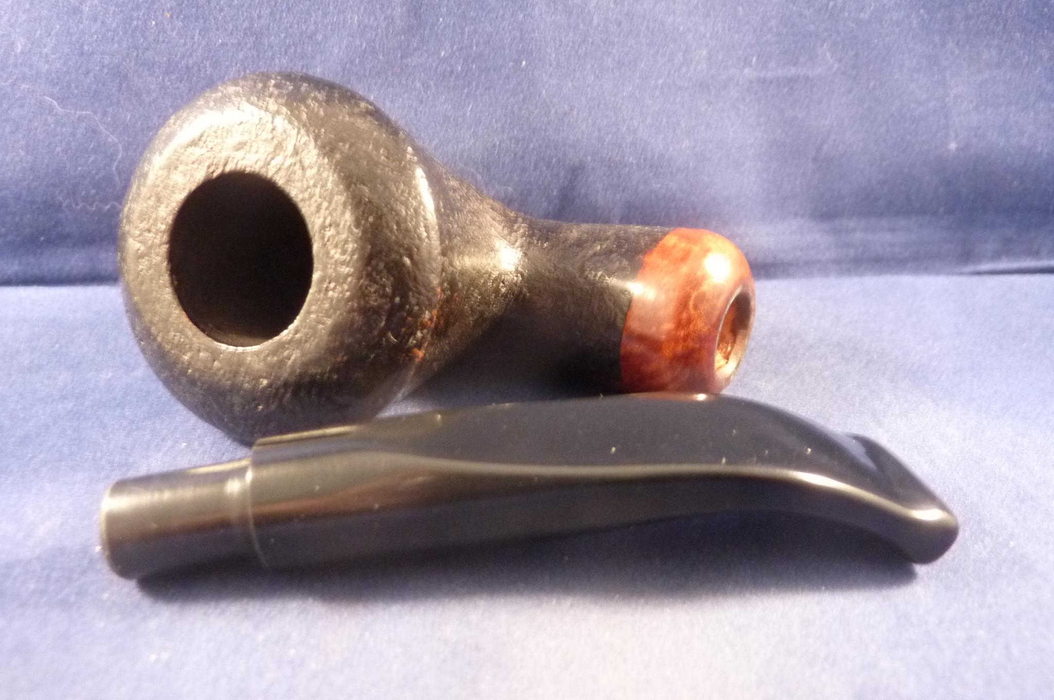This is a briar pipe in a carved rusicated finish made in Italy for Giordano. Acrylic mouthpiece with a metal ring, 9 mm. filter.