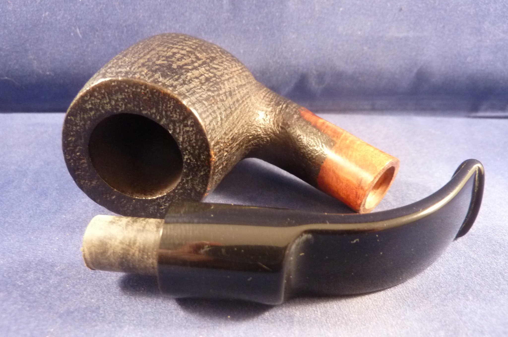 This is a briar pipe in a carved rusicated finish made in Italy for Giordano. Acrylic mouthpiece with a metal ring, 9 mm. filter.