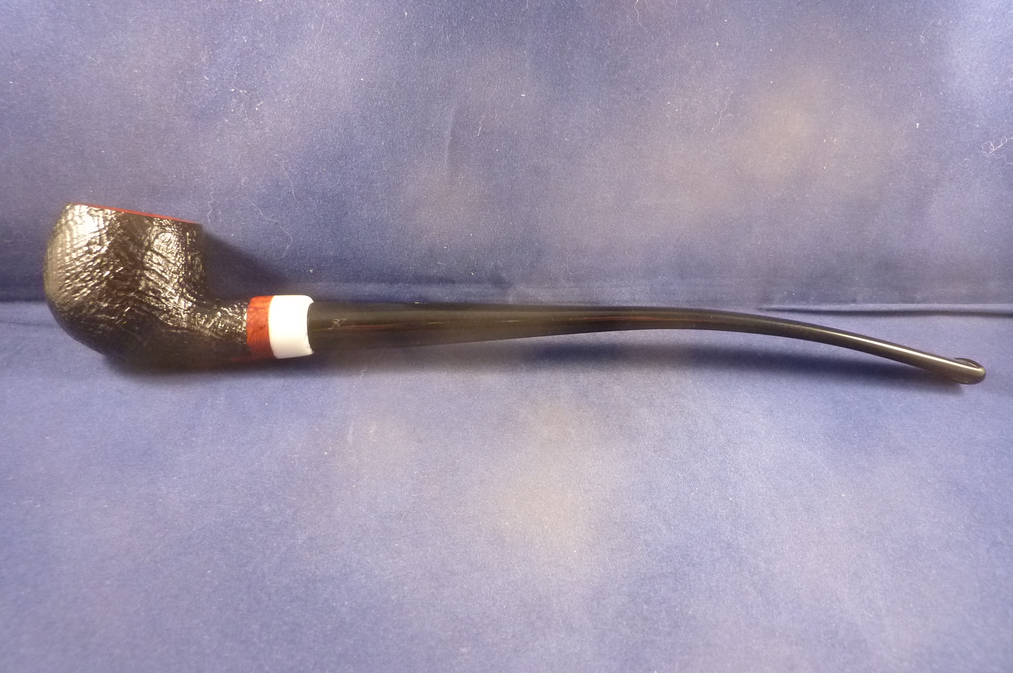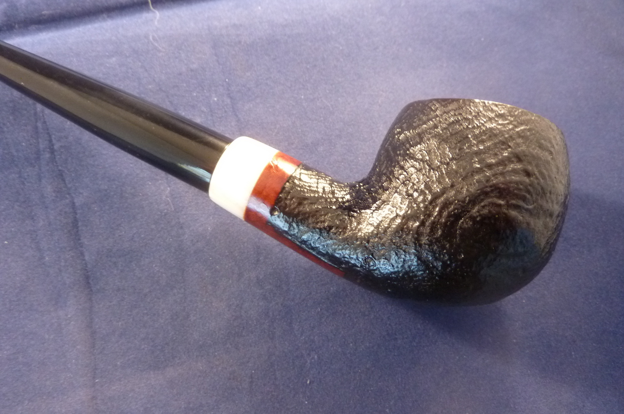 Brushed red briar pipe with a metal ring made for Rattray's. Black acrylic mouthpiece, 9 mm. filter.