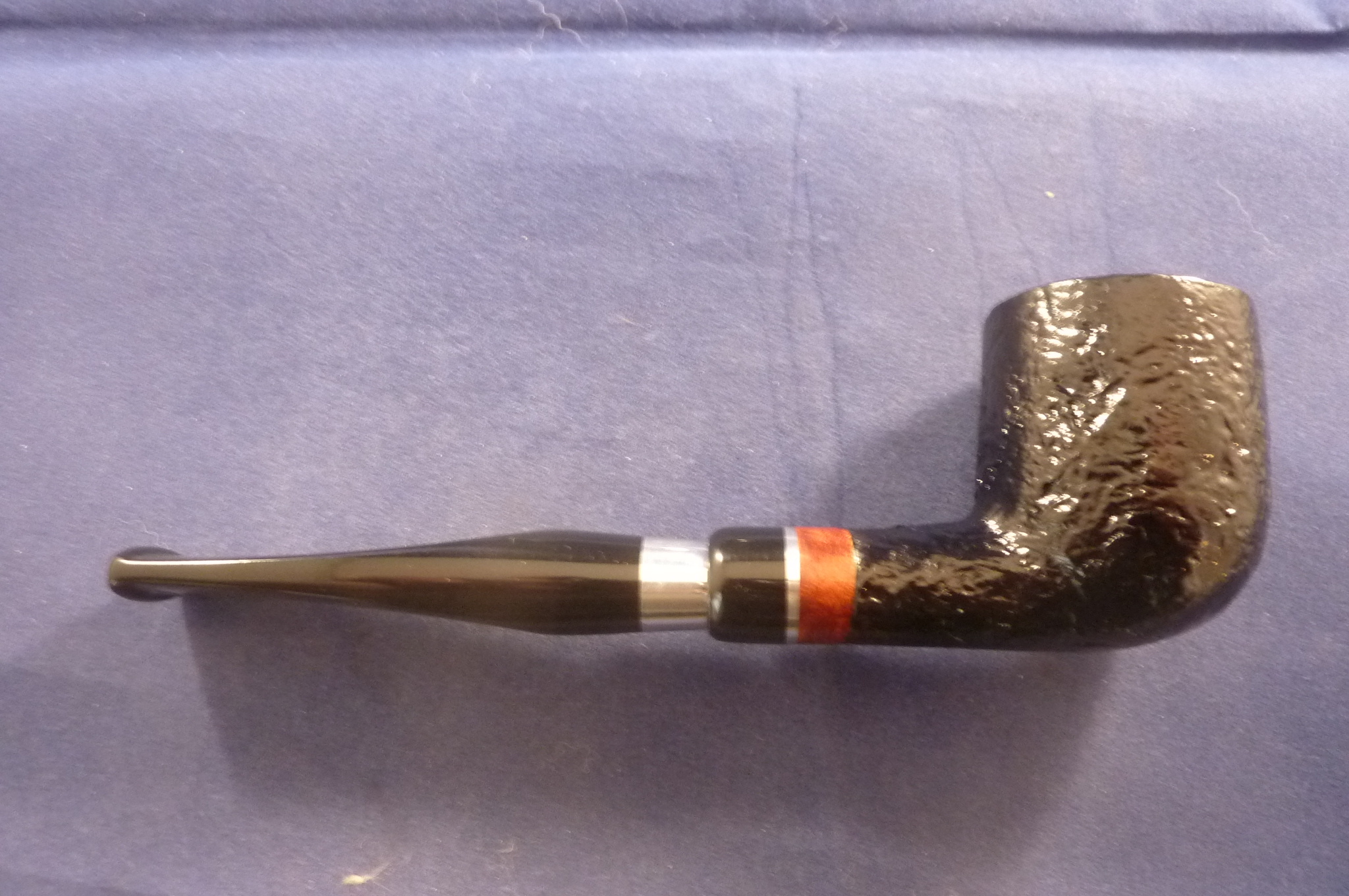 This is a brand new briar pipe made by Aldo Velani in Italy. Acrylic mouthpiece, 9 mm. filter. The metal application on the mouthpiece make the pipe look like a spigot.