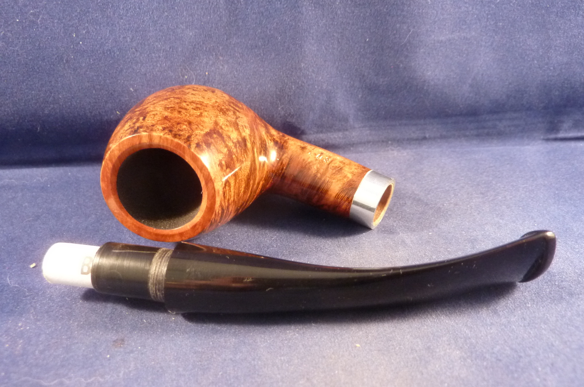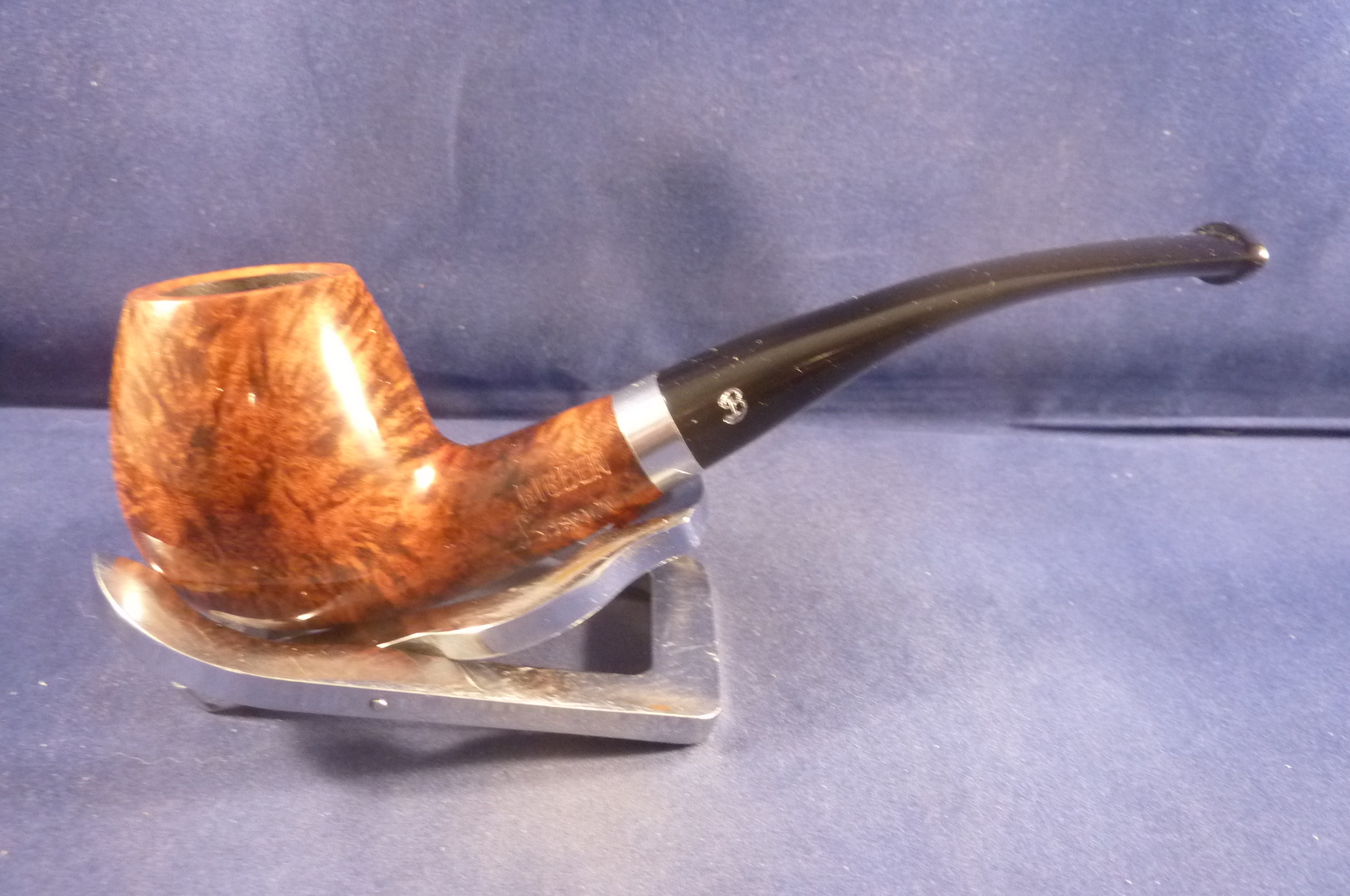 This is a brand new pipe made by L'Anatra in Italy. This Italian pipe has an elegant shape and a light brown finish and a sterling silver ring.