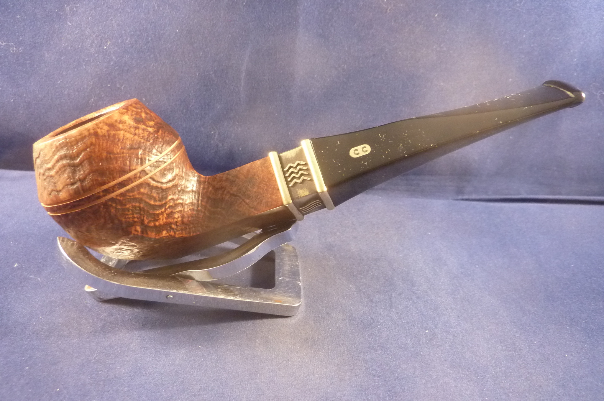 Beautiful briar pipe with a cool ring made in France by Chacom. Acrylic mouthpiece. Made with 9 mm. filters or without with the free adaptor.