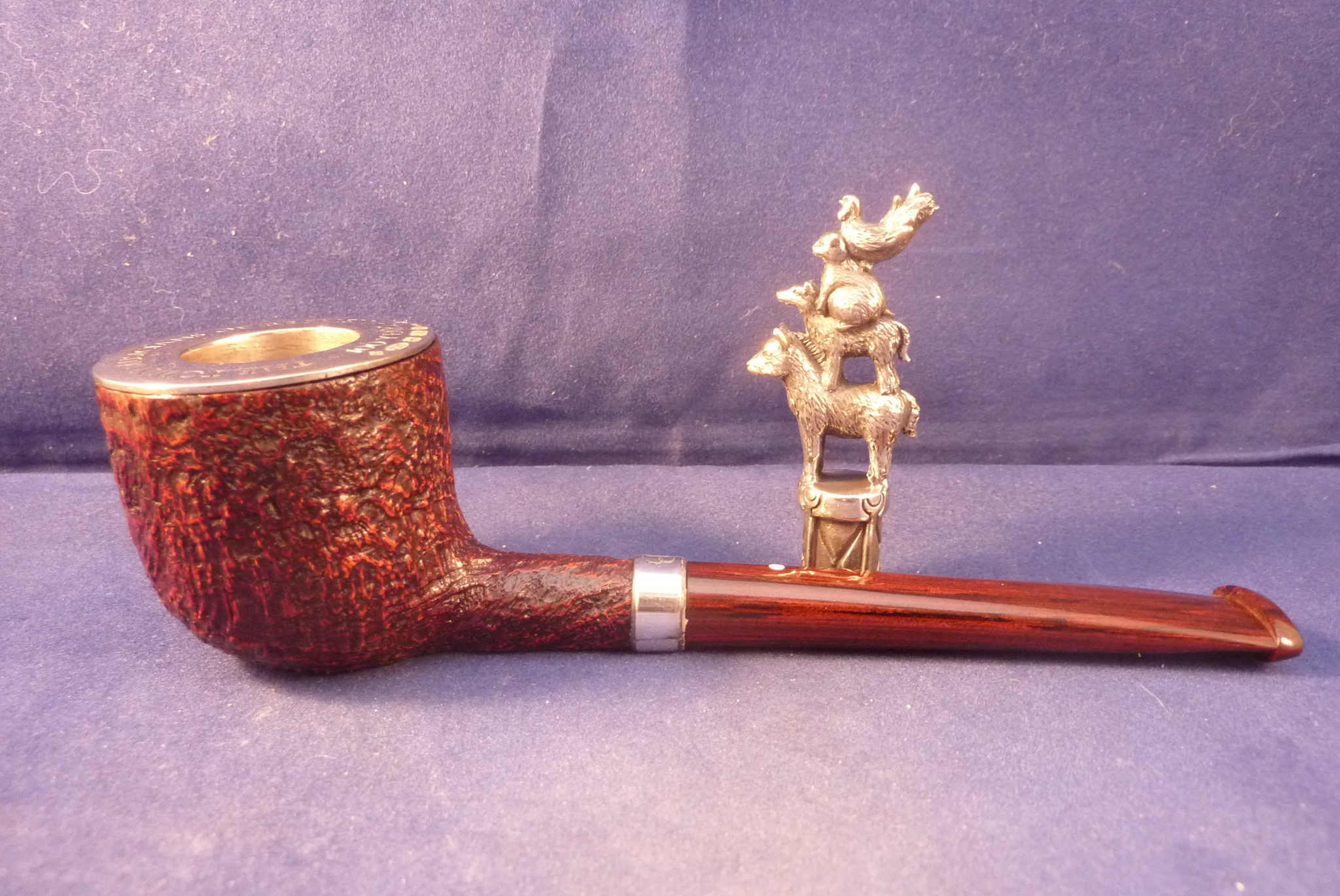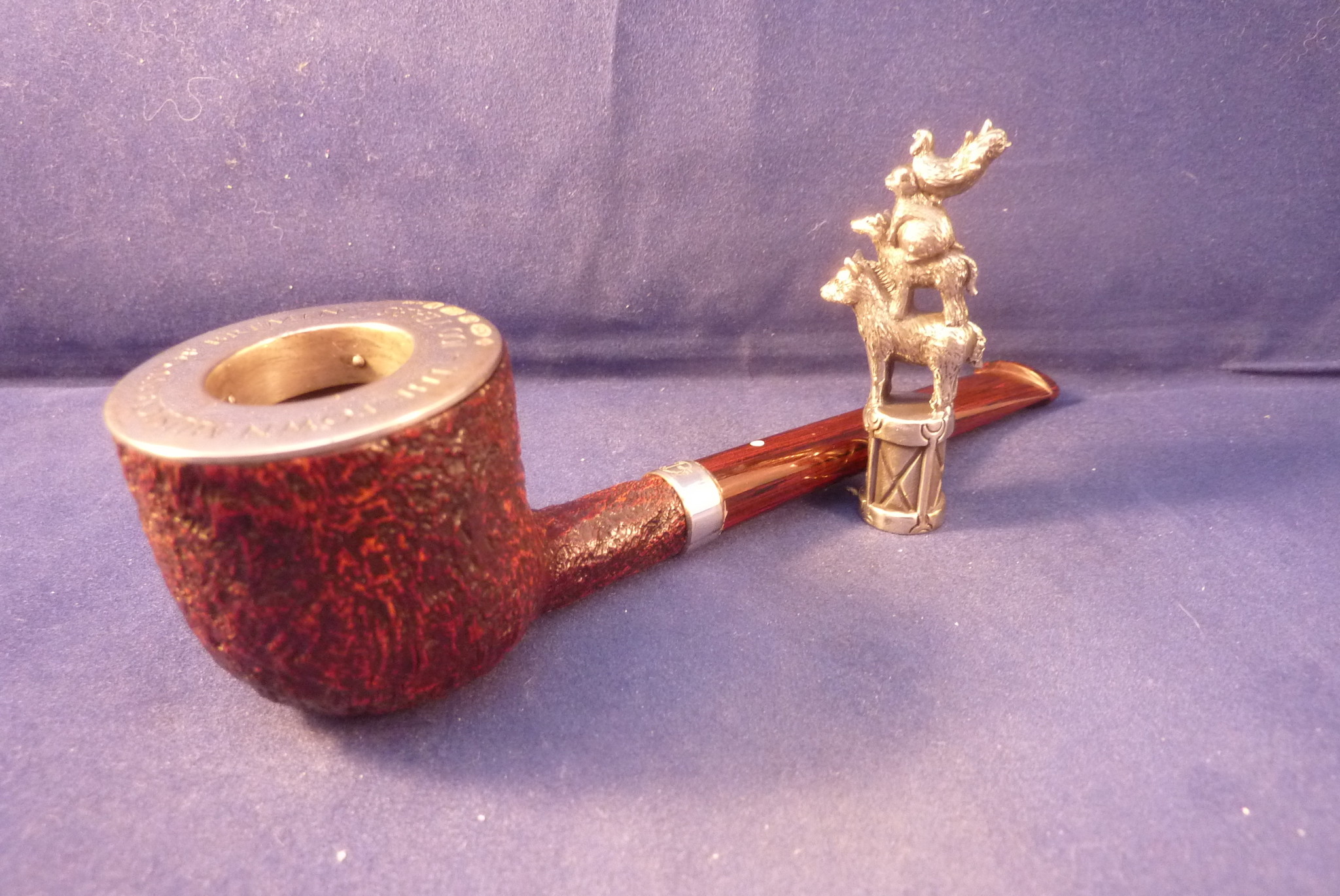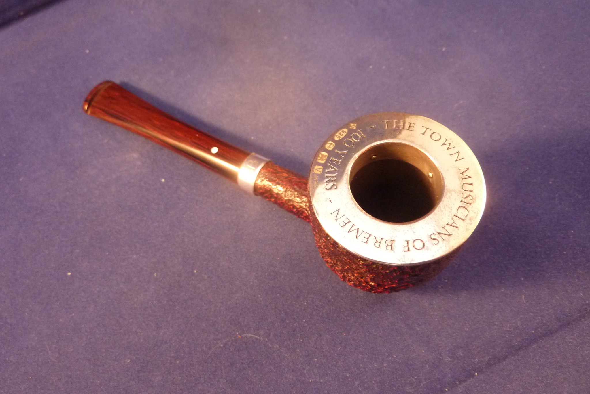 Sandblasted briar pot pipe (3106) with a sterling silver ring, and also a silver ring on top of the bowl made by Dunhill in the UK. Dunhill selects only the best briar. The handmade pipes of Dunhill has a worldwide high grade reputation that they make the best pipes. Cumberland mouthpiece, without filters.