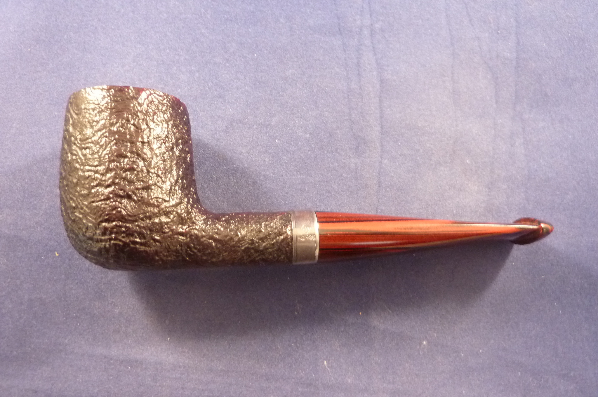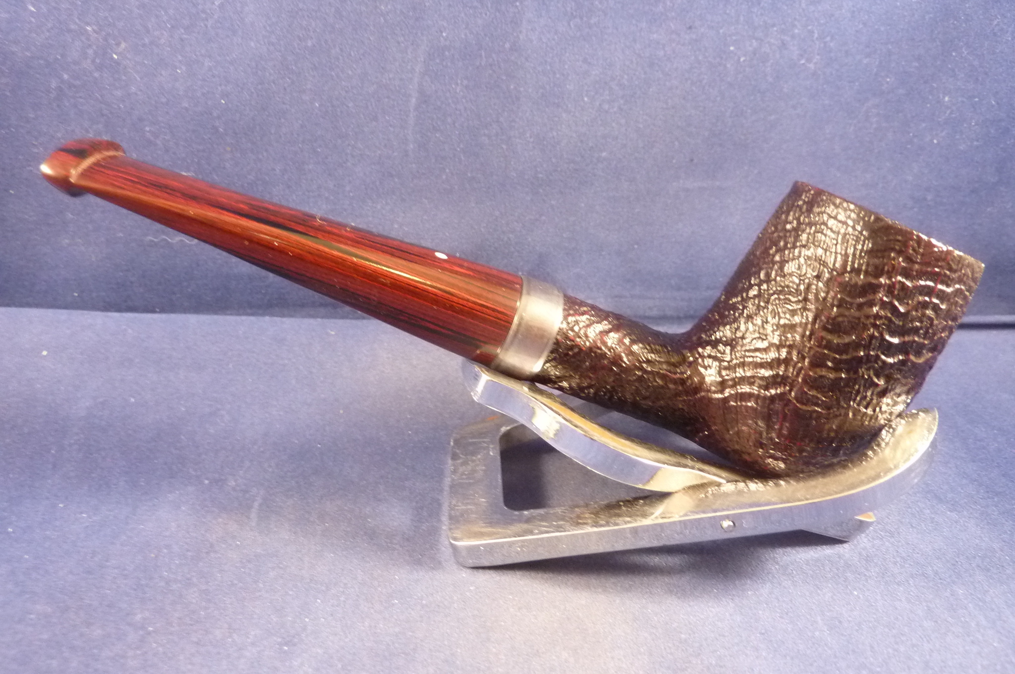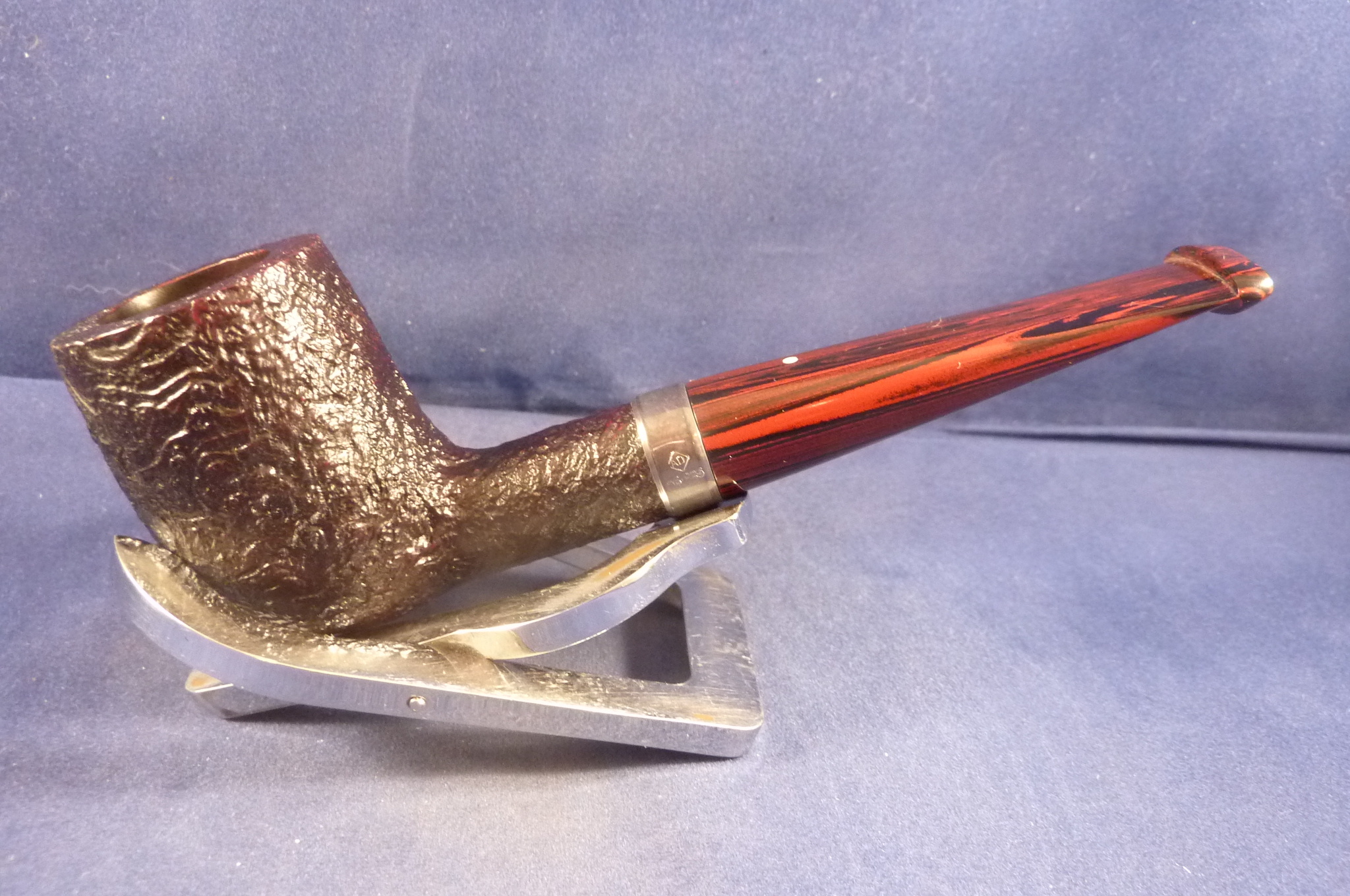 Sandblasted briar pipe made by Dunhill in the UK. Dunhill selects only the best briar. The handmade pipes of Dunhill has a worldwide high grade reputation that they make the best pipes. Special edition with a sterling silver ring and a cumberland mouthpiece, without filters.