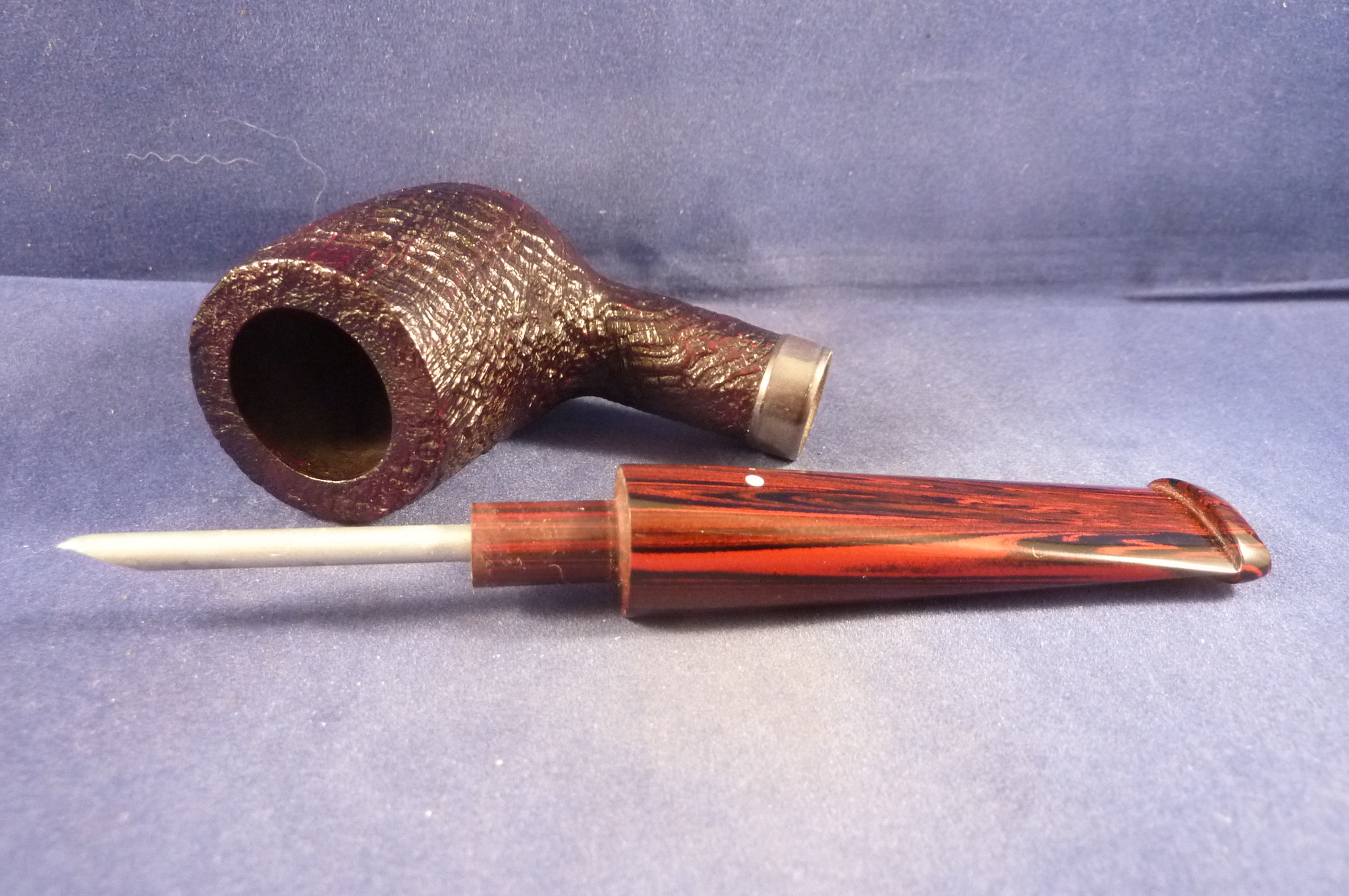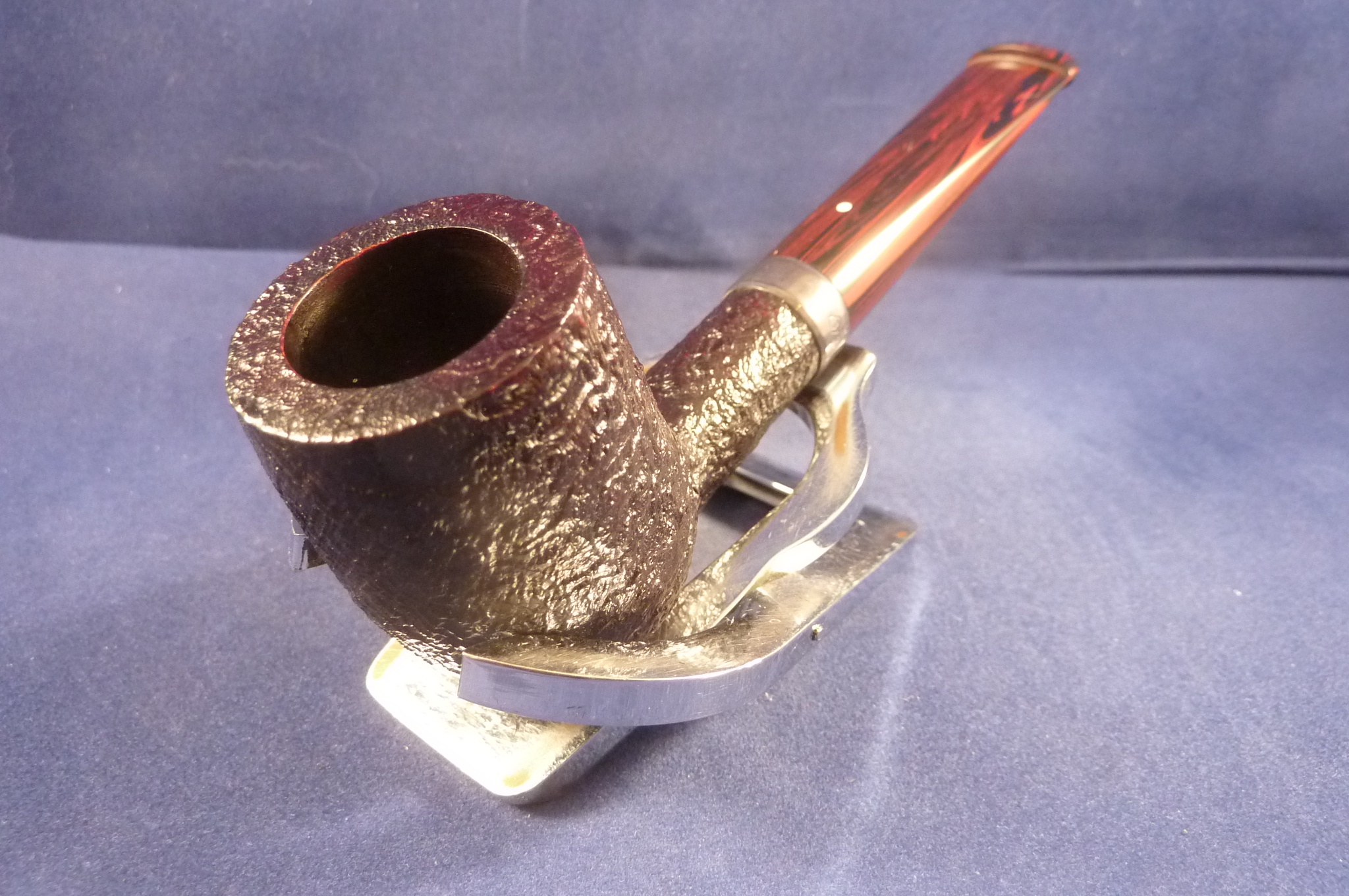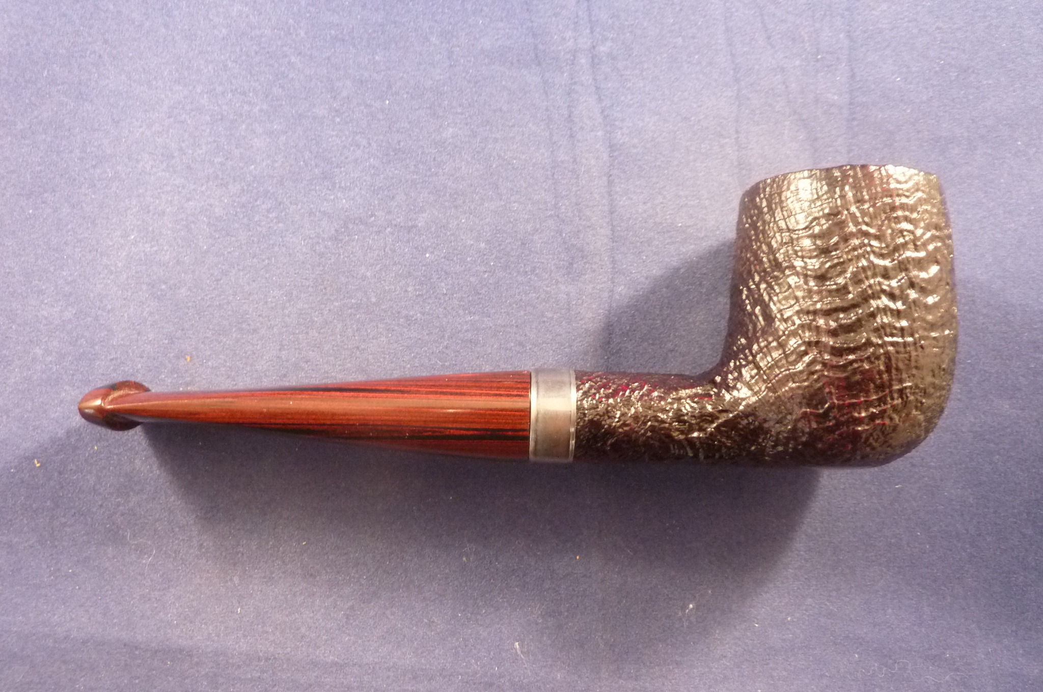 Sandblasted briar pipe made by Dunhill in the UK. Dunhill selects only the best briar. The handmade pipes of Dunhill has a worldwide high grade reputation that they make the best pipes. Special edition with a sterling silver ring and a cumberland mouthpiece, without filters.