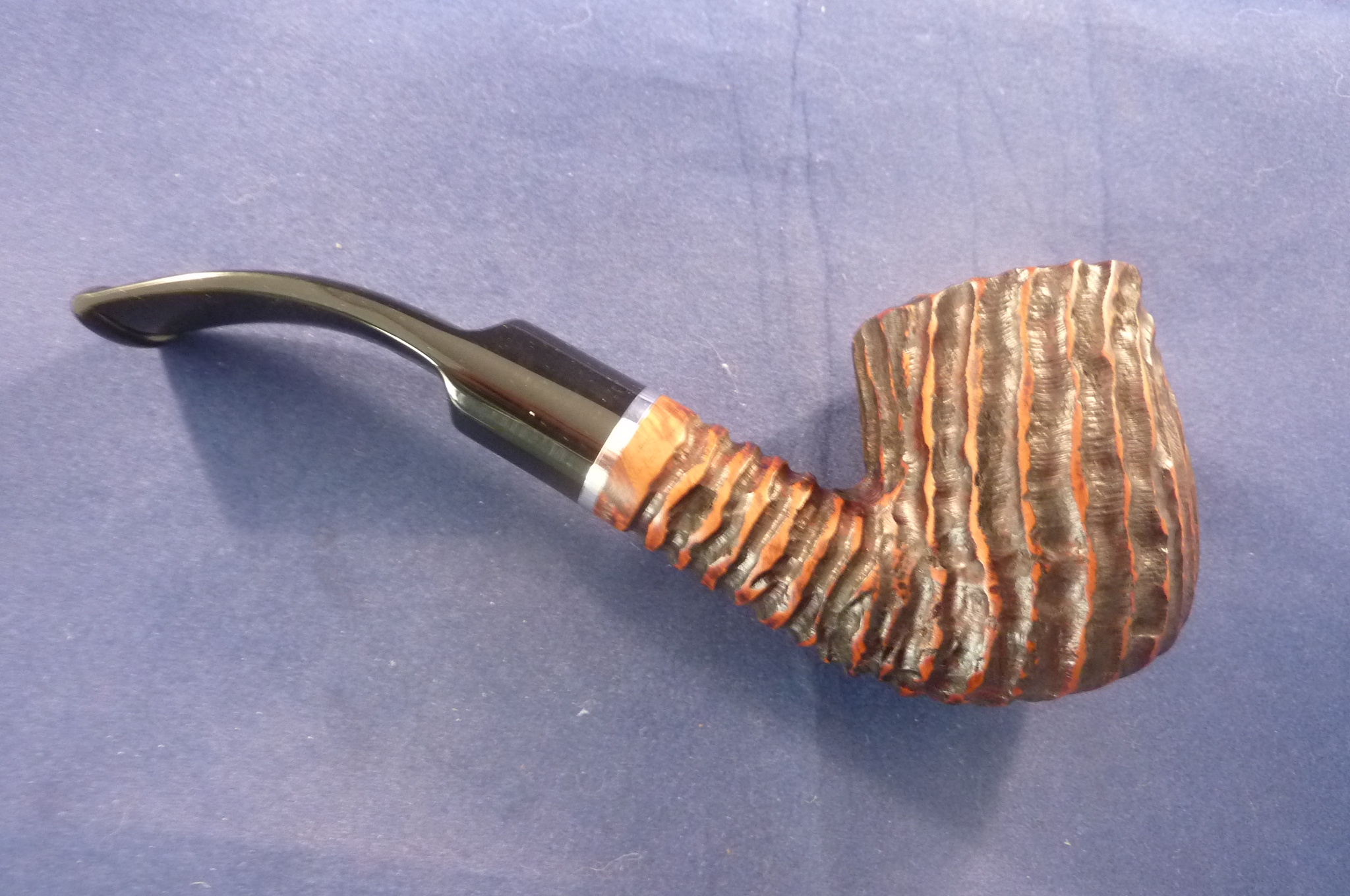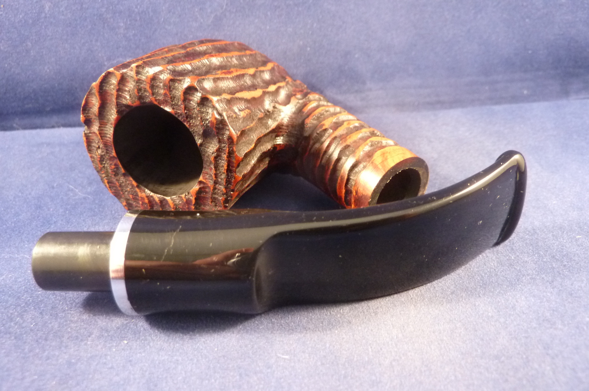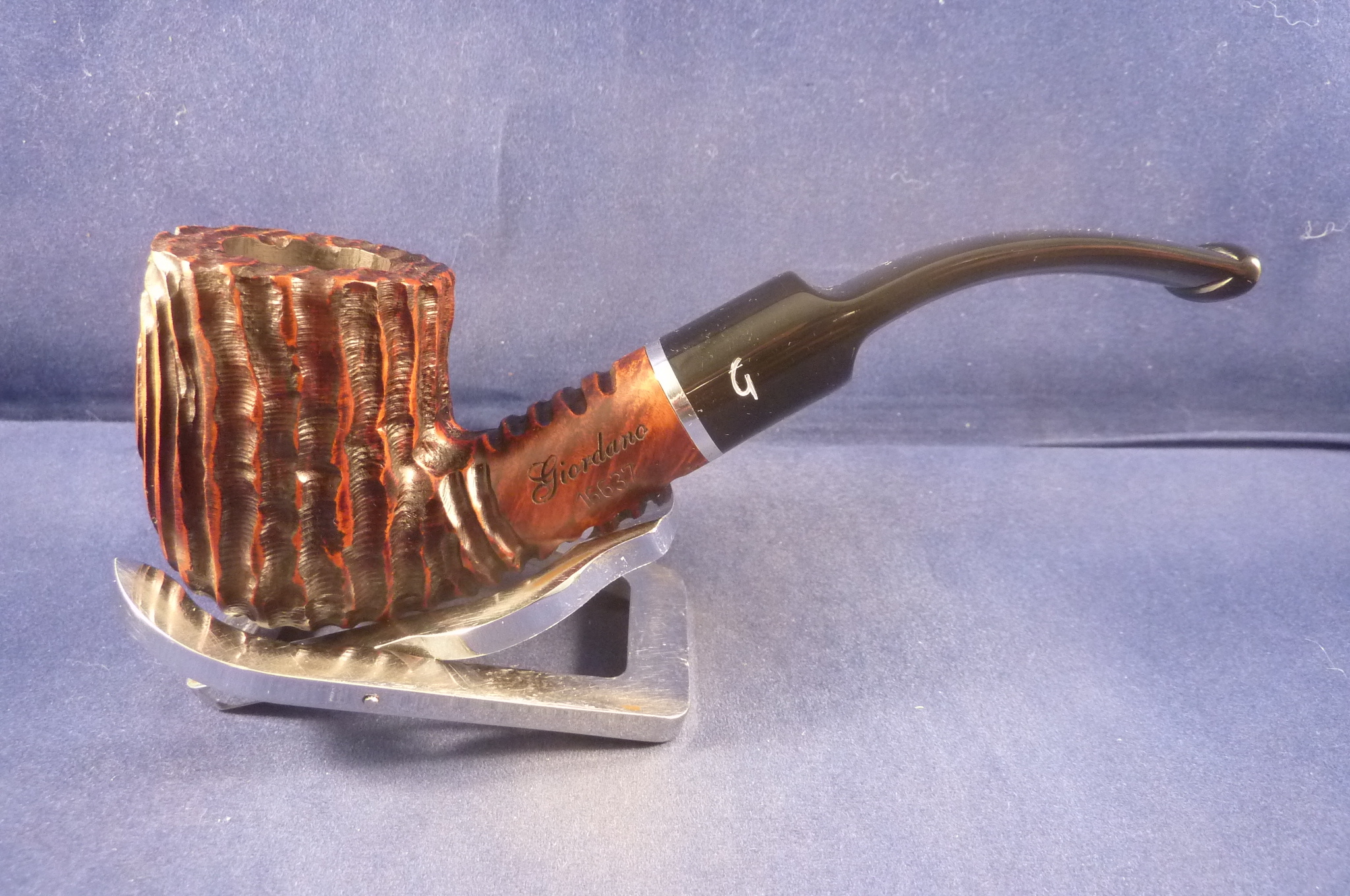 This is a briar pipe in a carved rusicated finish made in Italy for Giordano. Acrylic mouthpiece with a metal ring, 9 mm. filter.