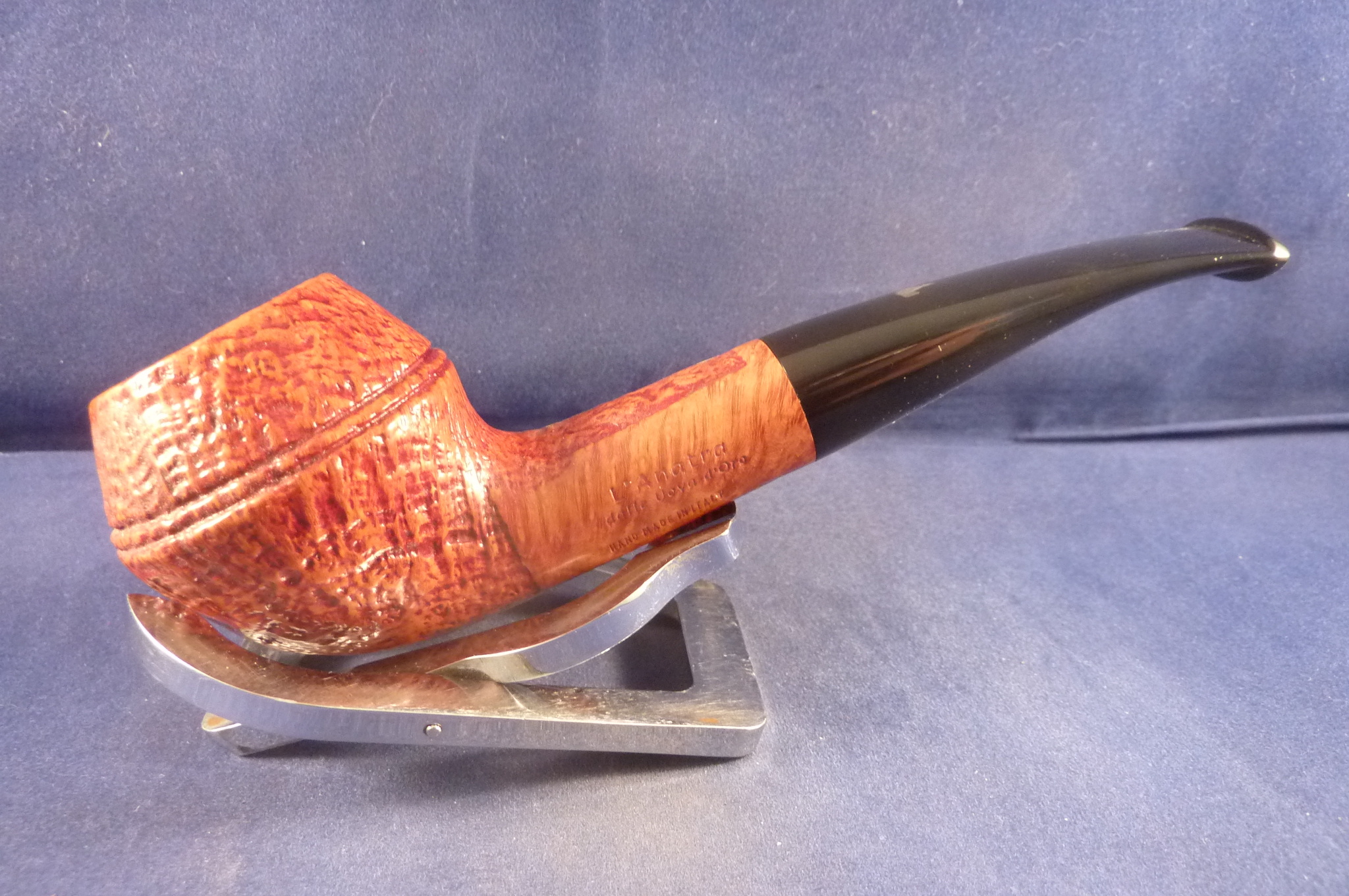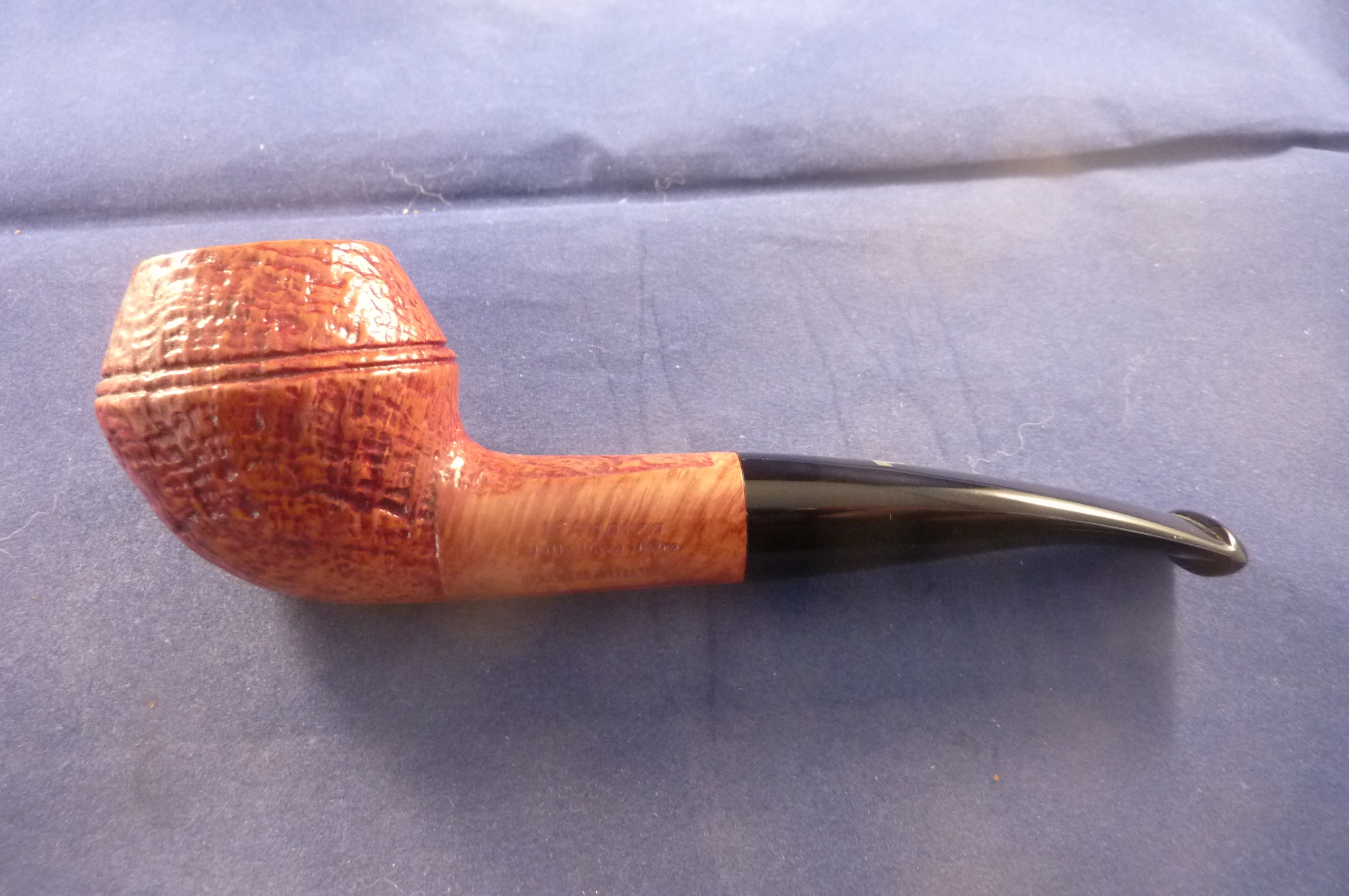 This is a brand new pipe made by L'Anatra in Italy. This Italian pipe has really great colours and has been beautiful sandblasted. Acrylic mouthpiece, with 9 mm. filter.