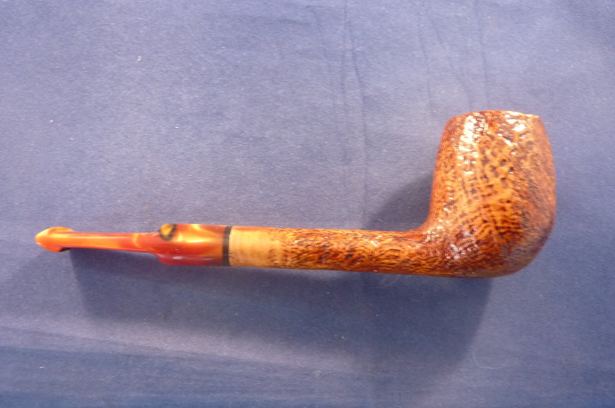 This is a brand new pipe made in Italy. This sandblasted briar pipe has an acrylic mouthpiece, without filter.