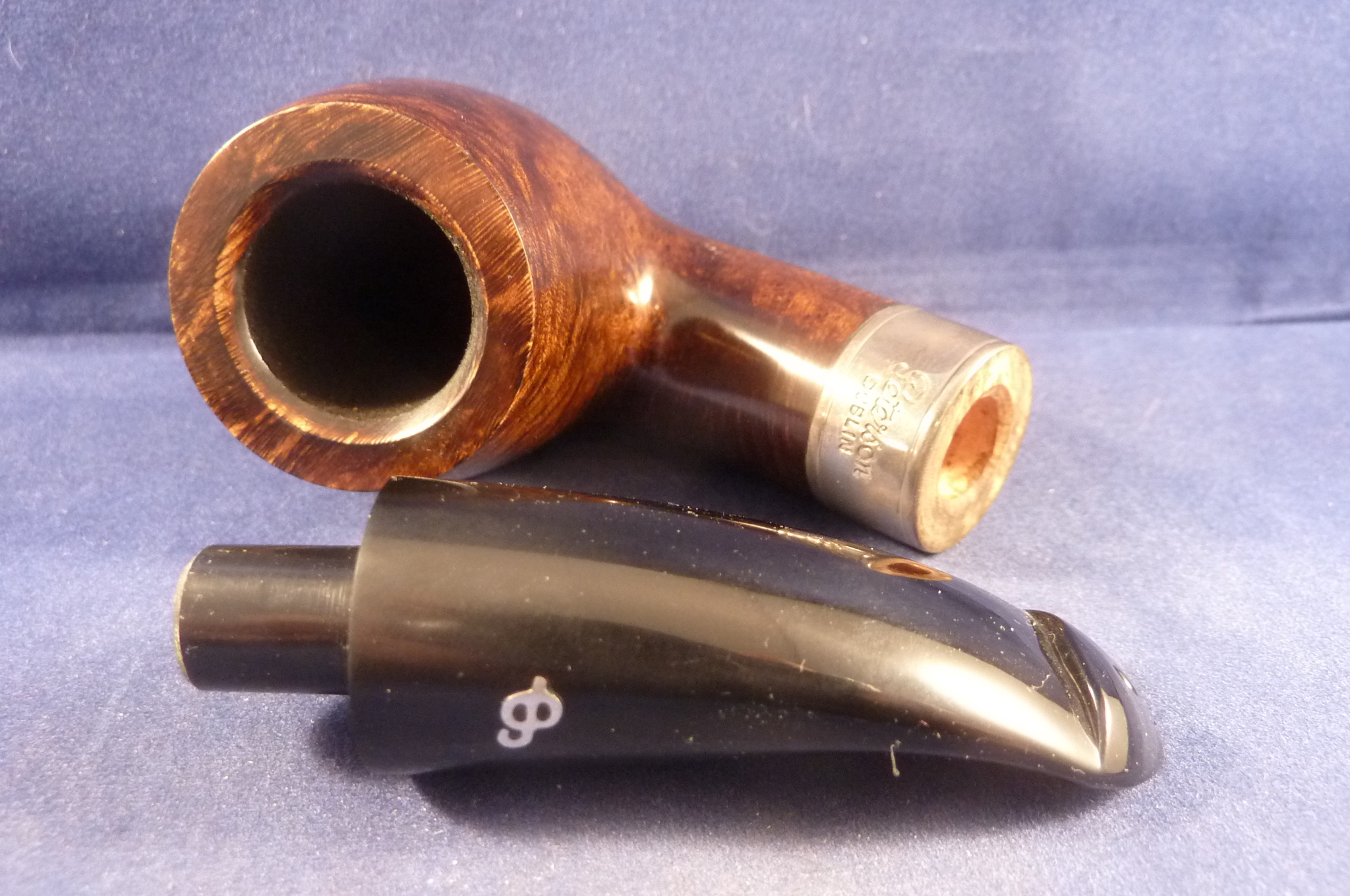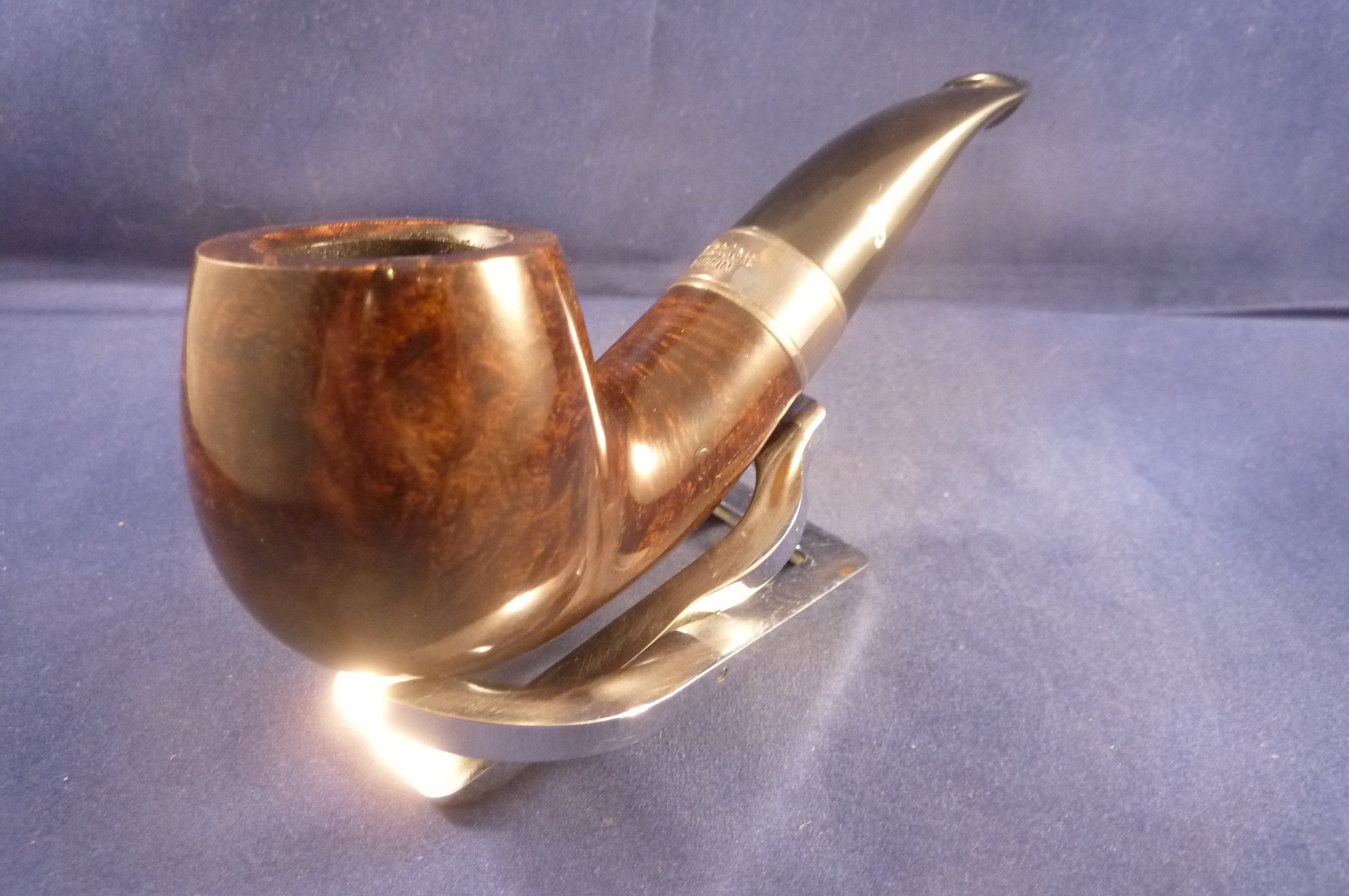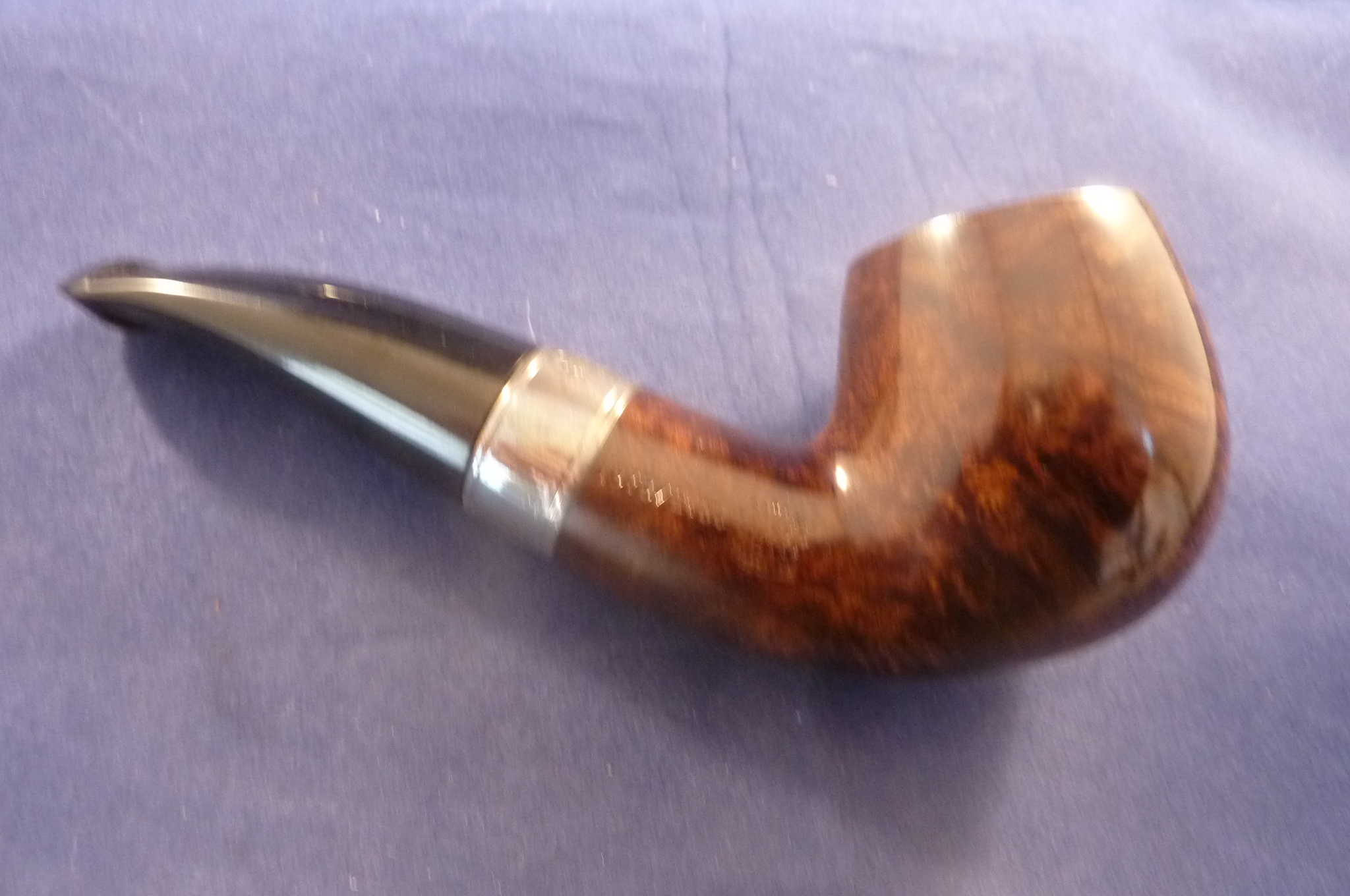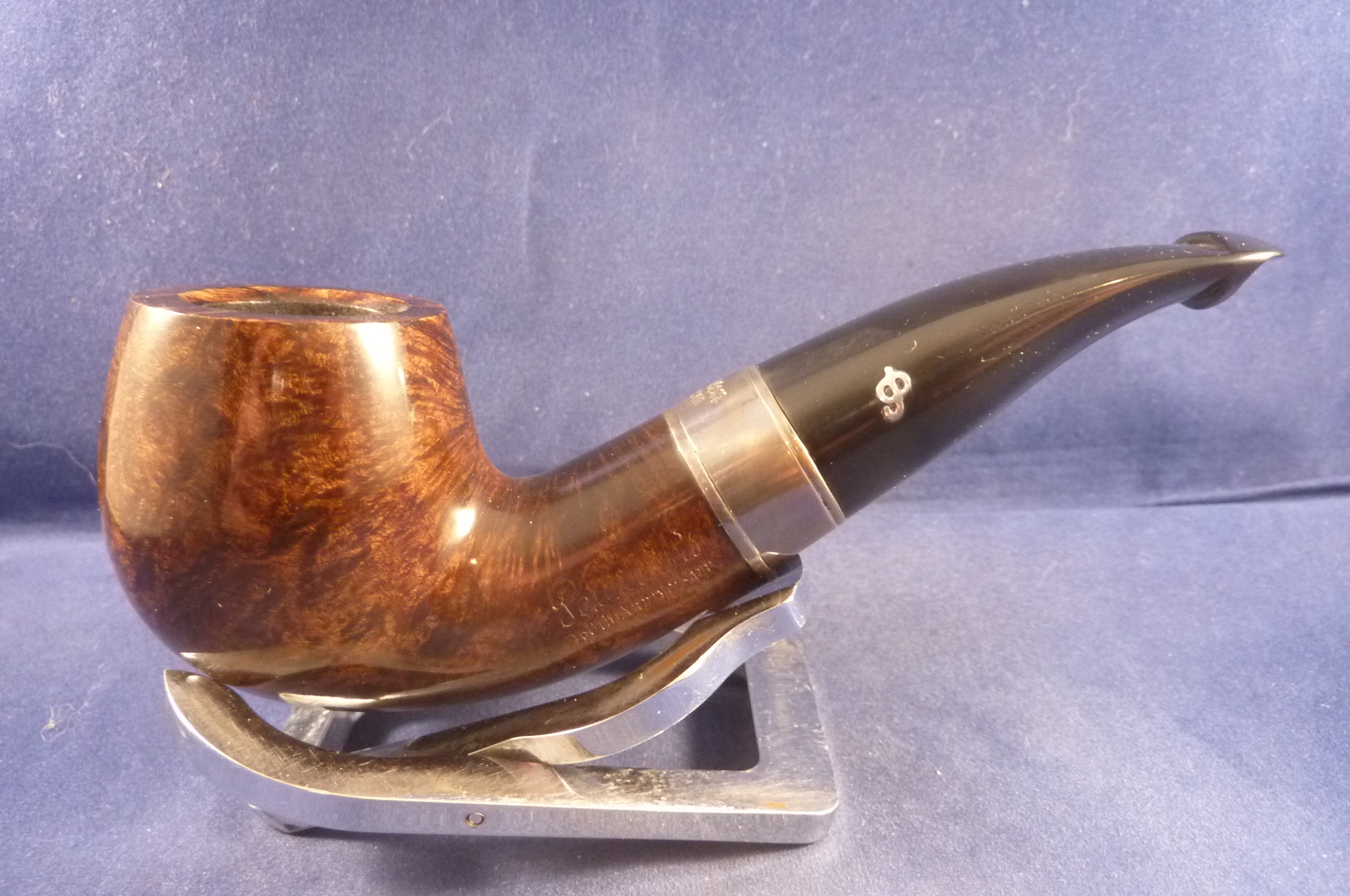 Beautiful briar pipe made by Peterson in Ireland. Sterling silver band. P-Lip mouthpiece, with 9 mm. filter.