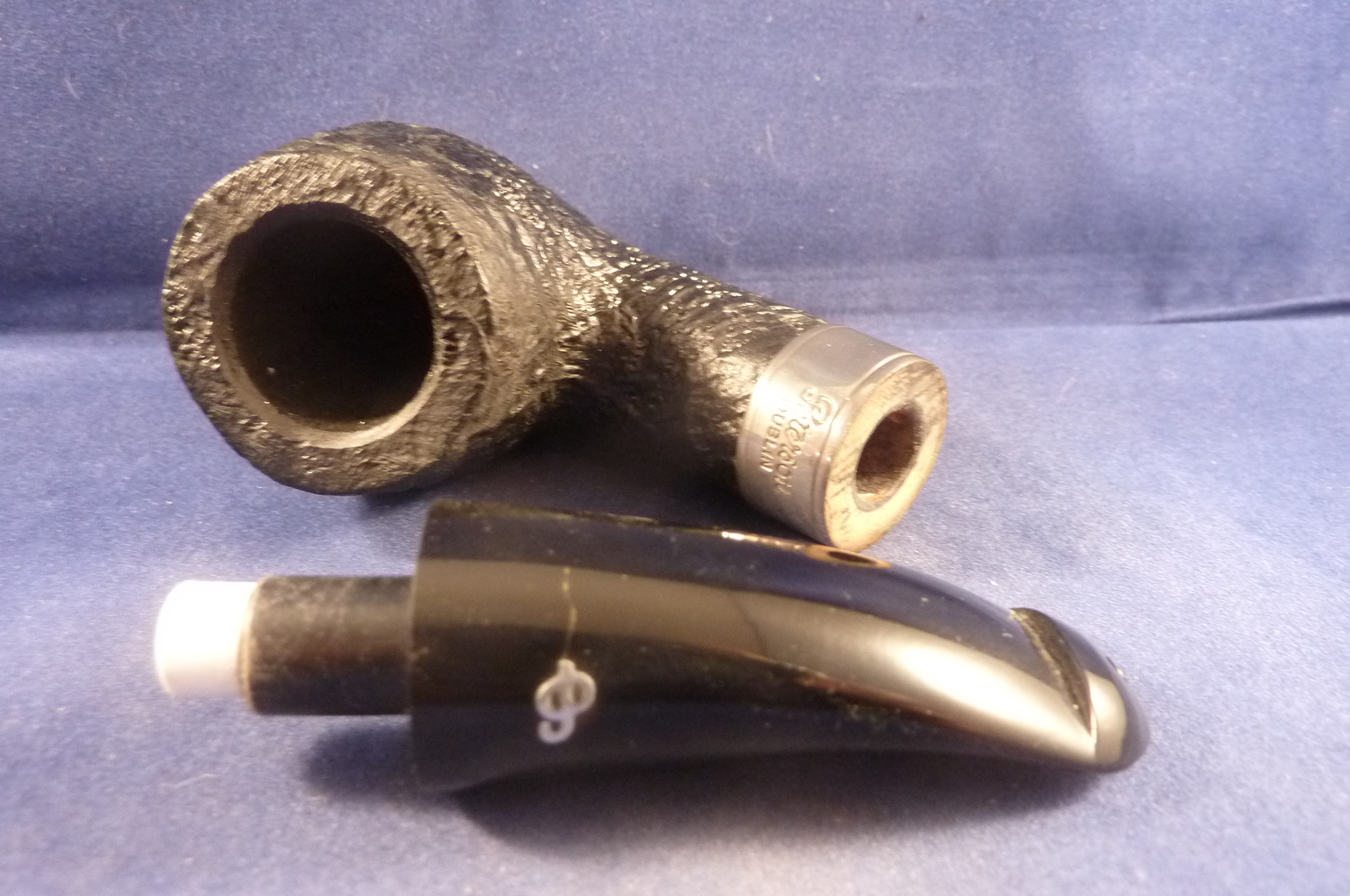 Beautiful briar pipe made by Peterson in Ireland. Sterling silver band. P-Lip mouthpiece, with 9 mm. filter.