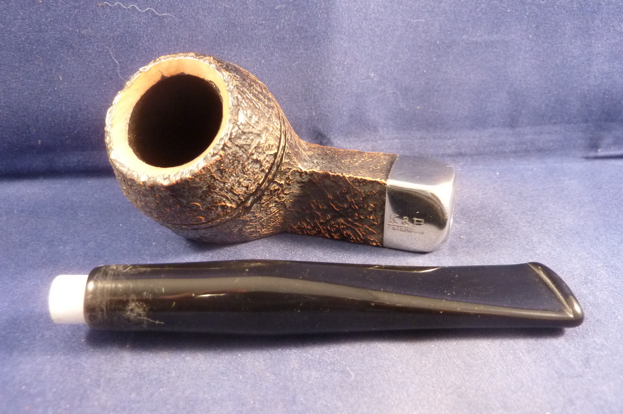Sandblasted brown briar pipe with a nickel mount, made by Peterson in Ireland. The pipe has a black acrylic mouthpiece (fishtail), with 9 mm. filter.