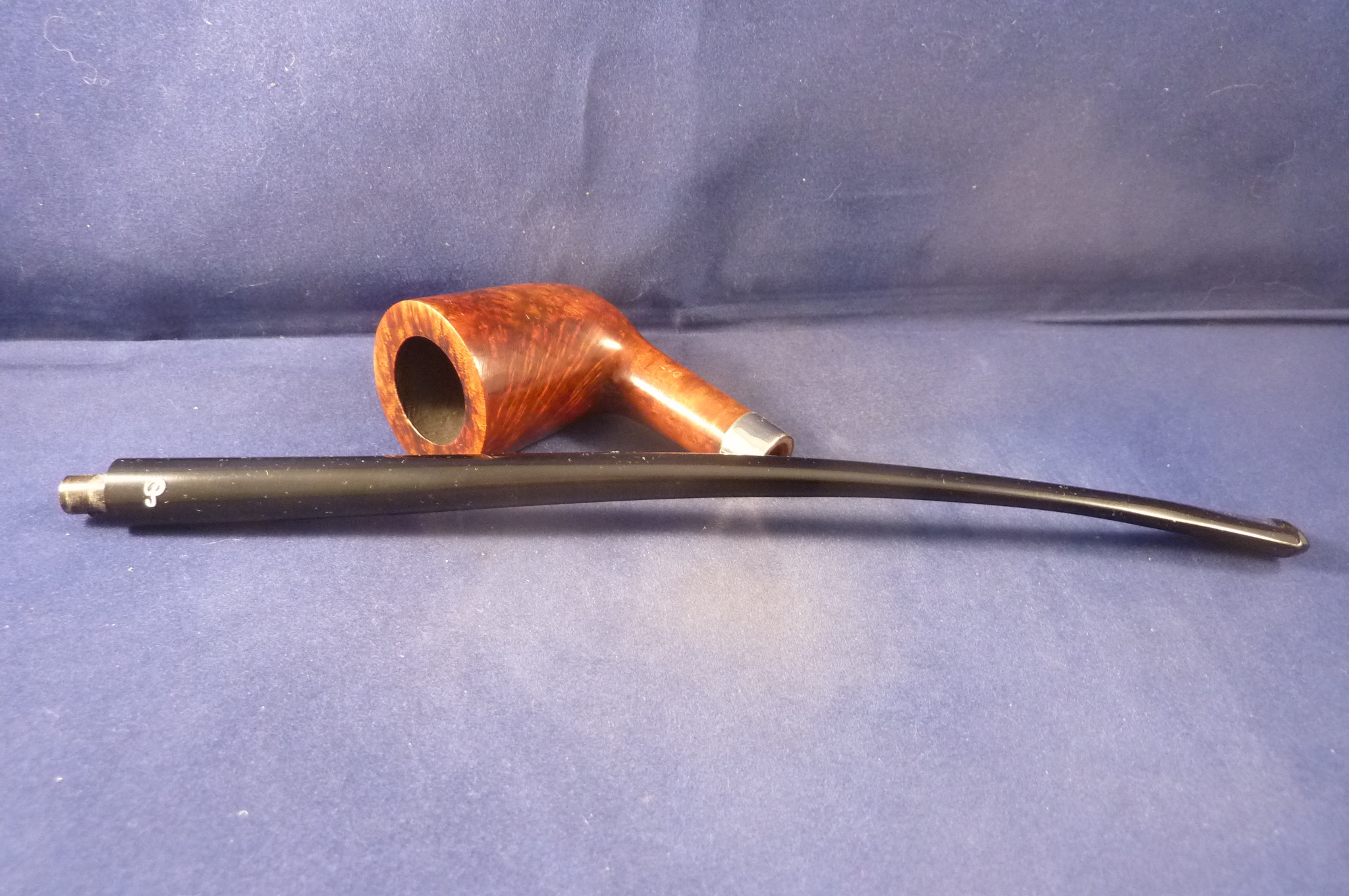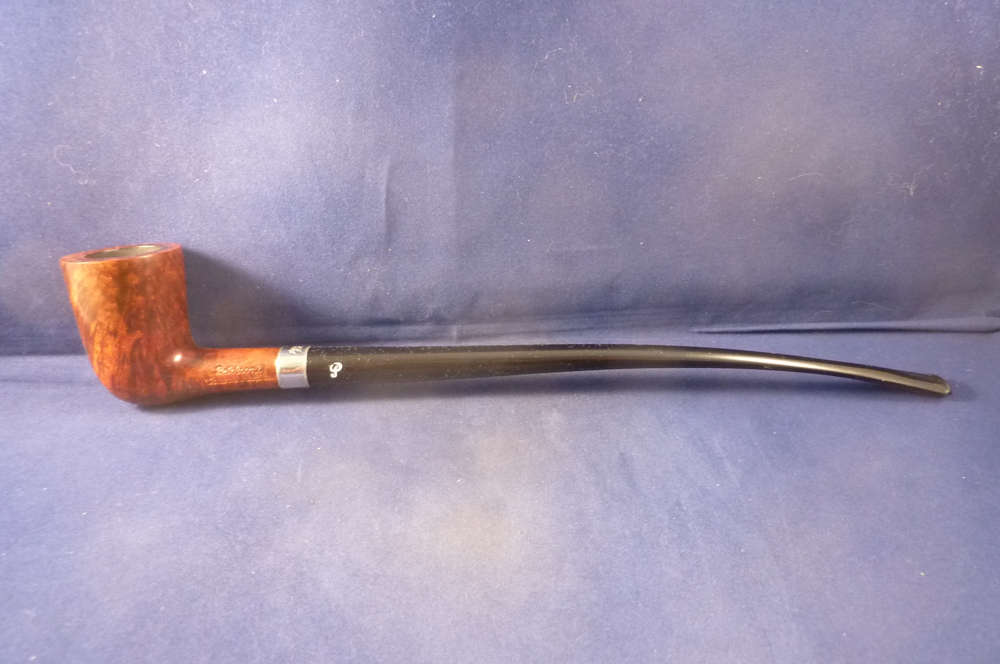 Long churchwarden pipe made of briar, made by Peterson in Ireland. Black fishtail mouthpiece, without filter.
