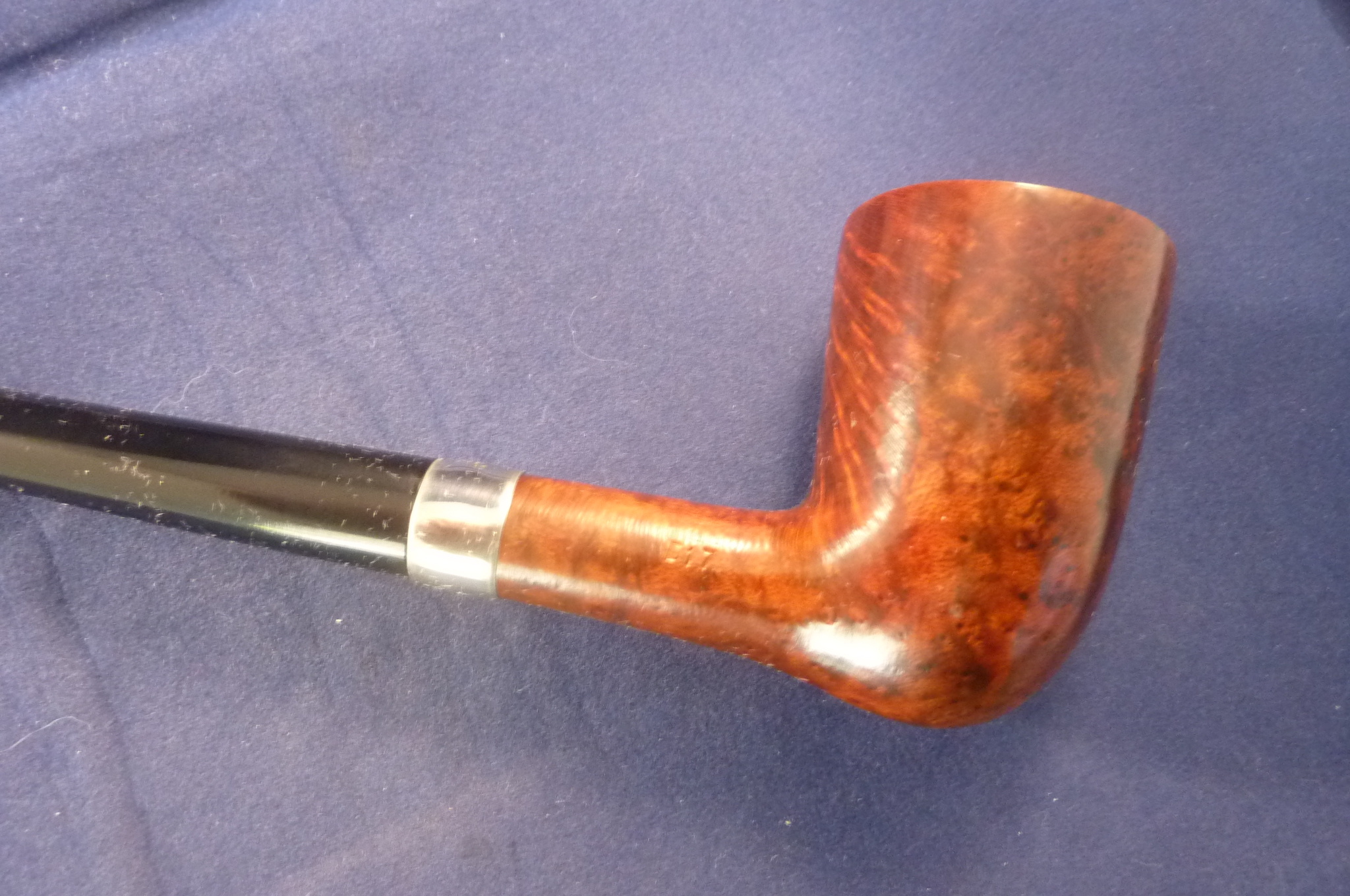 Smooth perfect briar pipe with a sterling silver ring and beautiful grains made by Stanwell in Denmark. Black mouthpiece, without filter.