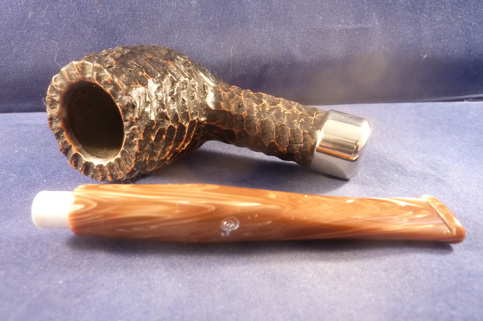 Beautiful briar pipe in a rusticated finish with a nickel mount, made by Peterson in Ireland. The pipe has a black fishtail mouthpiece, without filter.