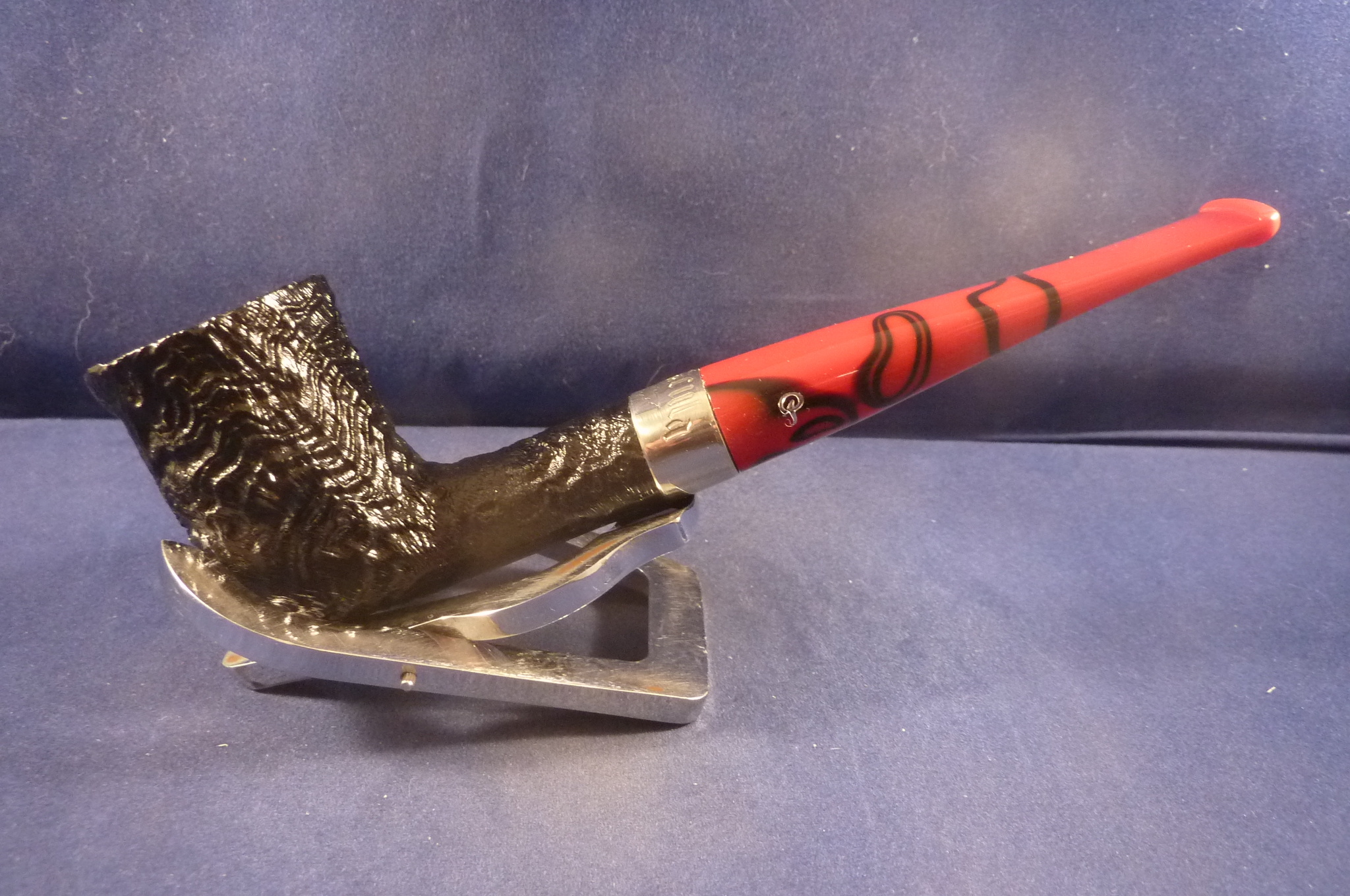 Black briar pipe with a metal ring made by Peterson in Ireland. Red acrylic mouthpiece, with 9 mm. filter.