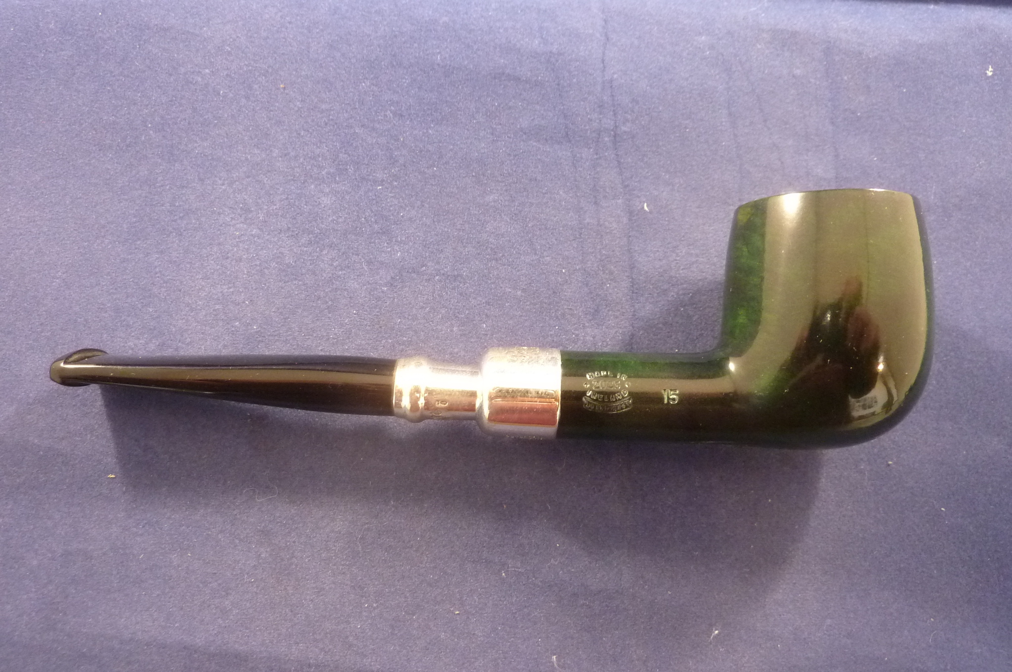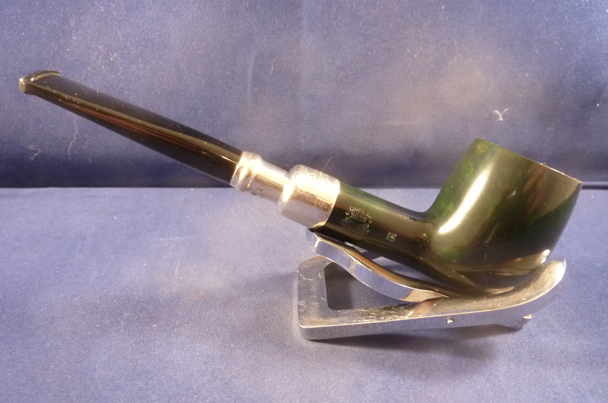 The Peterson tradition has long been associated with the fine sterling silver detail of our pipes. The Peterson Spigot is characterised by a sterling silver covering on the tapered end of the mouthpiece which compliments the sterling silver band of the pipe. The Spigot style evolved from the practice of soldiers in earlier centuries who repaired broken pipes by sliding a used cartridge case over the shank and reinserting the mouthpiece. In this unique spigot finished pipe, Peterson craftsmanship perfect the union of finest quality briar and precious metals. The silver is spun to shape and then fitted to the pipe. The craftsmanship, created with only a lathe and chisel as basic tools, is the finest in the industry. Normally fitted with fishtail mouthpiece.