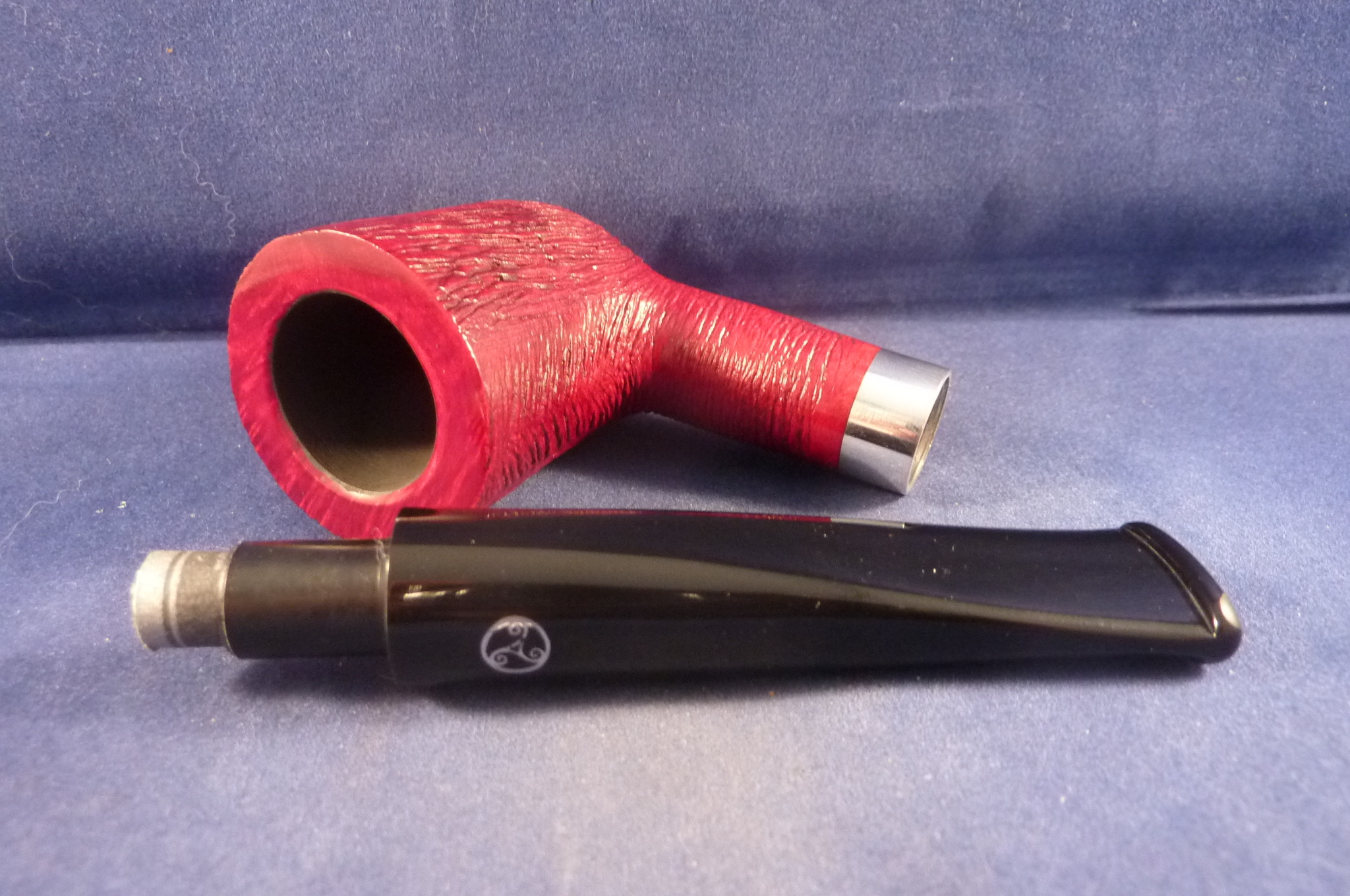 Brushed red briar pipe with a metal ring made for Rattray's. Black acrylic mouthpiece, 9 mm. filter.