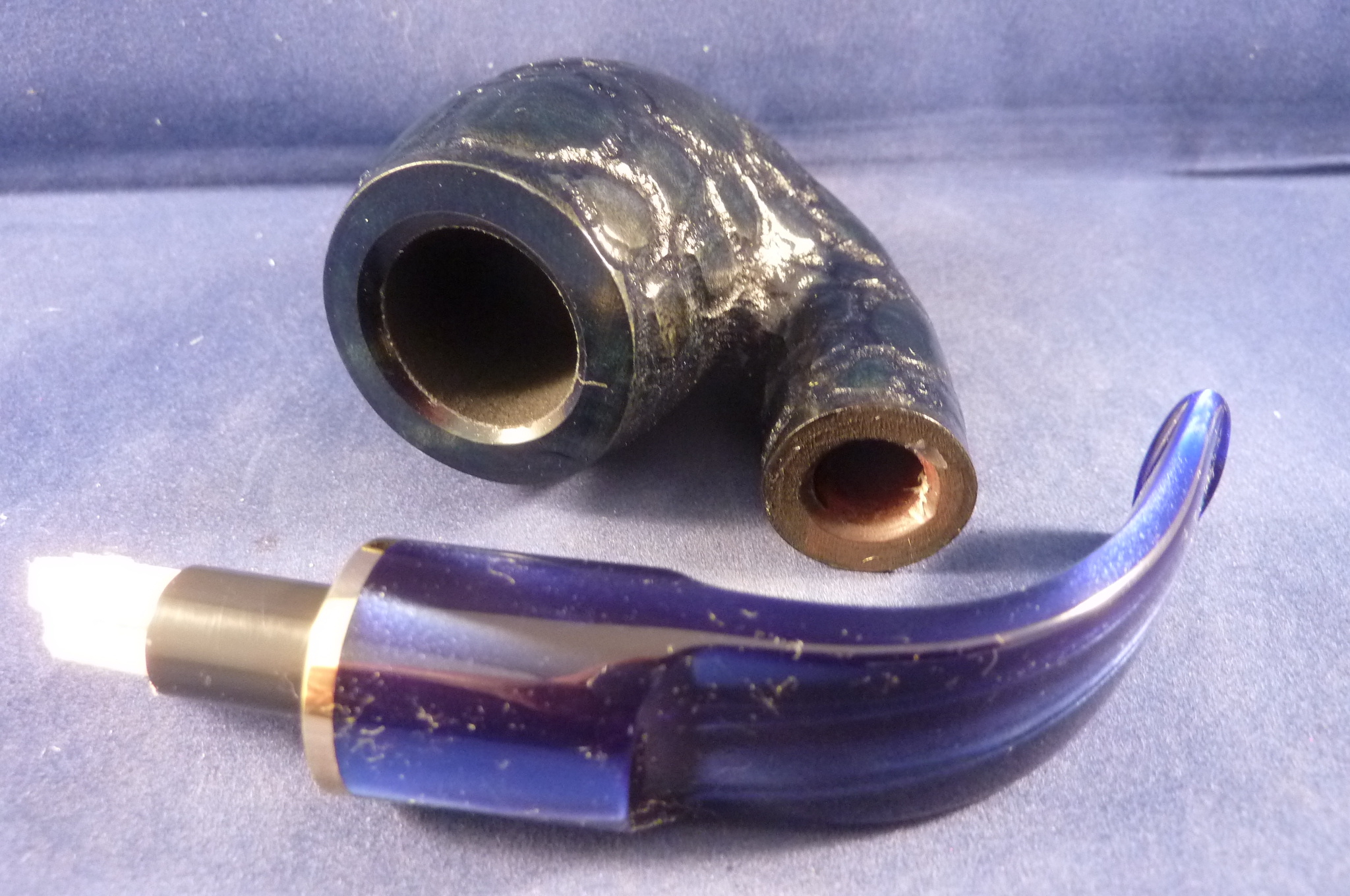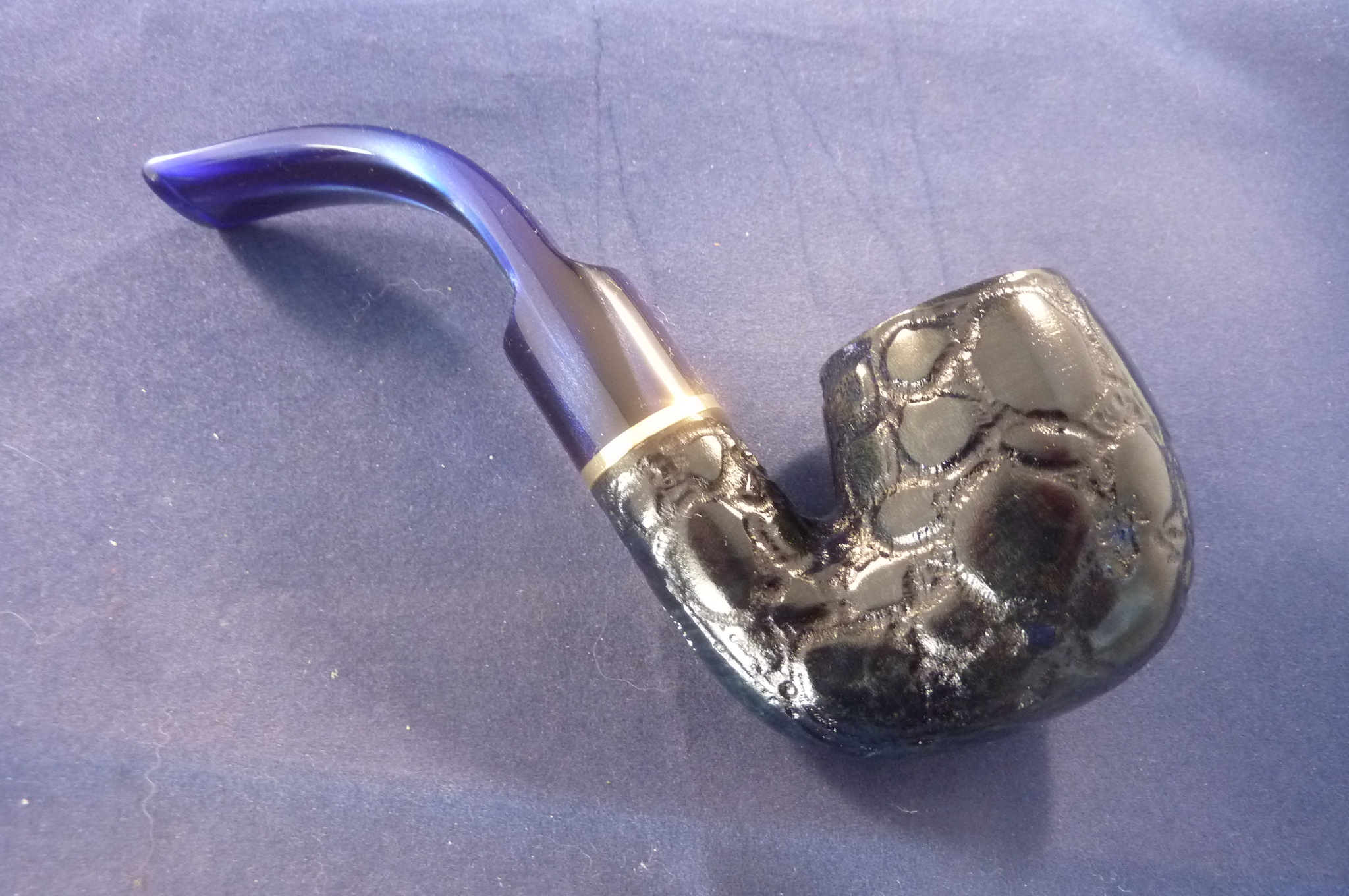 Italian rusticated briar pipe with some smooth parts, that make it look like the skin of a crocodile made by Savinelli. Acrylic blue mouthpiece. This pipe is made of high quality briar. 9 mm. filters or you can use the famous Balsa system.