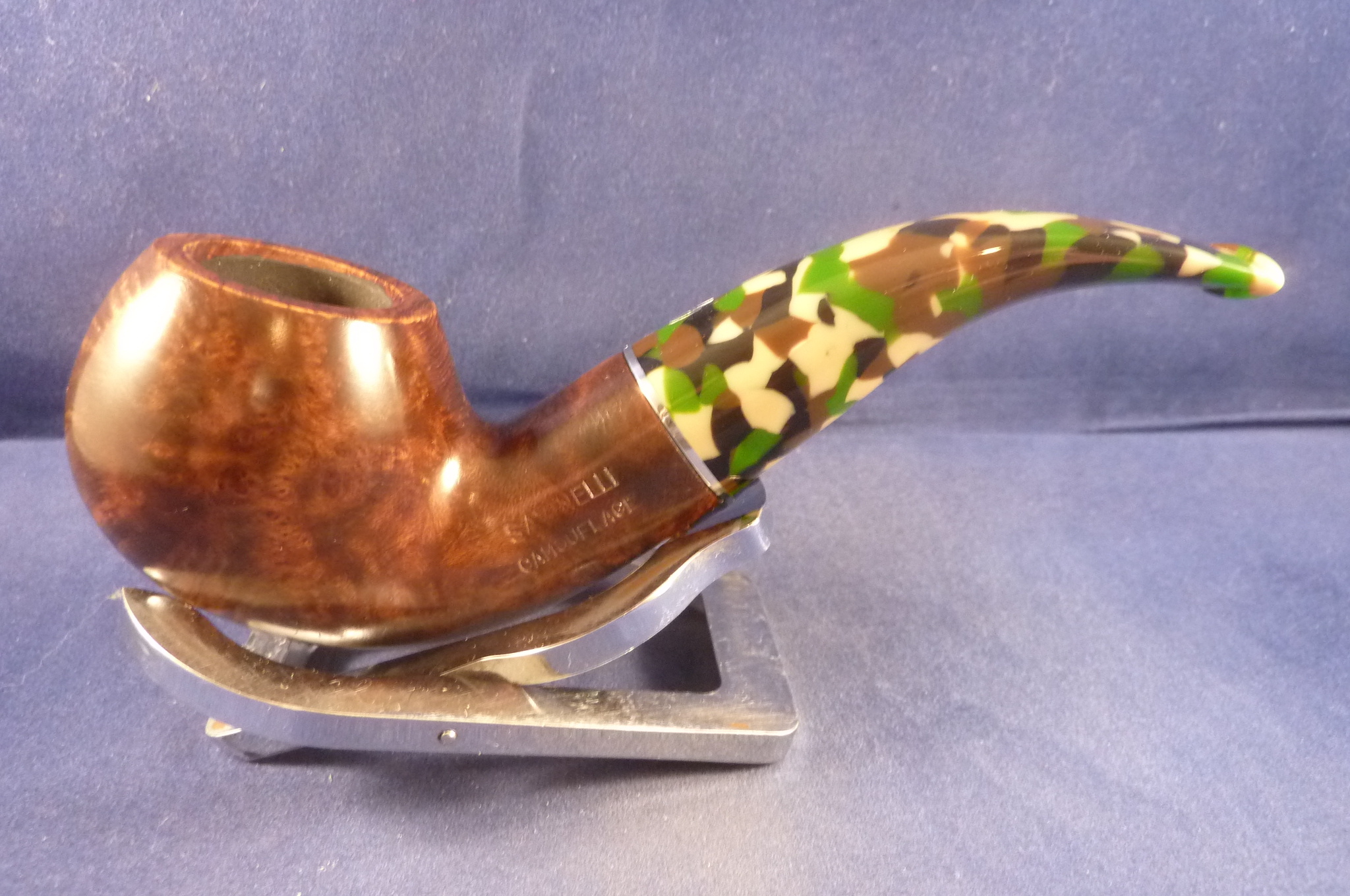 Original briar pipe made by Savinelli in Italy. This pipe is made of high quality briar. Acrylic mouthpiece with camouflage patterns, 9 mm. filters or you can use the famous Balsa system.