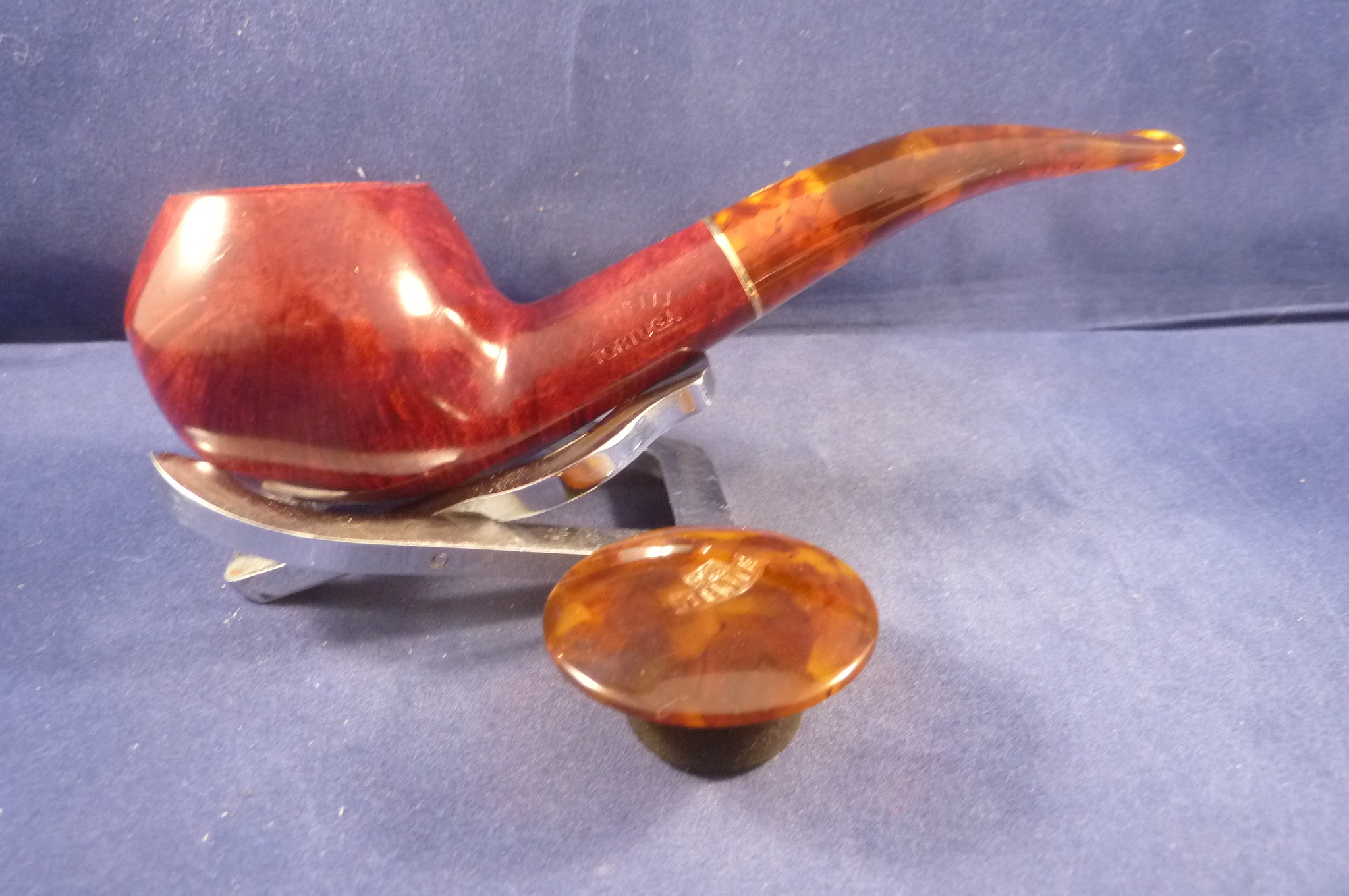 Italian briar pipe in a bordeaux colour made by Savinelli. Acrylic marbled mouthpiece.
