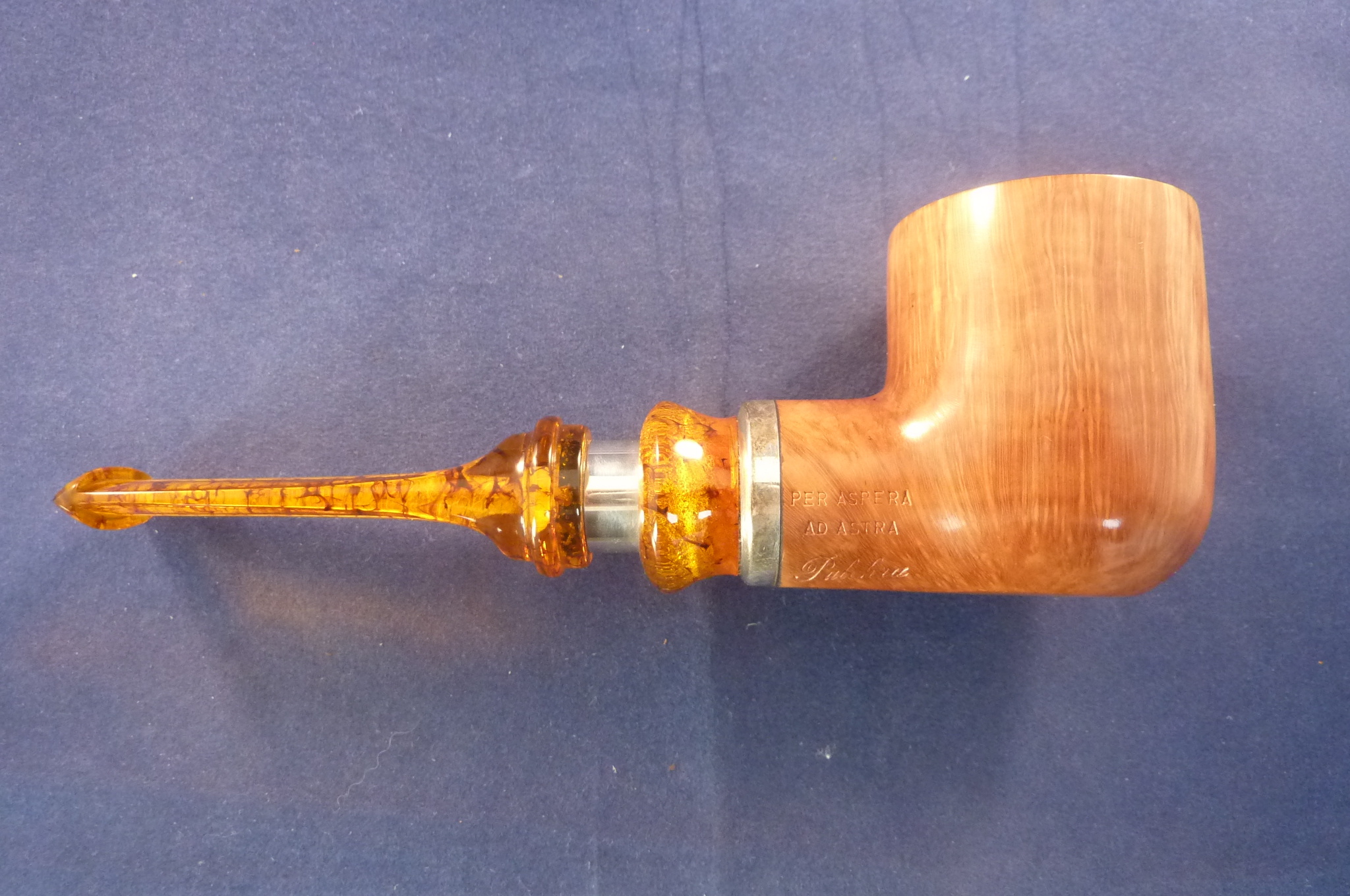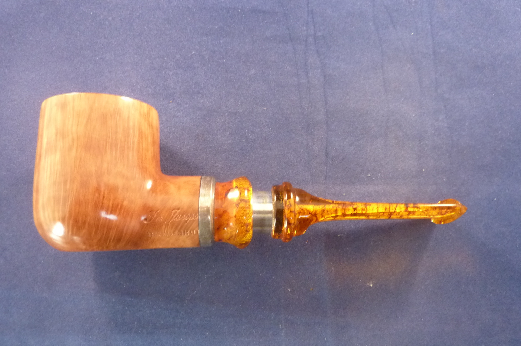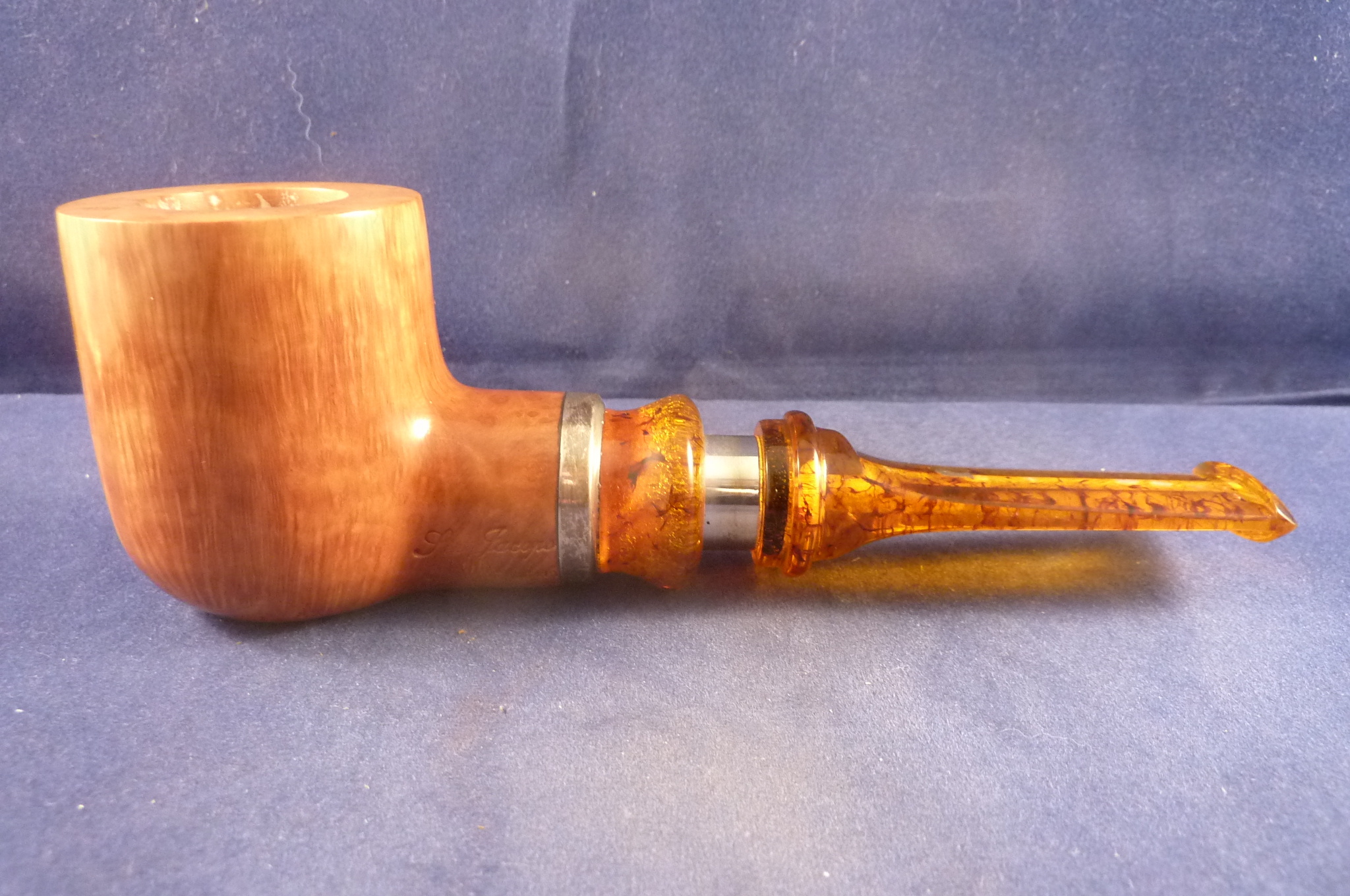 This is a brand new pipe made by Ser Jacopo in Italy. This company has some fine craftsmen, which produce beautiful handmade pipes with great designs and shapes. This smooth briar pipe has beautiful applications. Acrylic mouthpiece, 9 mm. filter.