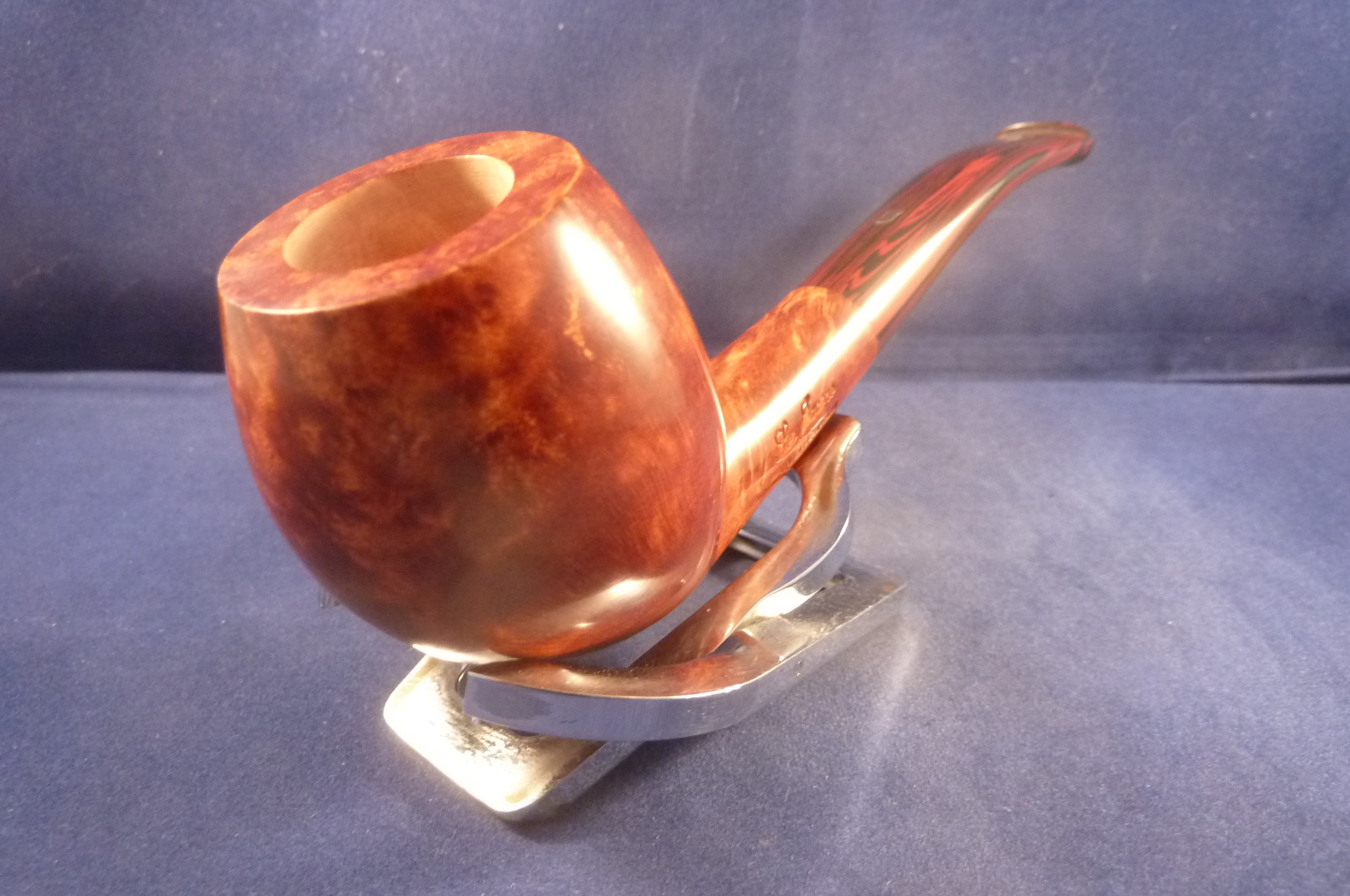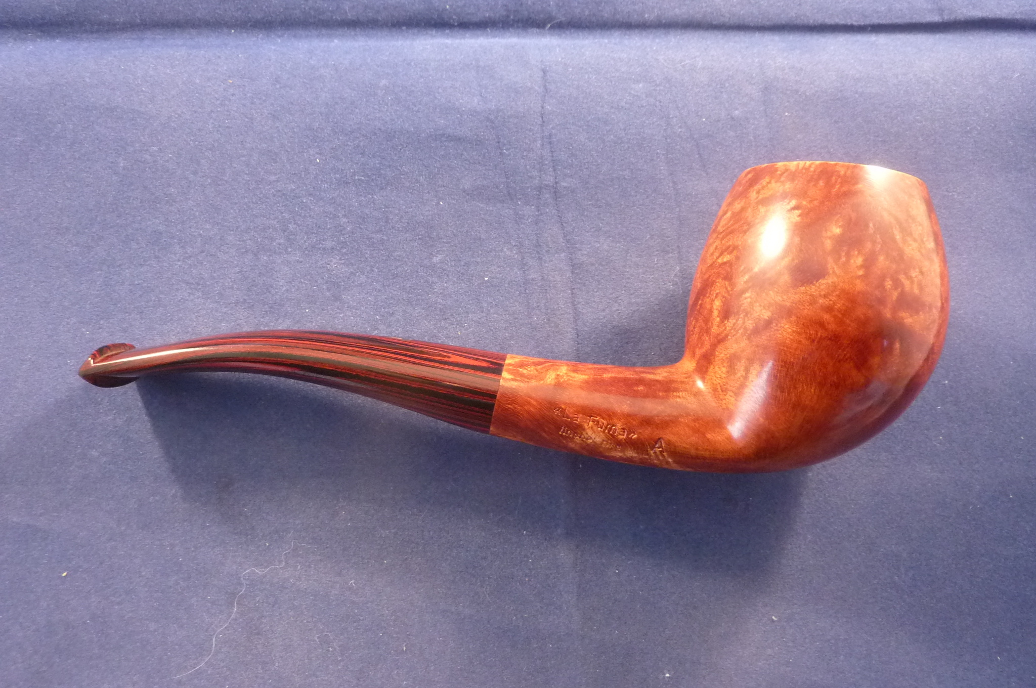 This is a brand new pipe made by Ser Jacopo in Italy. This company has some fine craftsmen, which produce beautiful handmade pipes with great designs and shapes. This smooth briar pipe has an original shape. Cumberland mouthpiece, 9 mm. filter.