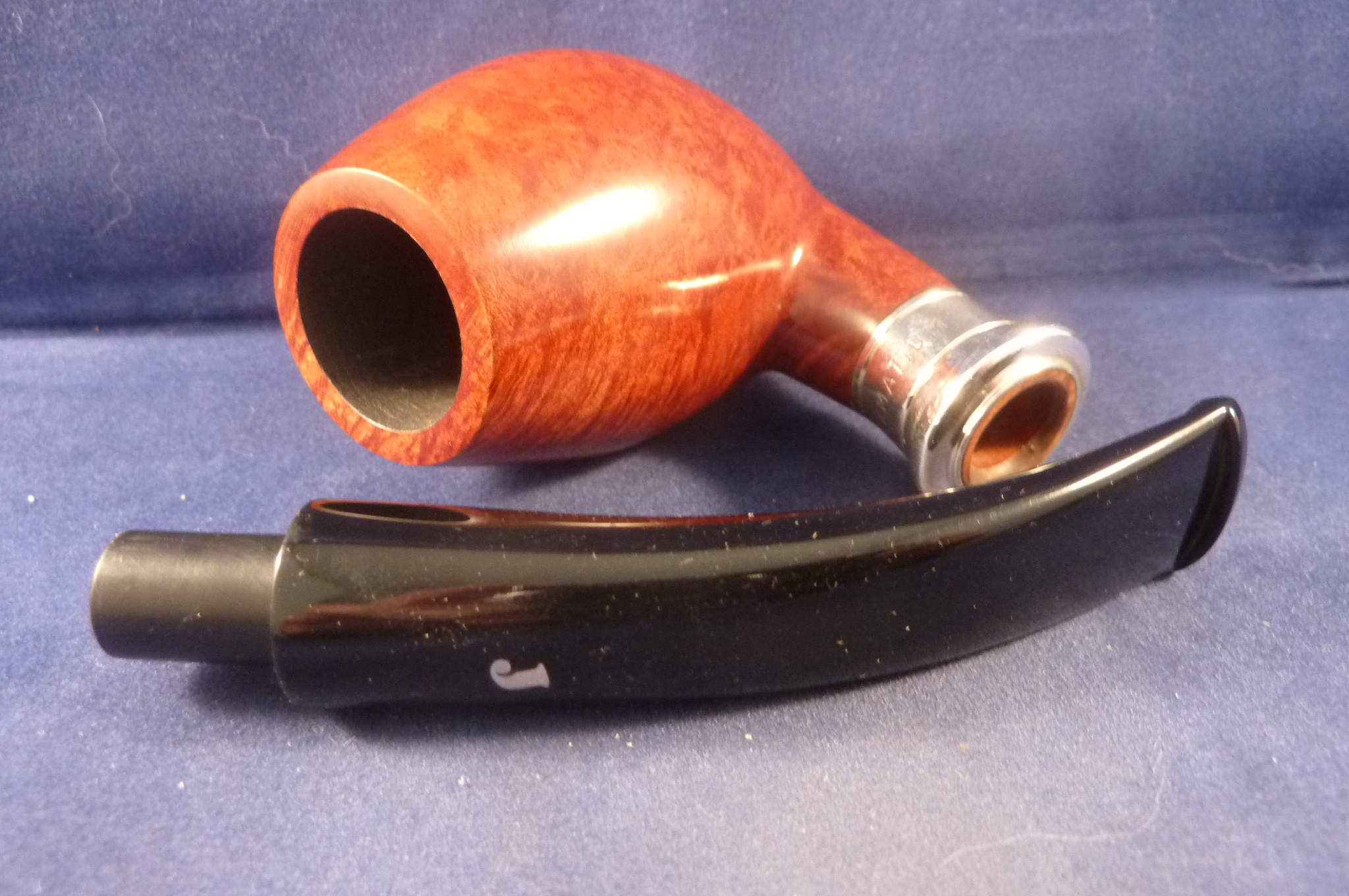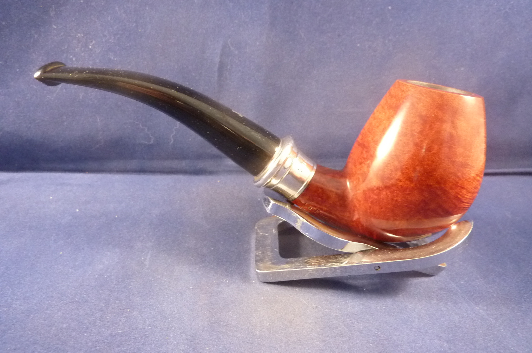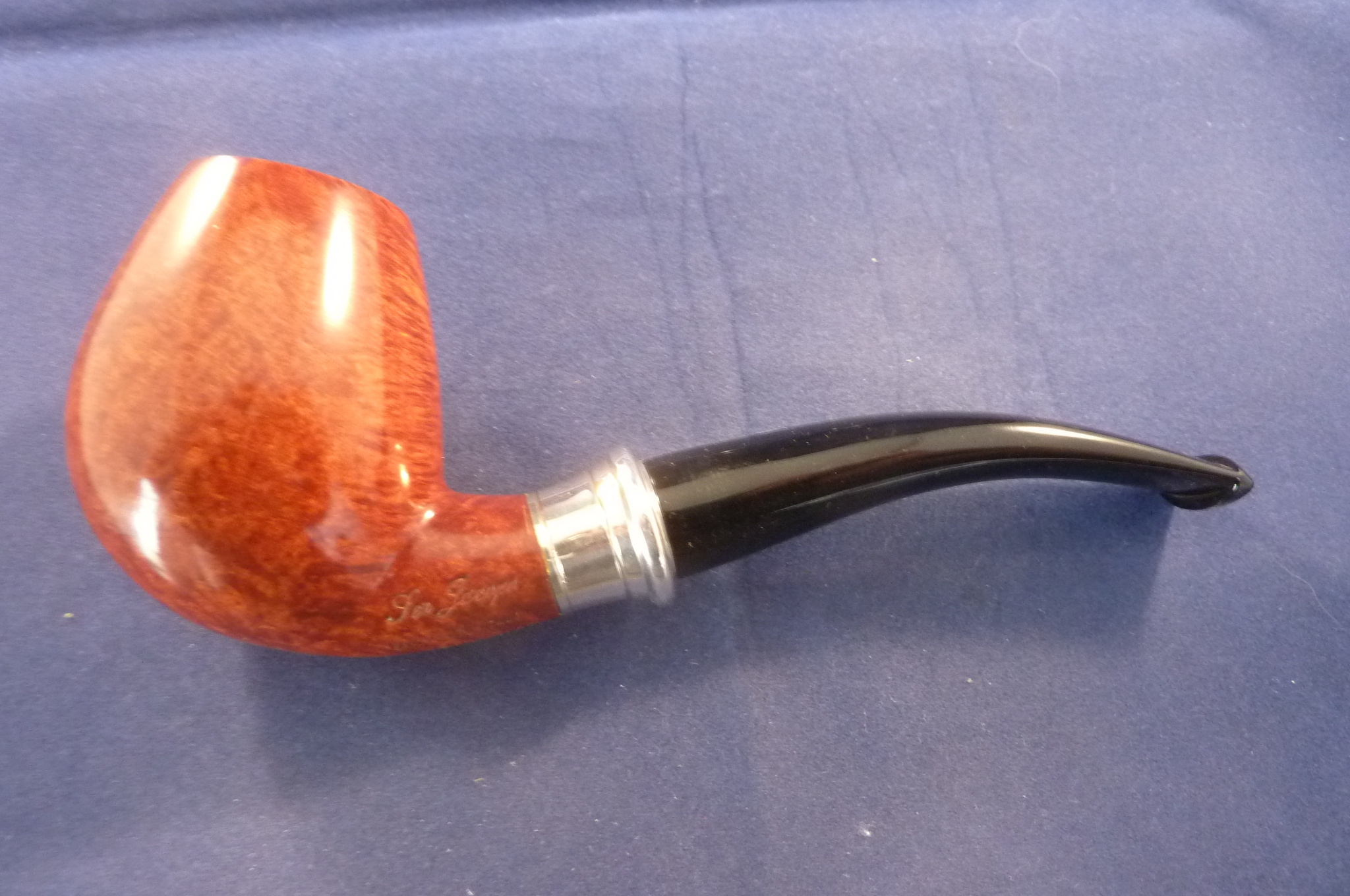 This is a brand new pipe made by Ser Jacopo in Italy. This company has some fine craftsmen, which produce beautiful handmade pipes with great designs and shapes. Smooth briar pipe in an elegant shape with a sterling silver application. Black mouthpiece, 9 mm. filter.