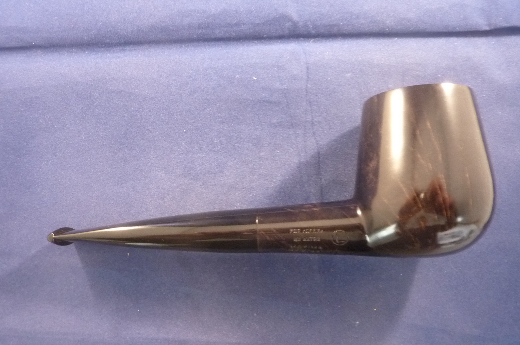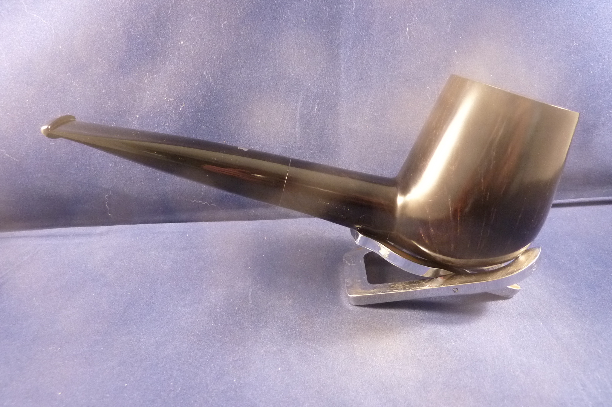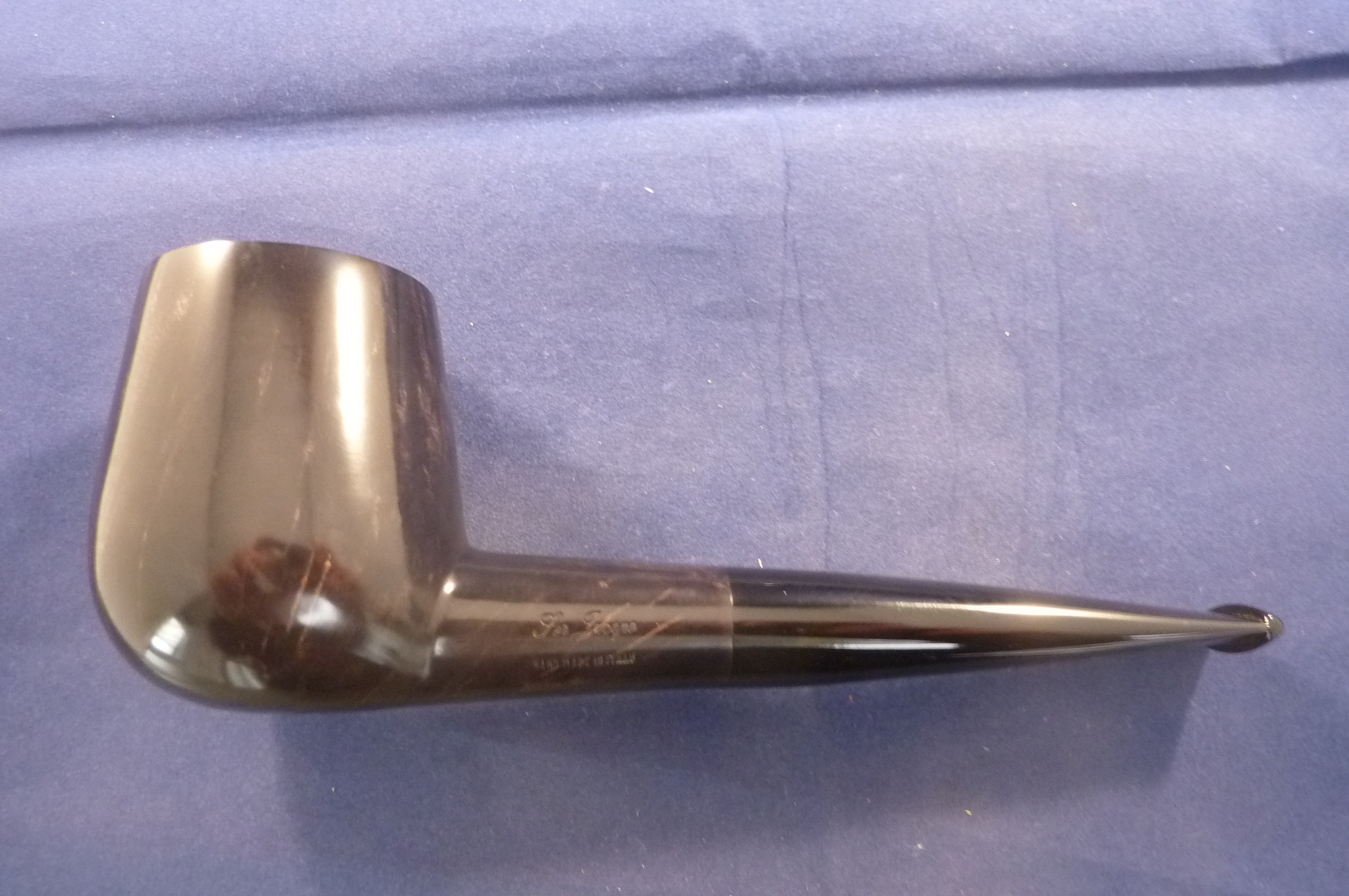 This is a brand new pipe made by Ser Jacopo in Italy. This company has some fine craftsmen, which produce beautiful handmade pipes with great designs and shapes. Giant smooth briar pipe in a dark brown finish. Acrylic mouthpiece, without filter.
