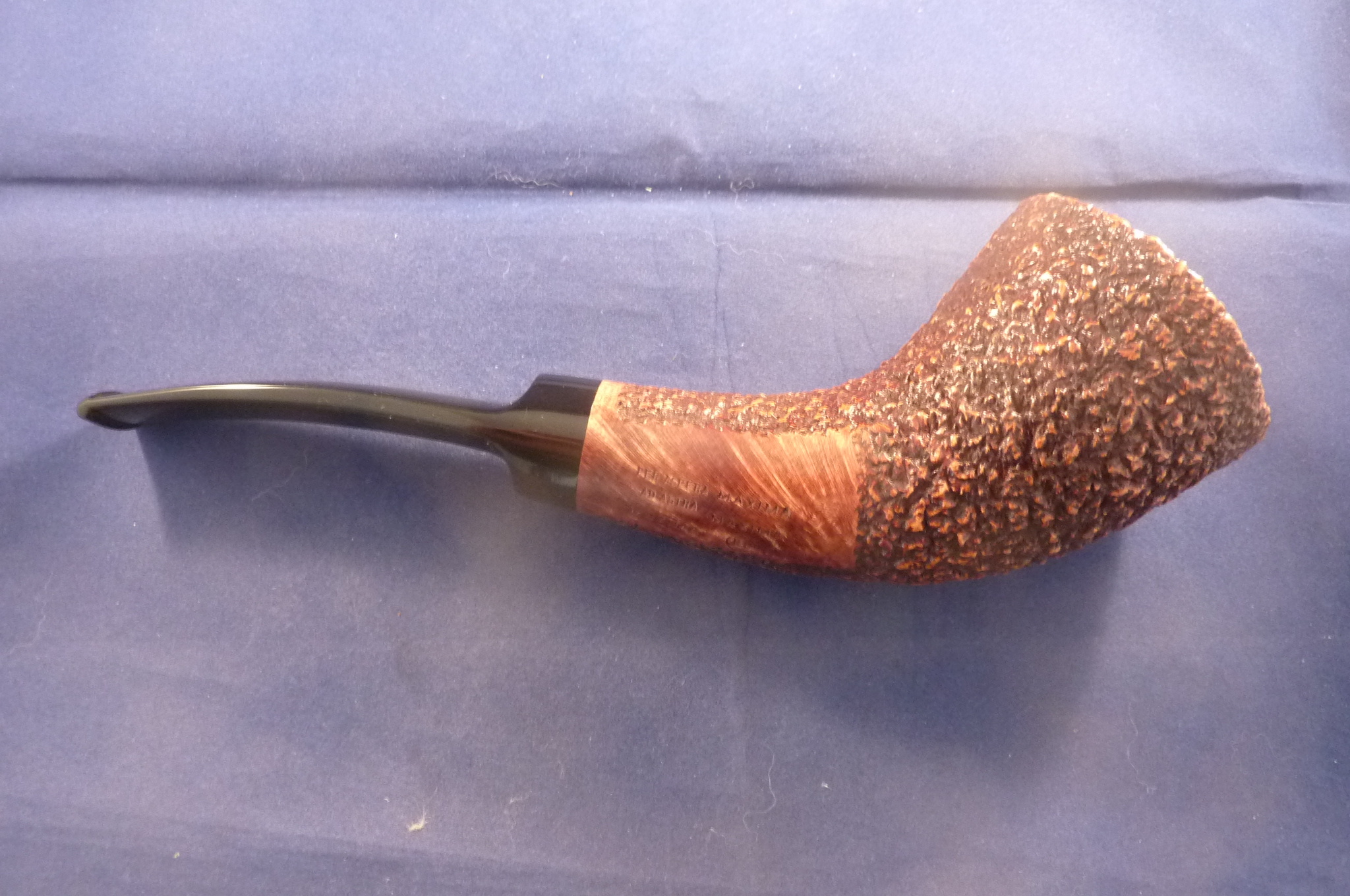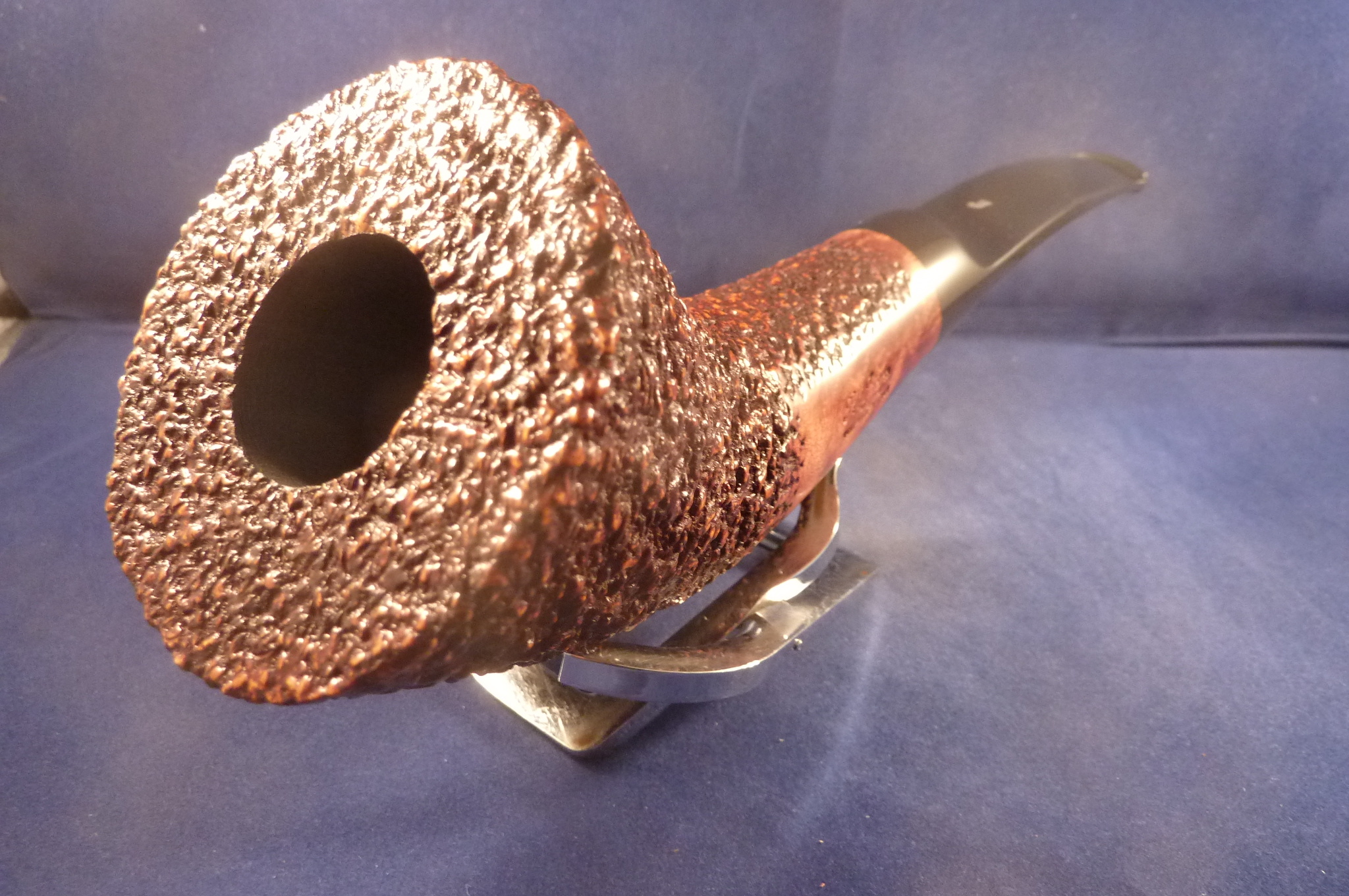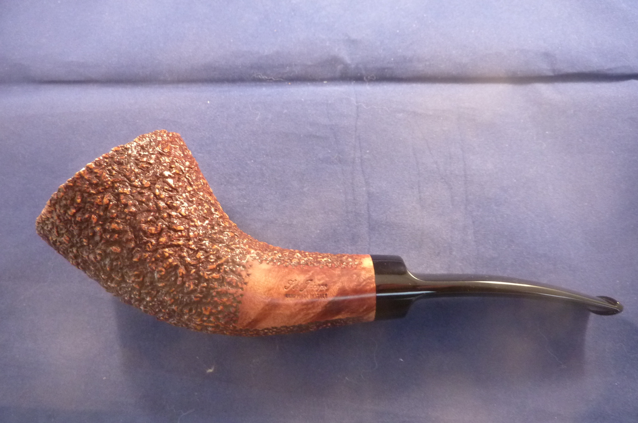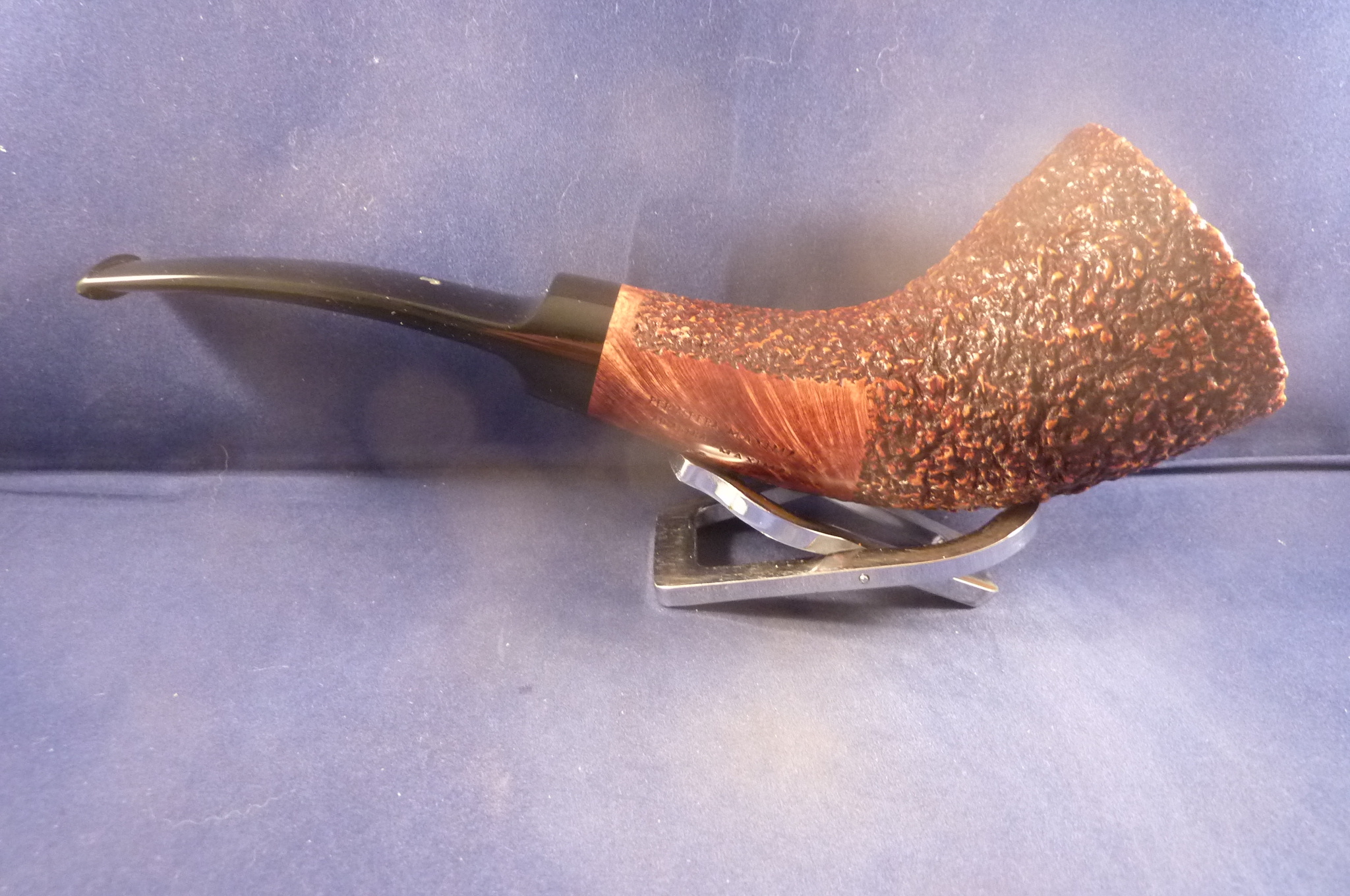 This is a brand new pipe made by Ser Jacopo in Italy. This company has some fine craftsmen, which produce beautiful handmade pipes with great designs and shapes. This giant rusticated briar pipe can stand alone. Acrylic mouthpiece, without filter.