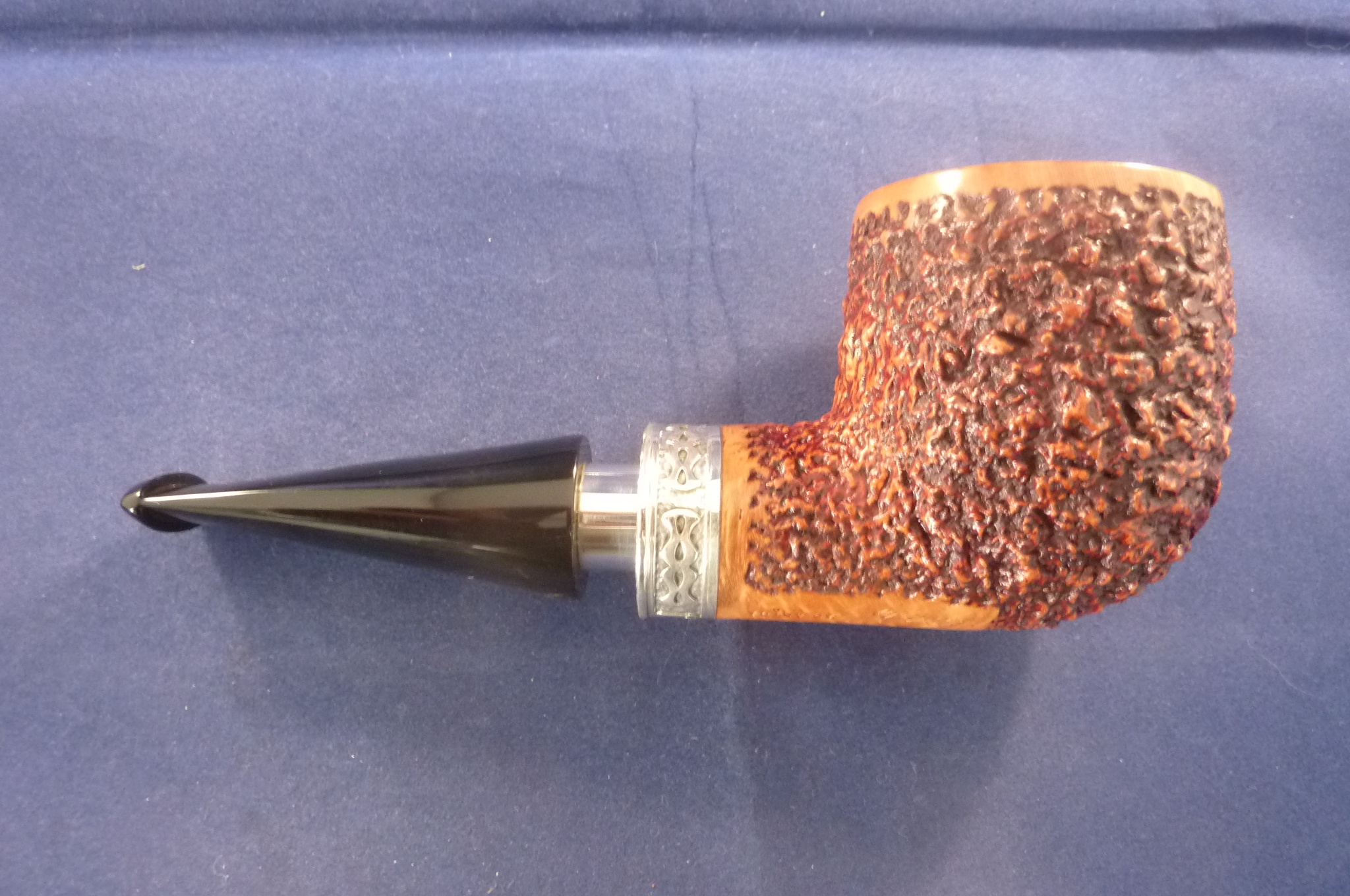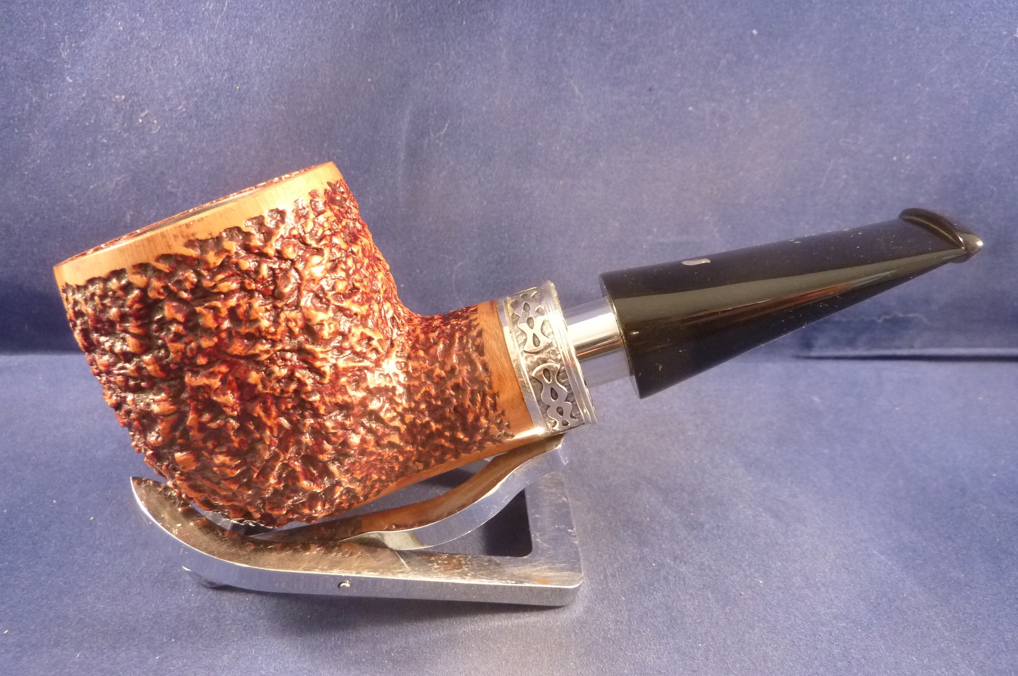 This is a brand new pipe made by Ser Jacopo in Italy. This company has some fine craftsmen, which produce beautiful handmade pipes with great designs and shapes. This rusticated briar pipe has a beautiful sterling silver ring. Acrylic mouthpiece, 9 mm. filter.