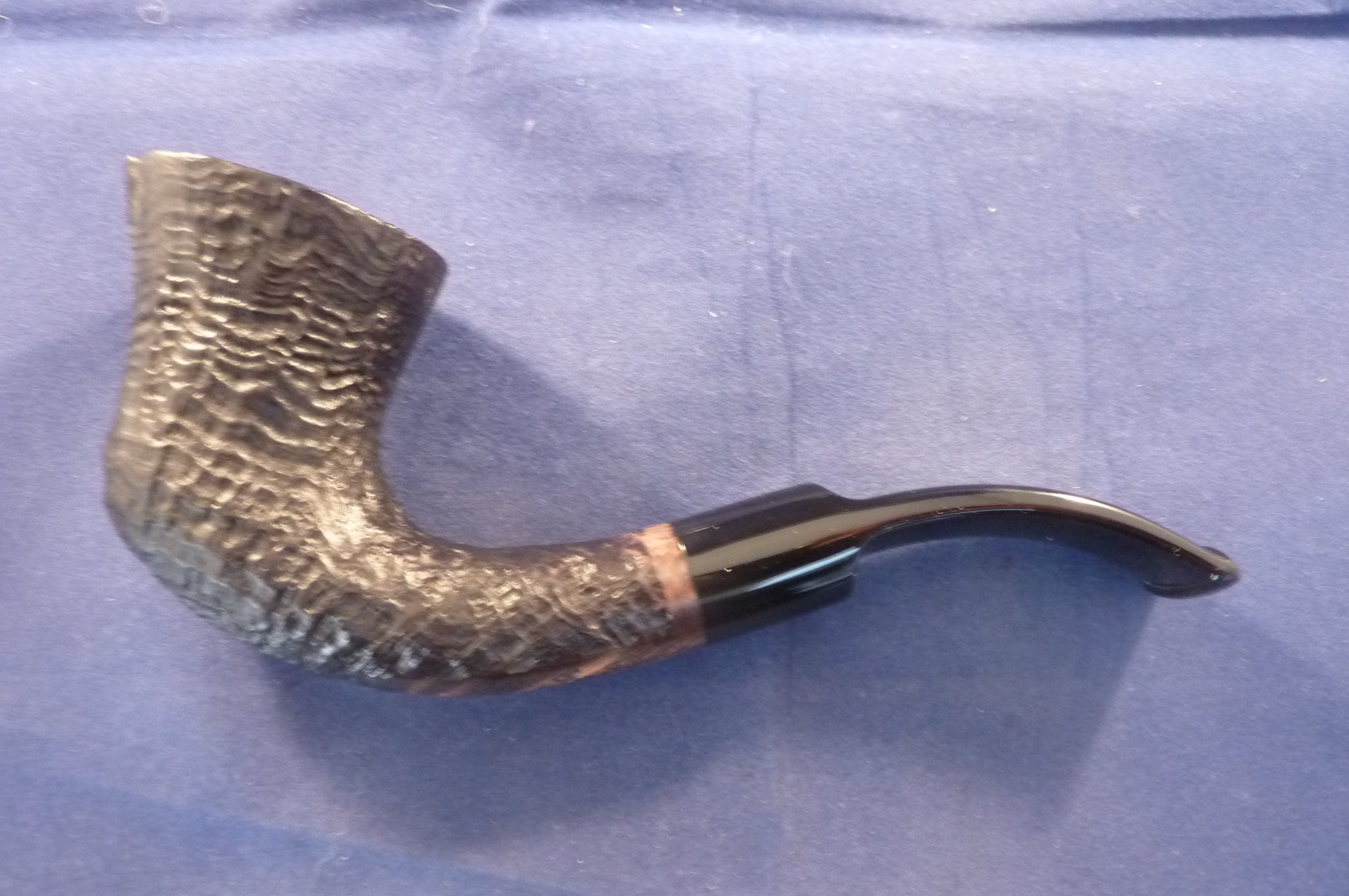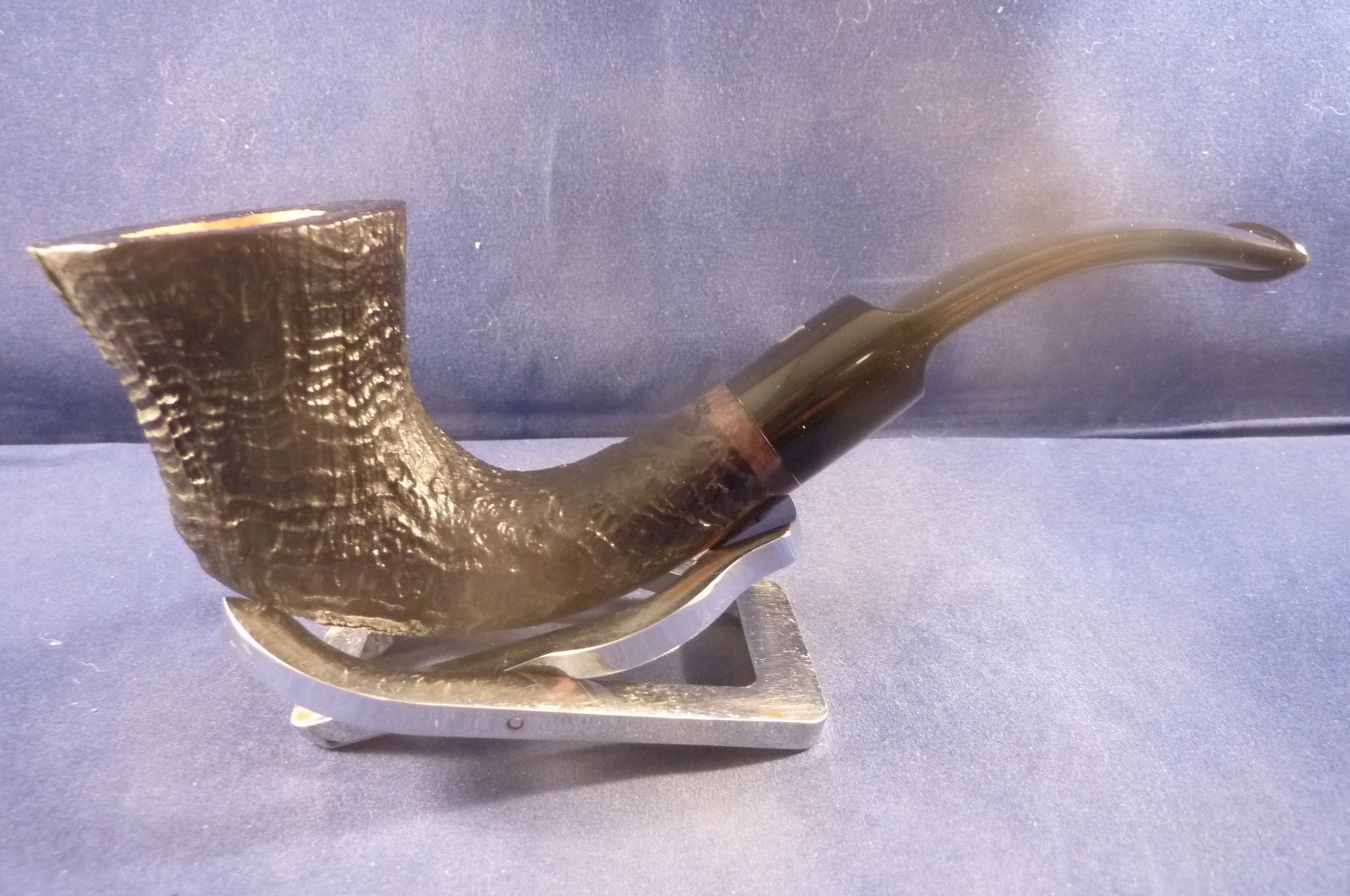 This is a brand new pipe made by Ser Jacopo in Italy. This company has some fine craftsmen, which produce beautiful handmade pipes with great designs and shapes. This sandblasted briar pipe has a beautiful shape. Black acrylic mouthpiece, 9 mm. filter.