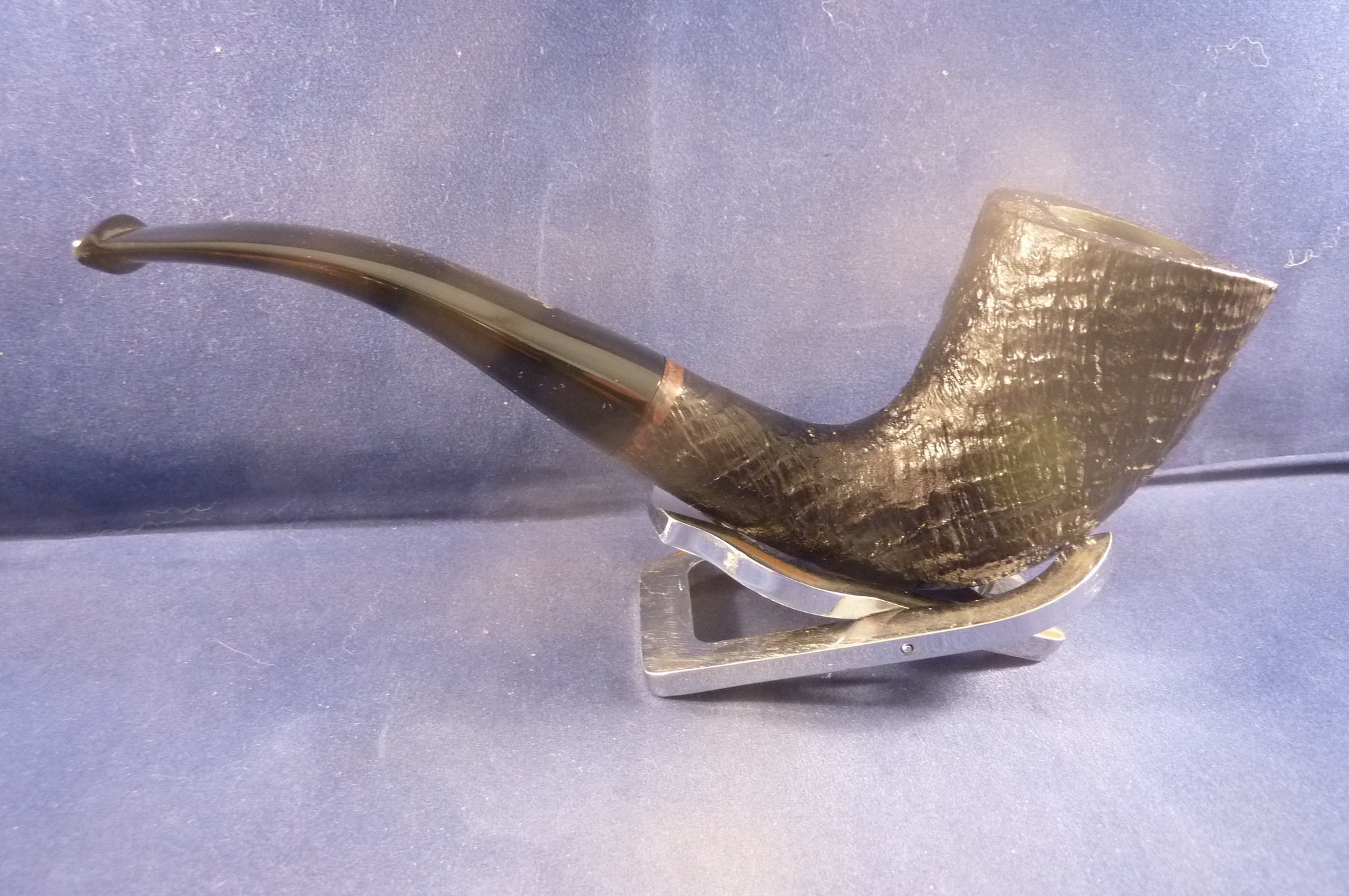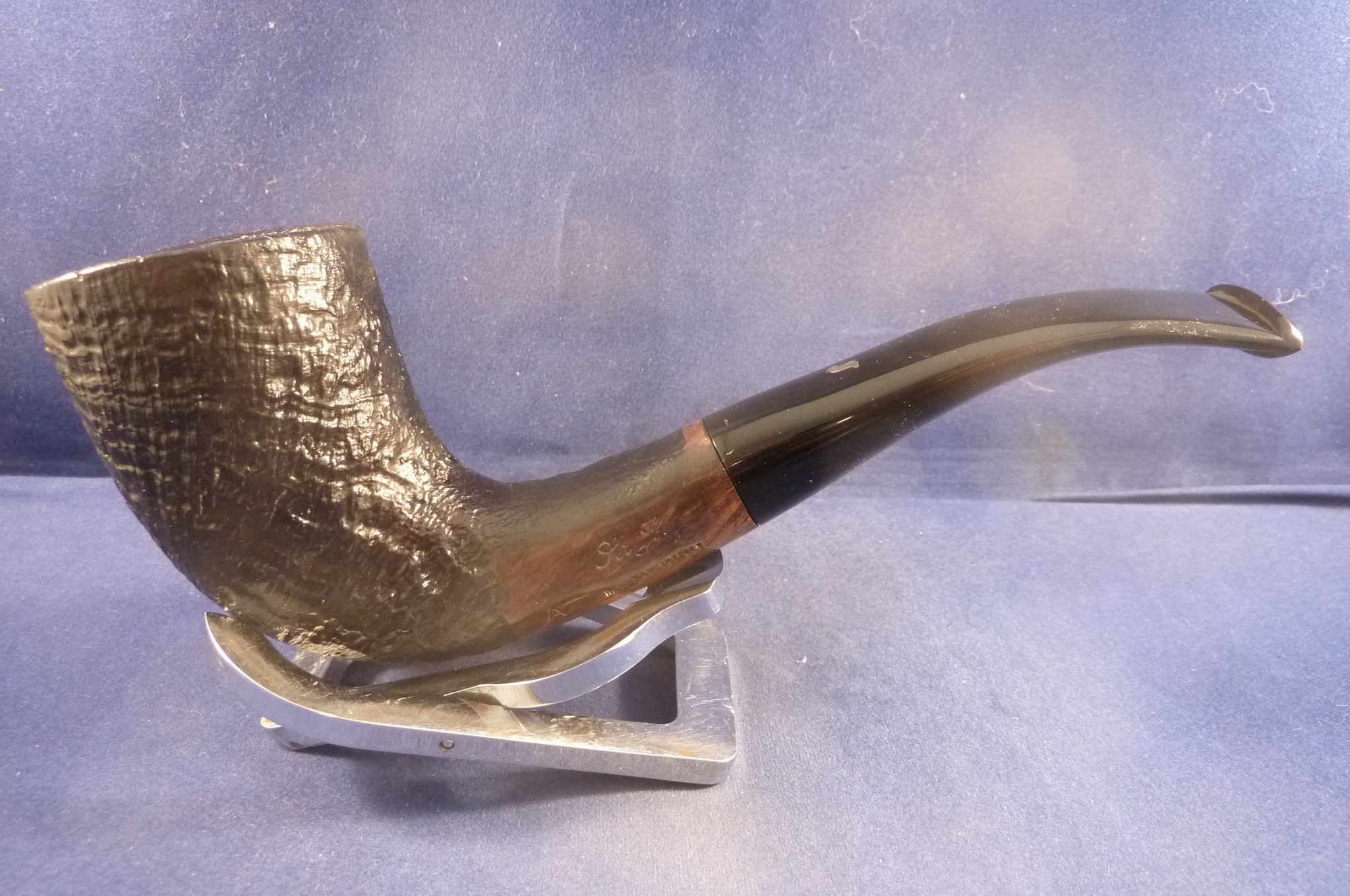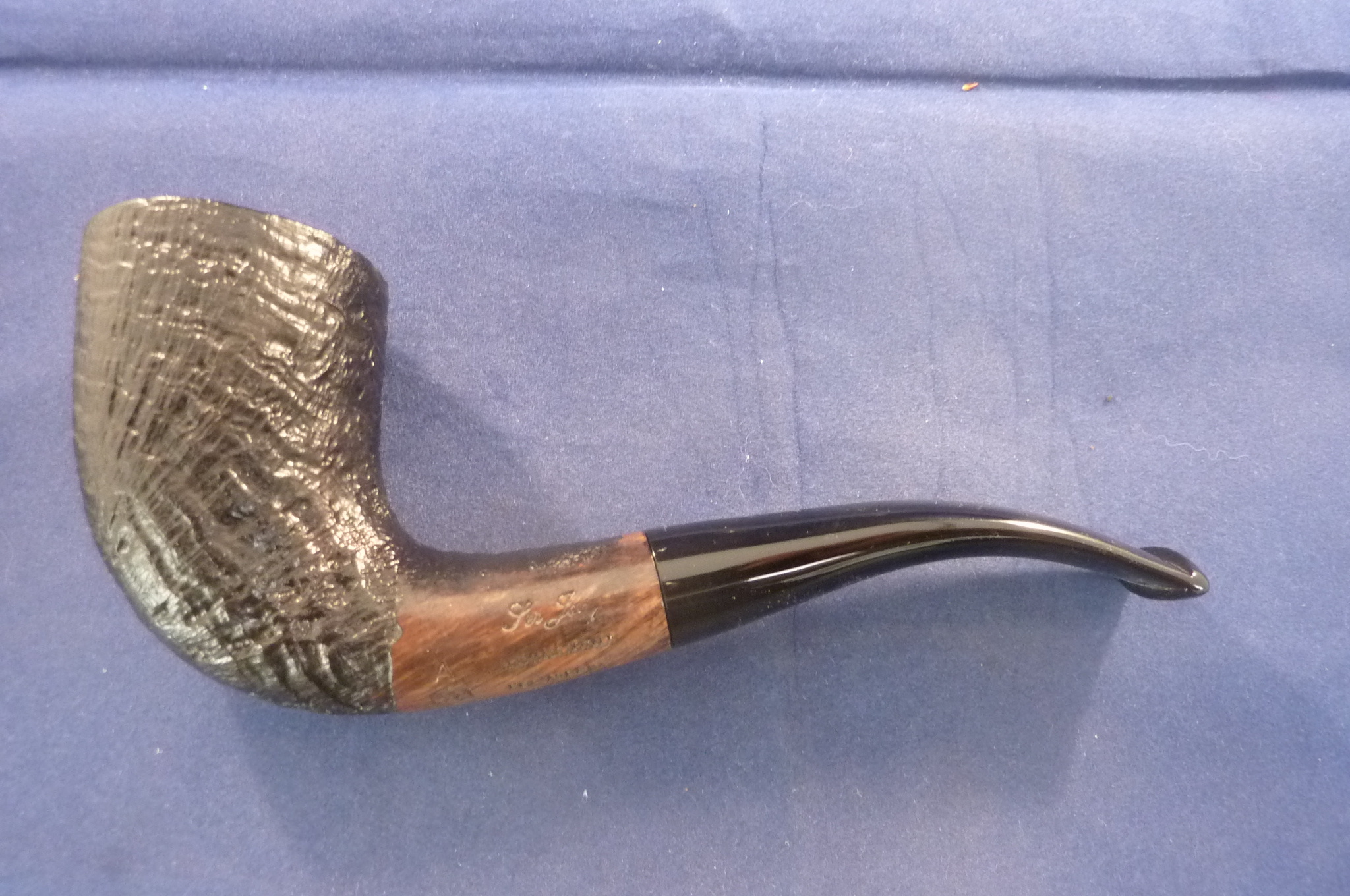 This is a brand new pipe made by Ser Jacopo in Italy. This company has some fine craftsmen, which produce beautiful handmade pipes with great designs and shapes. This sandblasted briar pipe has a beautiful shape. Black acrylic mouthpiece, 9 mm. filter.