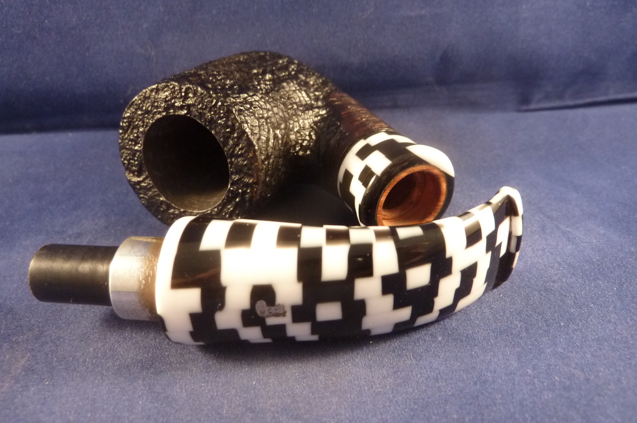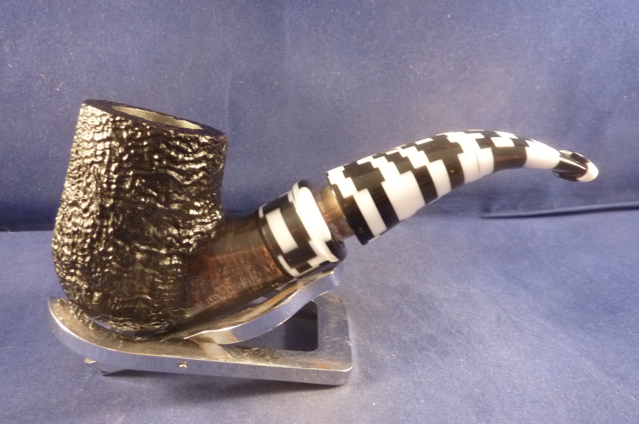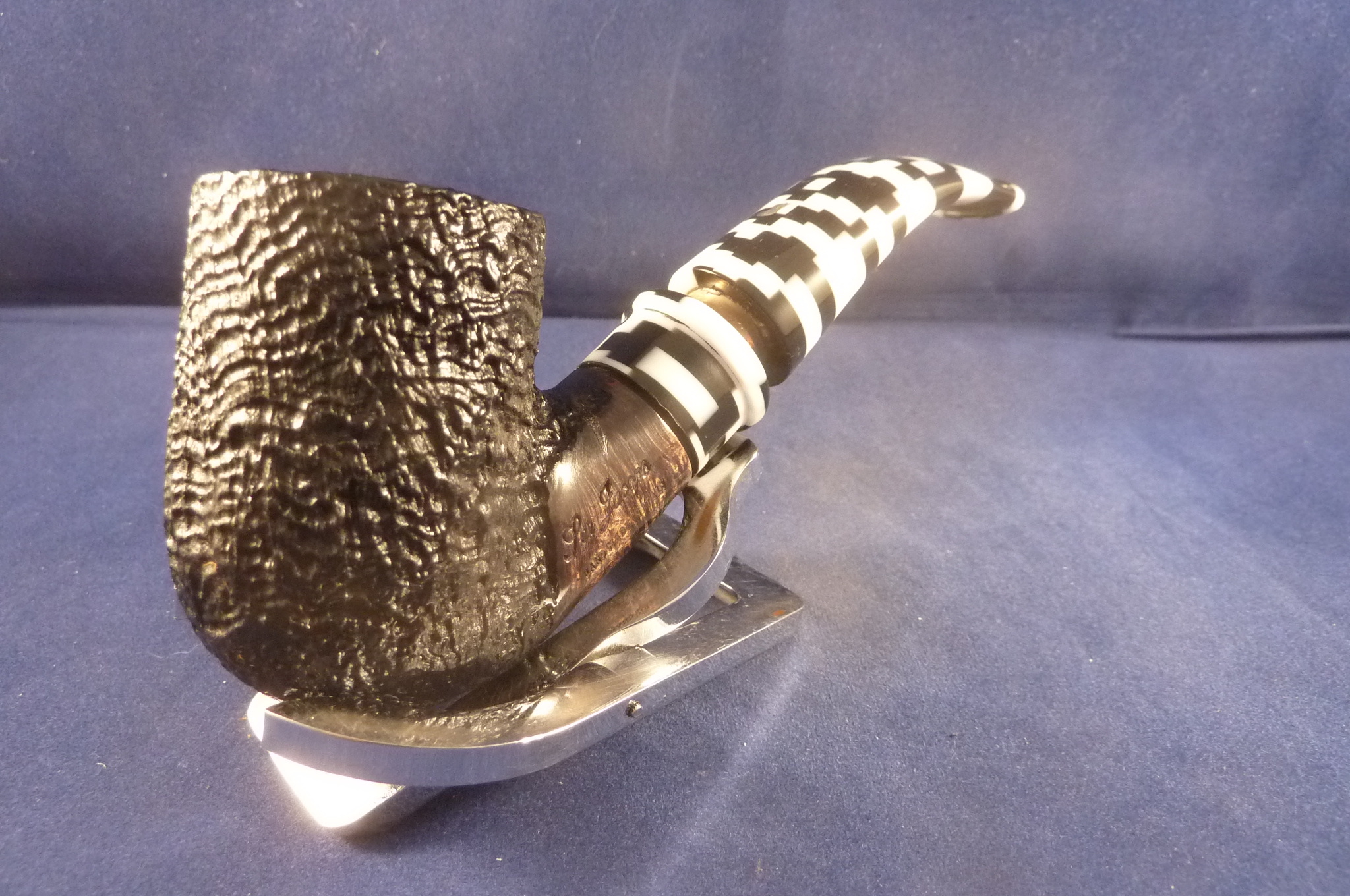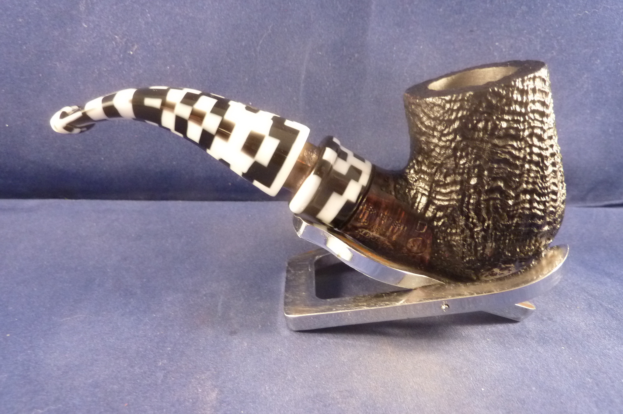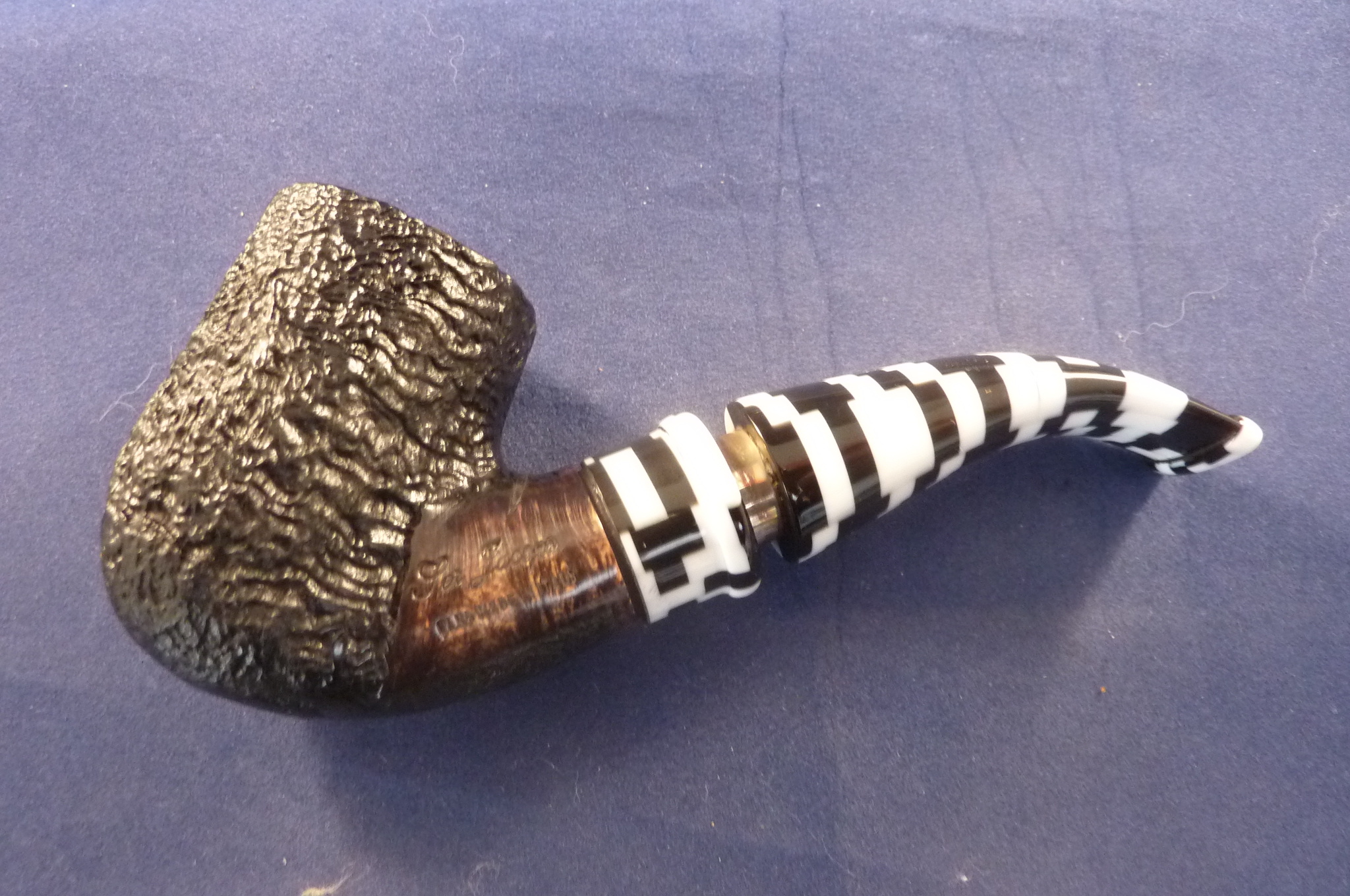 This is a brand new pipe made by Ser Jacopo in Italy. This company has some fine craftsmen, which produce beautiful handmade pipes with great designs and shapes. This sandblasted briar pipe has a beautiful shape. Black and white acrylic mouthpiece, 9 mm. filter.