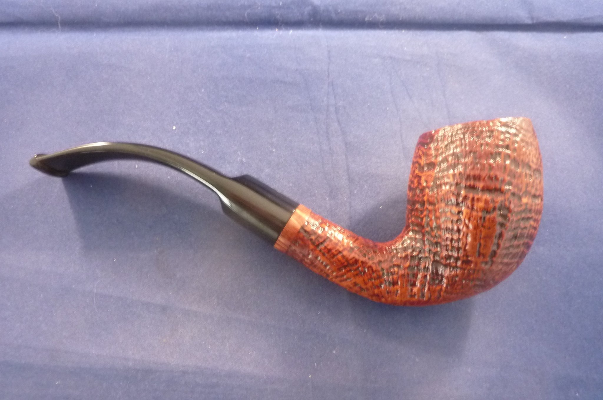 This is a brand new pipe made by Ser Jacopo in Italy. This company has some fine craftsmen, which produce beautiful handmade pipes with great designs and shapes. This sandblasted briar pipe has a beautiful shape. Acrylic mouthpiece, 9 mm. filter.