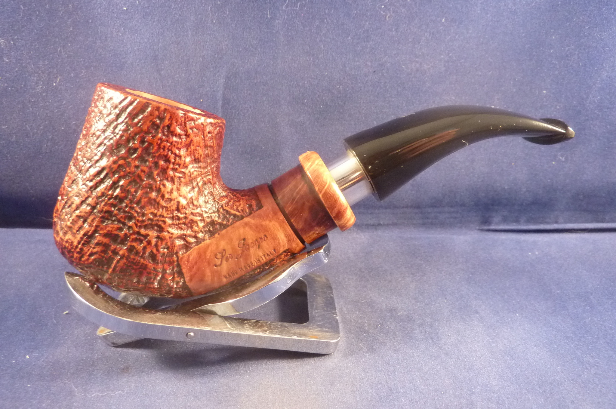 This is a brand new pipe made by Ser Jacopo in Italy. This company has some fine craftsmen, which produce beautiful handmade pipes with great designs and shapes. This sandblasted briar pipe has a beautiful shape. Black acrylic mouthpiece, 9 mm. filter.