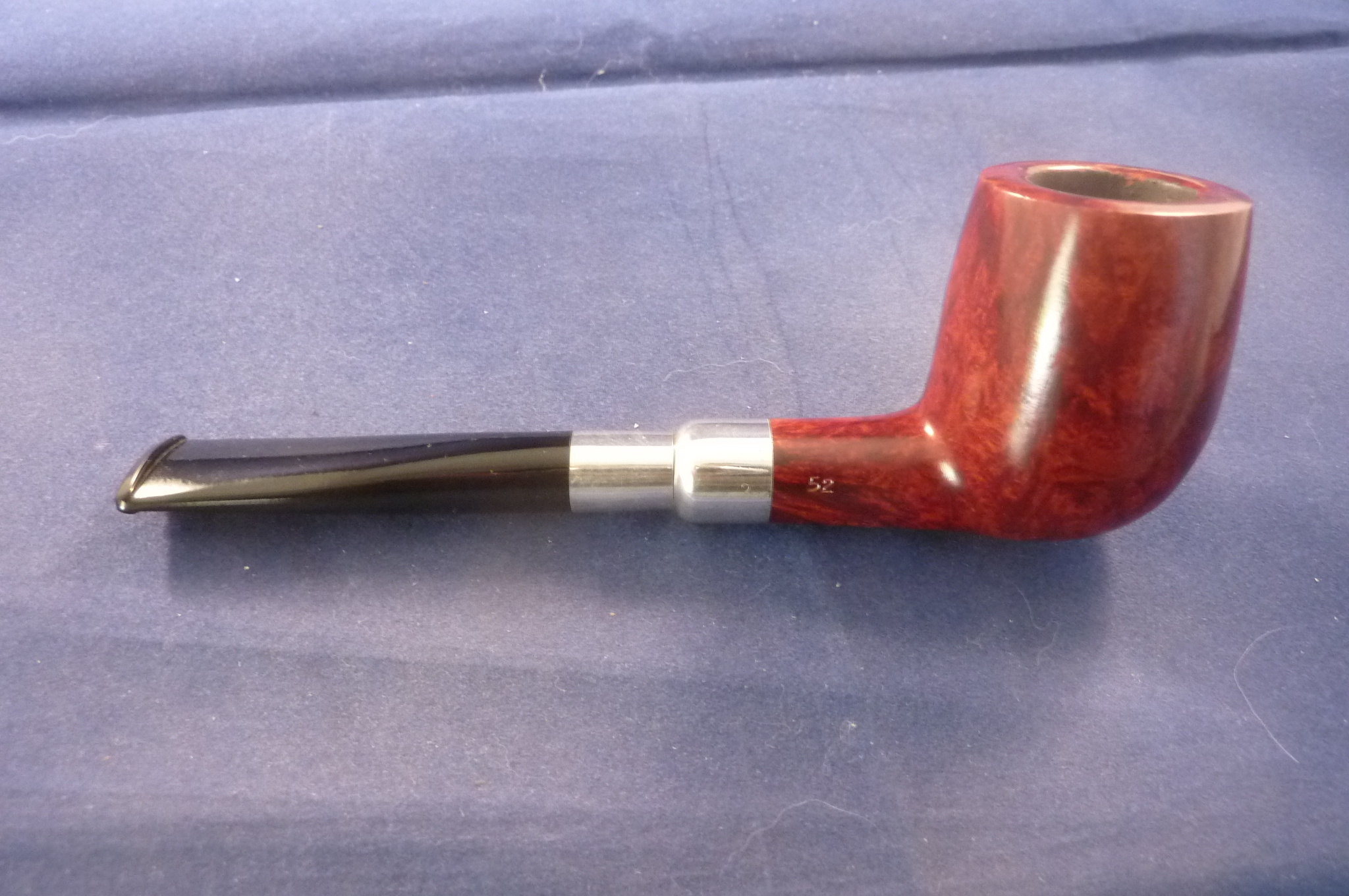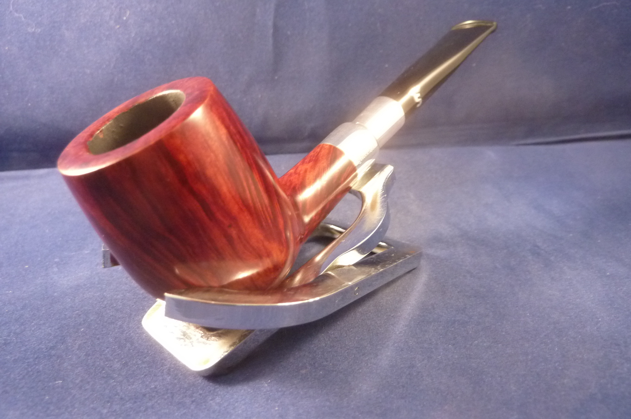Smooth briar pipe with sterling silver applications made by Stanwell in Denmark. Black acrylic mouthpiece, without filter.