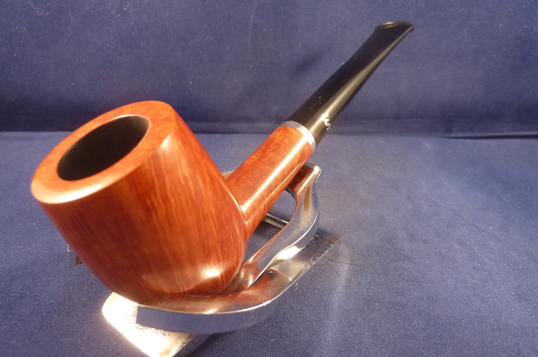 Smooth perfect briar pipe with a sterling silver ring and beautiful grains made by Stanwell in Denmark. Black mouthpiece, without filter.