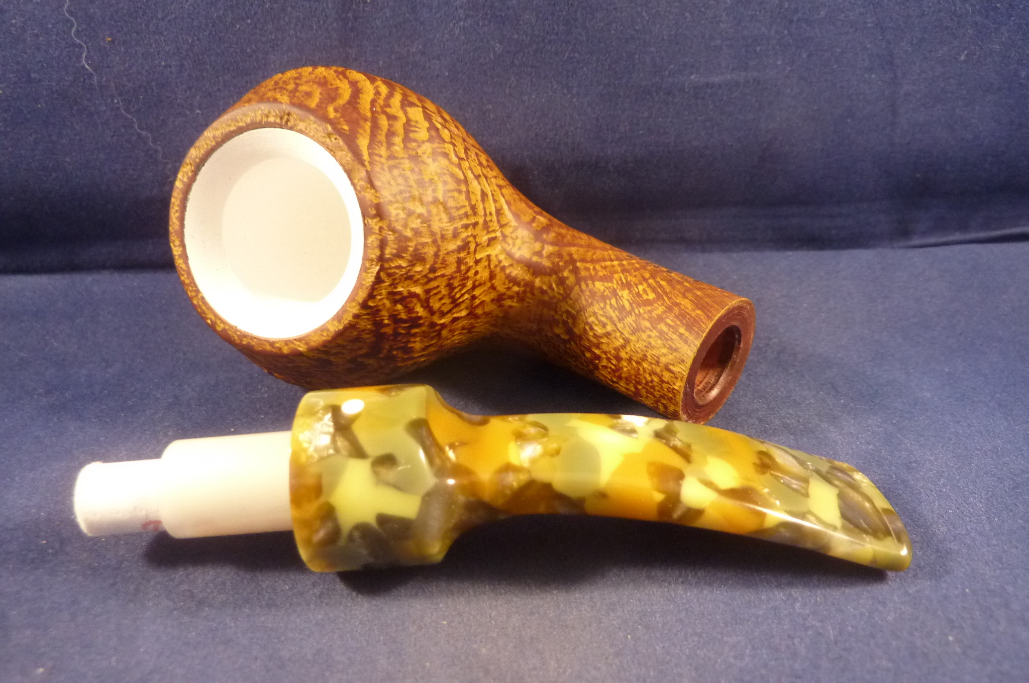 Sandblasted briar pipe in a brown finish with a Vauen Lining insert made by Vauen in Germany. Acrylic camo mouthpiece, 9 mm. filter. White dot quality. The insert is a kind of meerschaum.