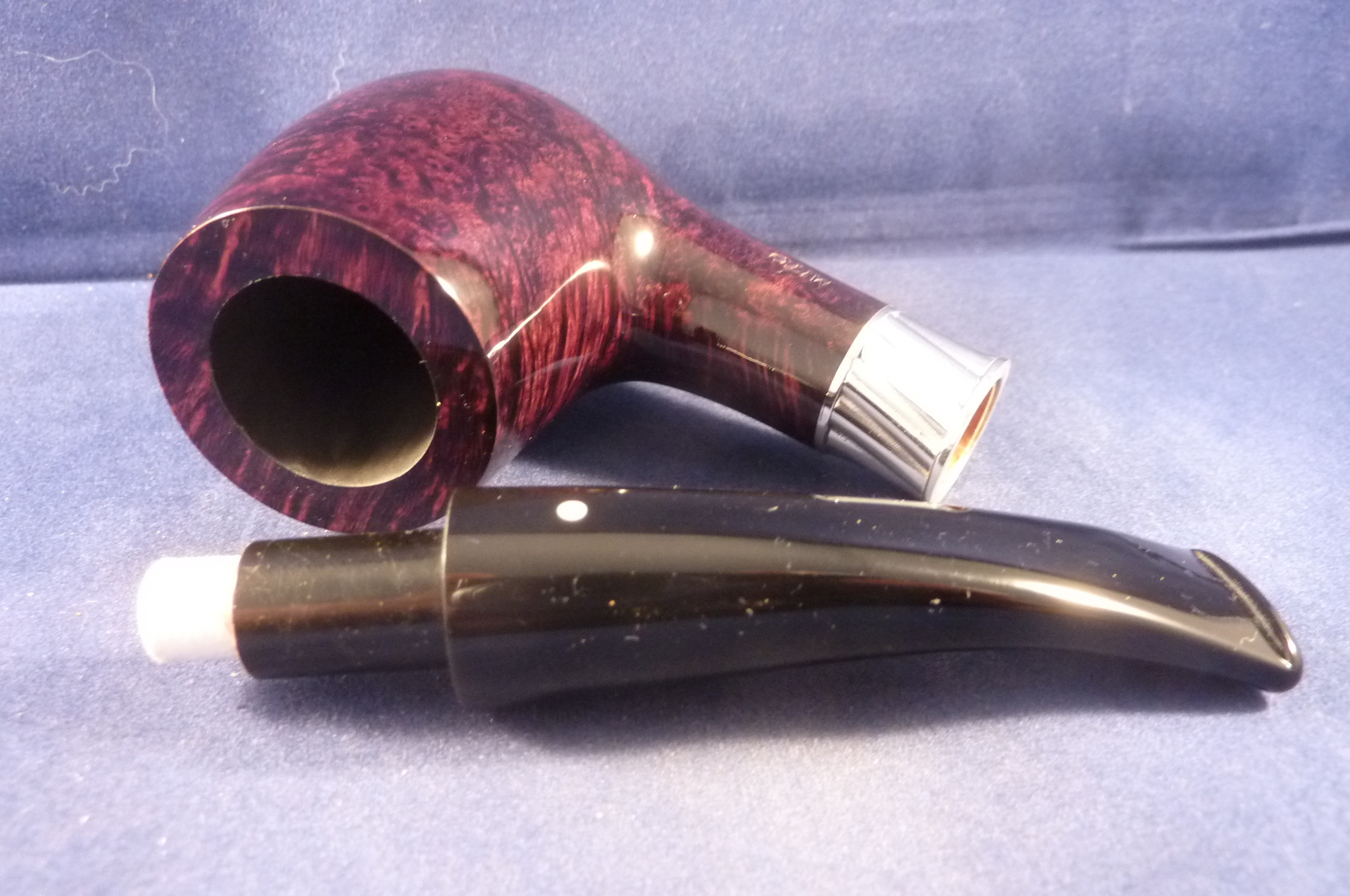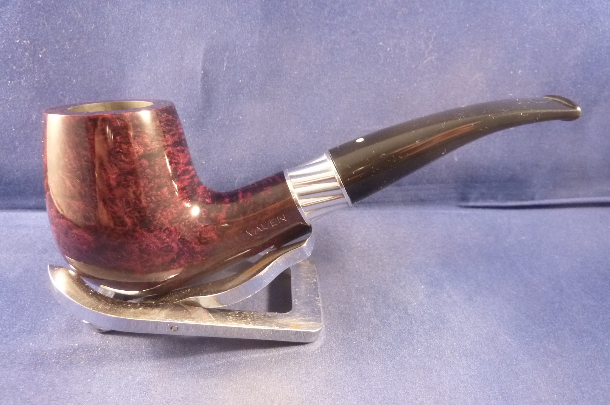 Smooth briar pipe in a purple/brown finish with a twisted silver ring made by Vauen in Germany. Acrylic black mouthpiece, 9 mm. filter. White dot quality.
