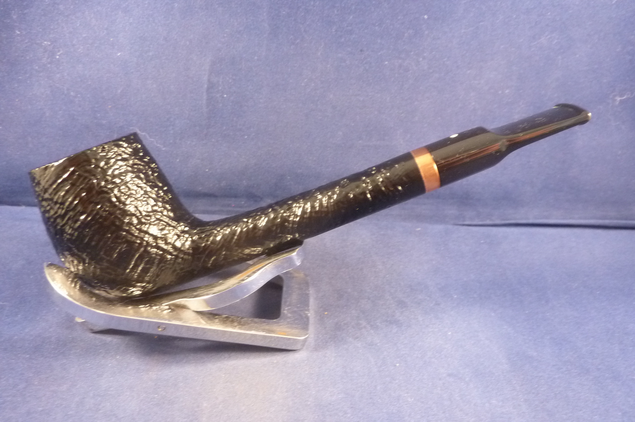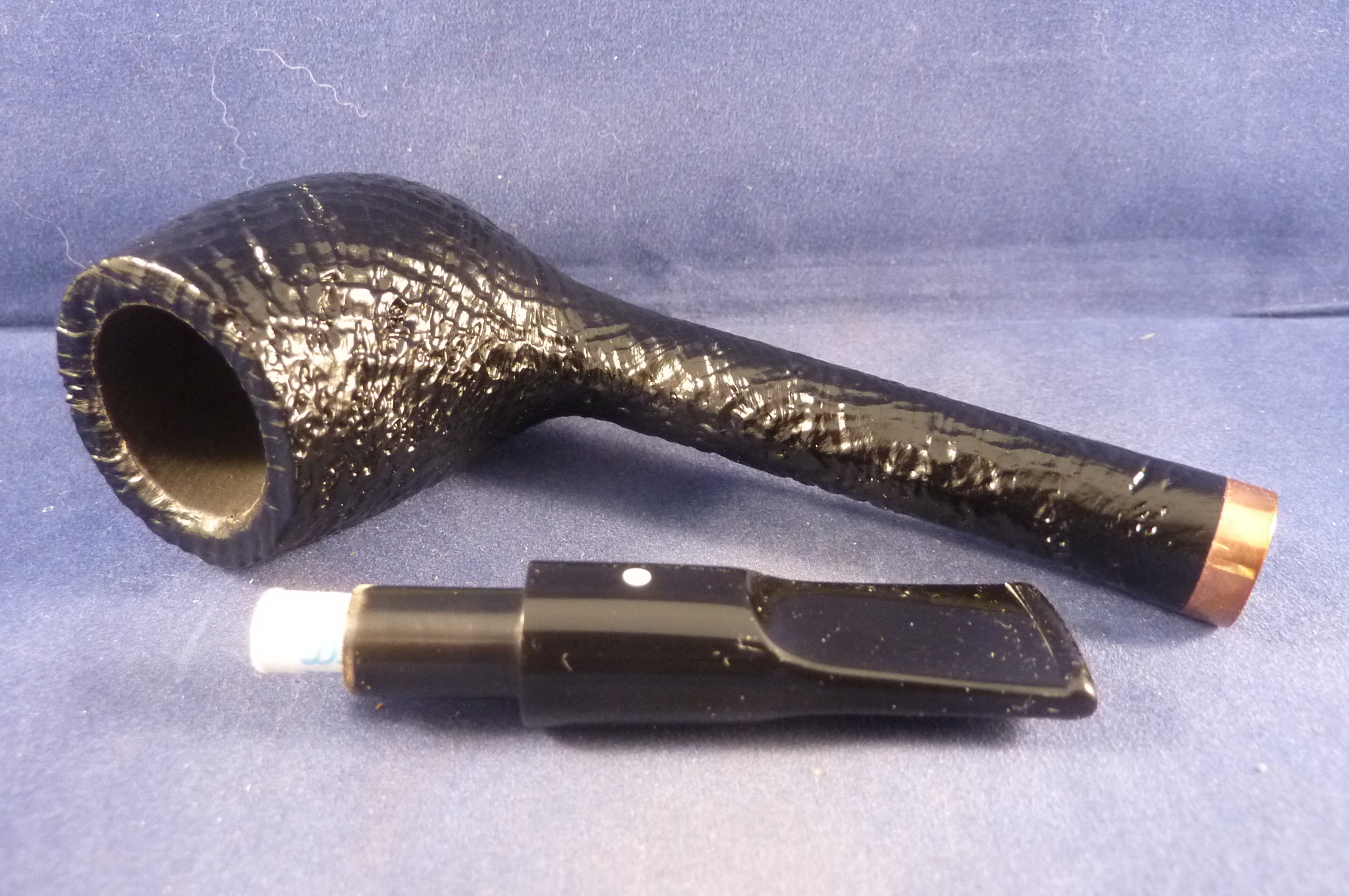 Rusticated briar pipe with a nickel mount, made by Peterson in Ireland. Brown marbled acrylic mouthpiece (fishtail), with 9 mm. filter.