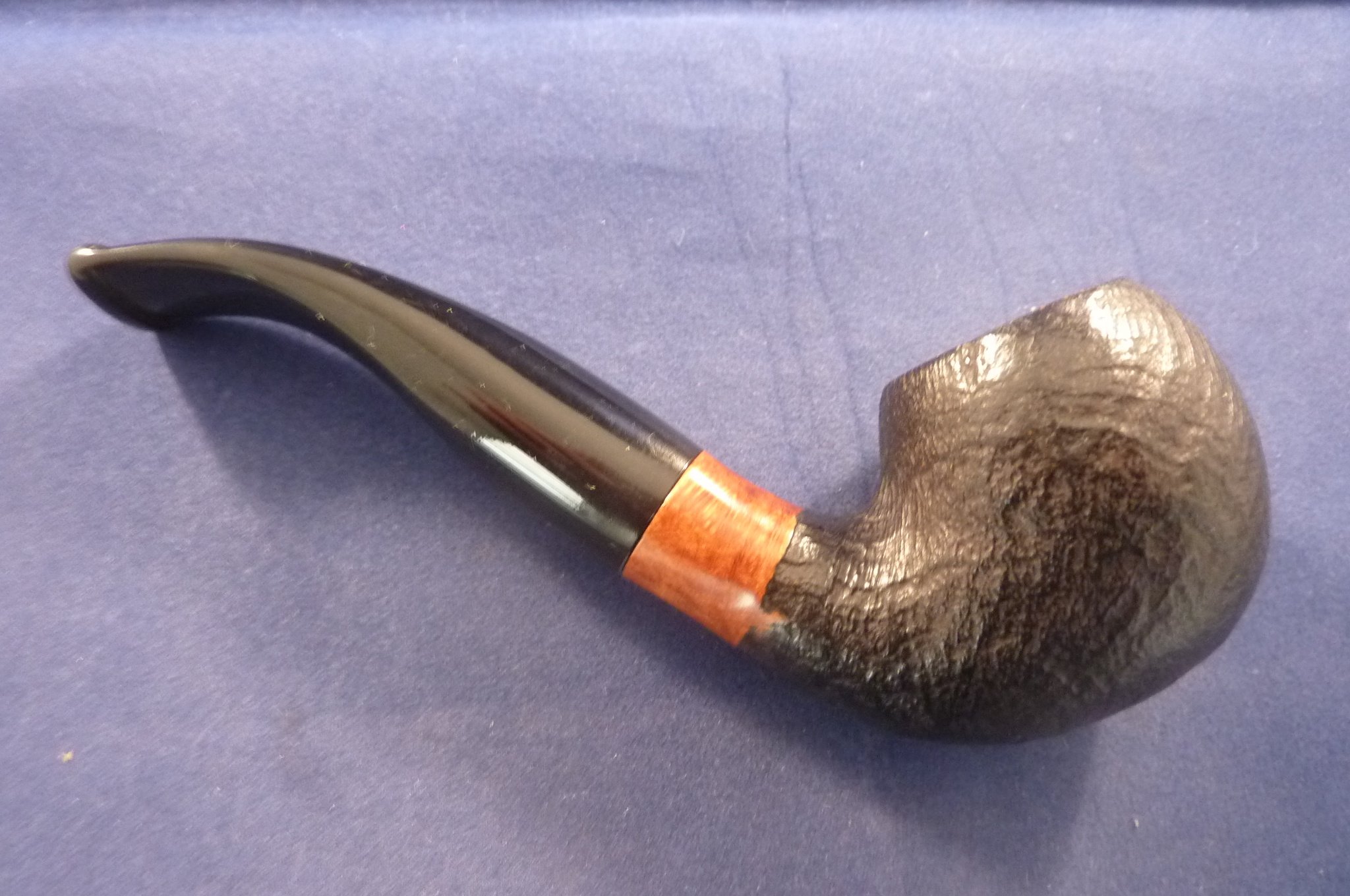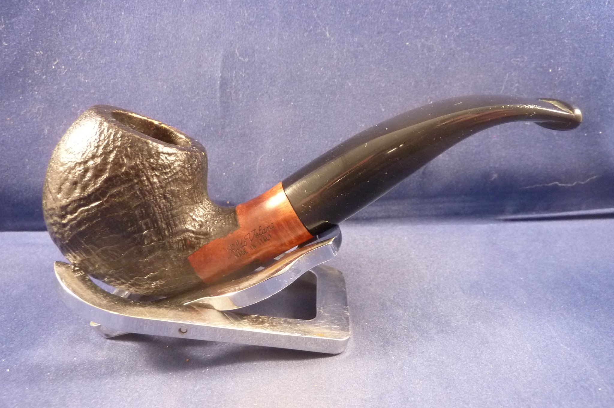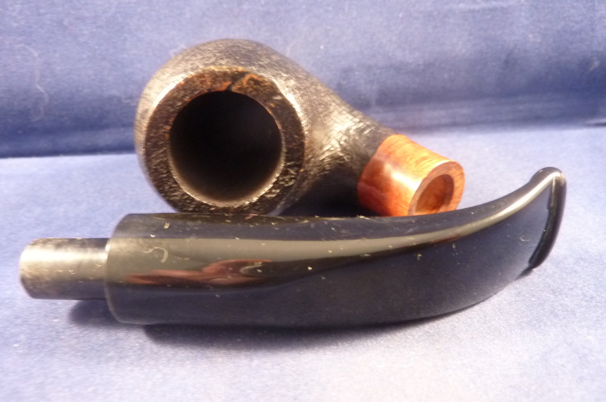 This is a briar pipe in a carved rusicated finish made in Italy for Giordano. Acrylic mouthpiece with a metal ring, 9 mm. filter.