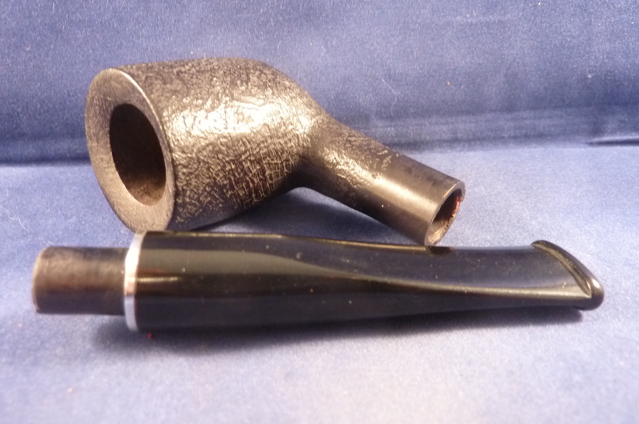 This is a briar pipe in a carved rusicated finish made in Italy for Giordano. Acrylic mouthpiece with a metal ring, 9 mm. filter.