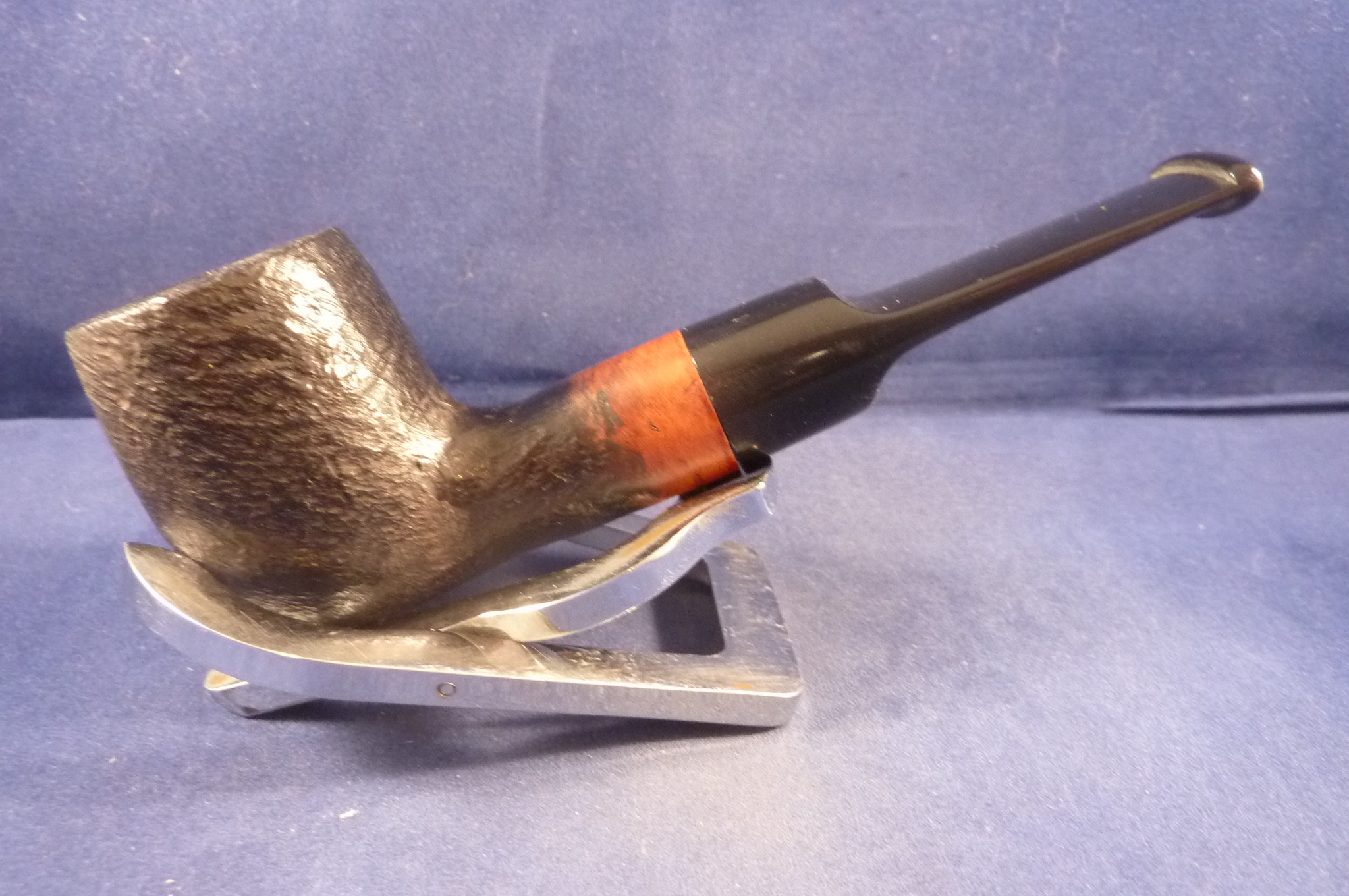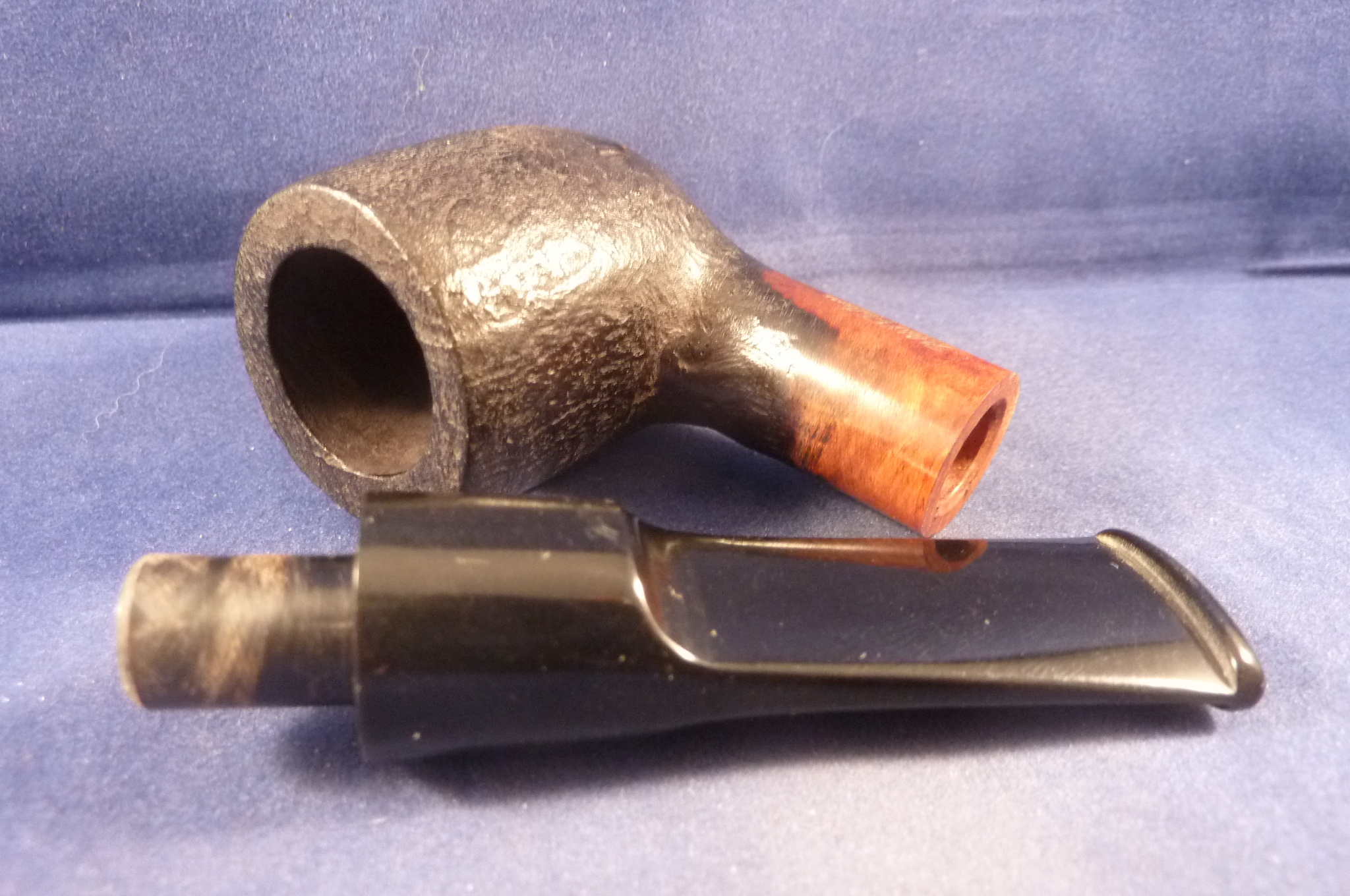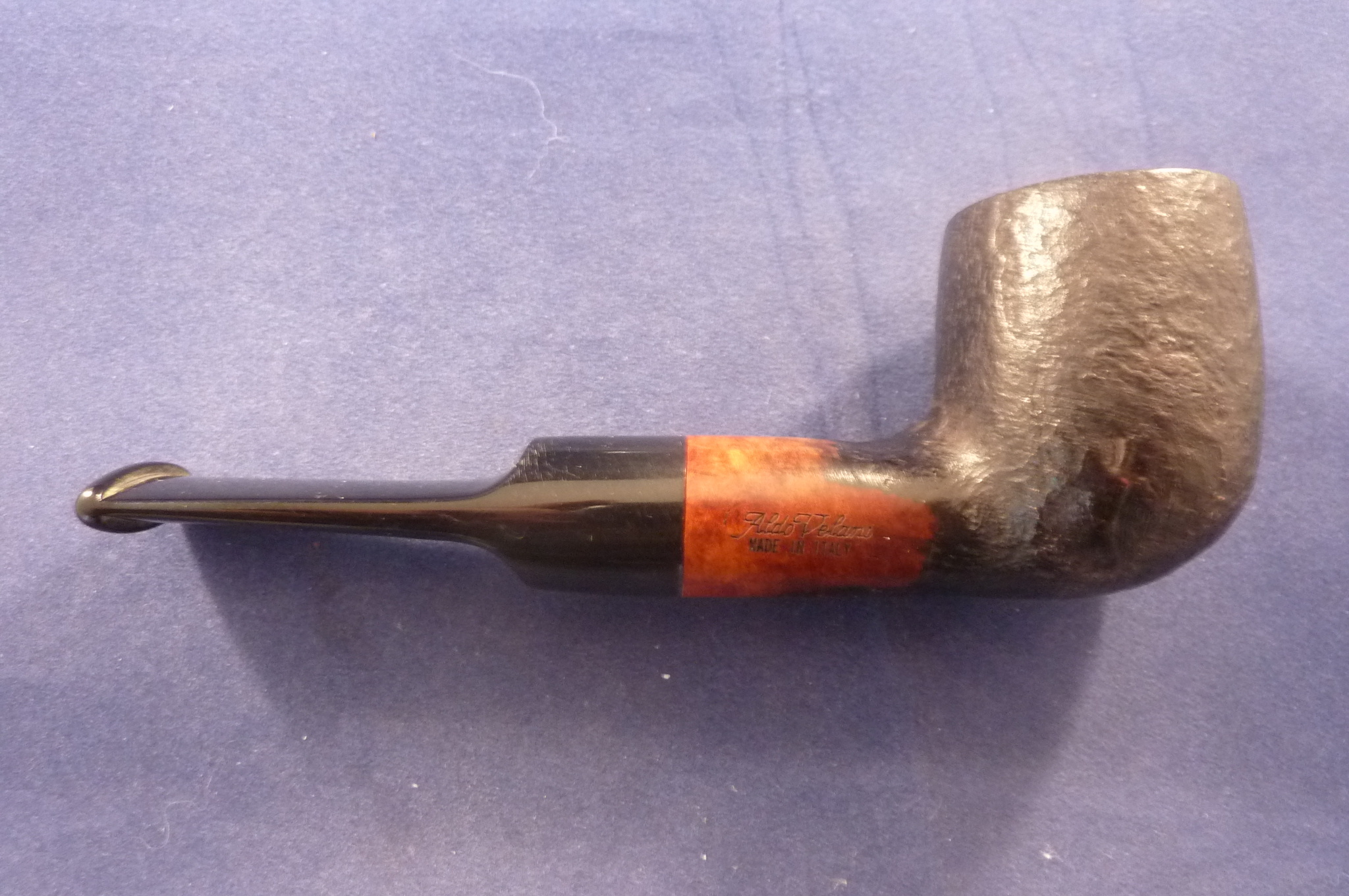 This is a briar pipe in a carved rusicated finish made in Italy for Giordano. Acrylic mouthpiece with a metal ring, 9 mm. filter.