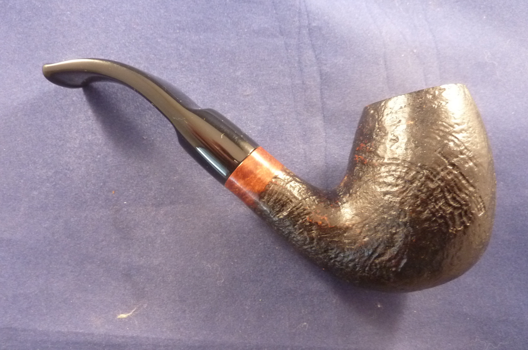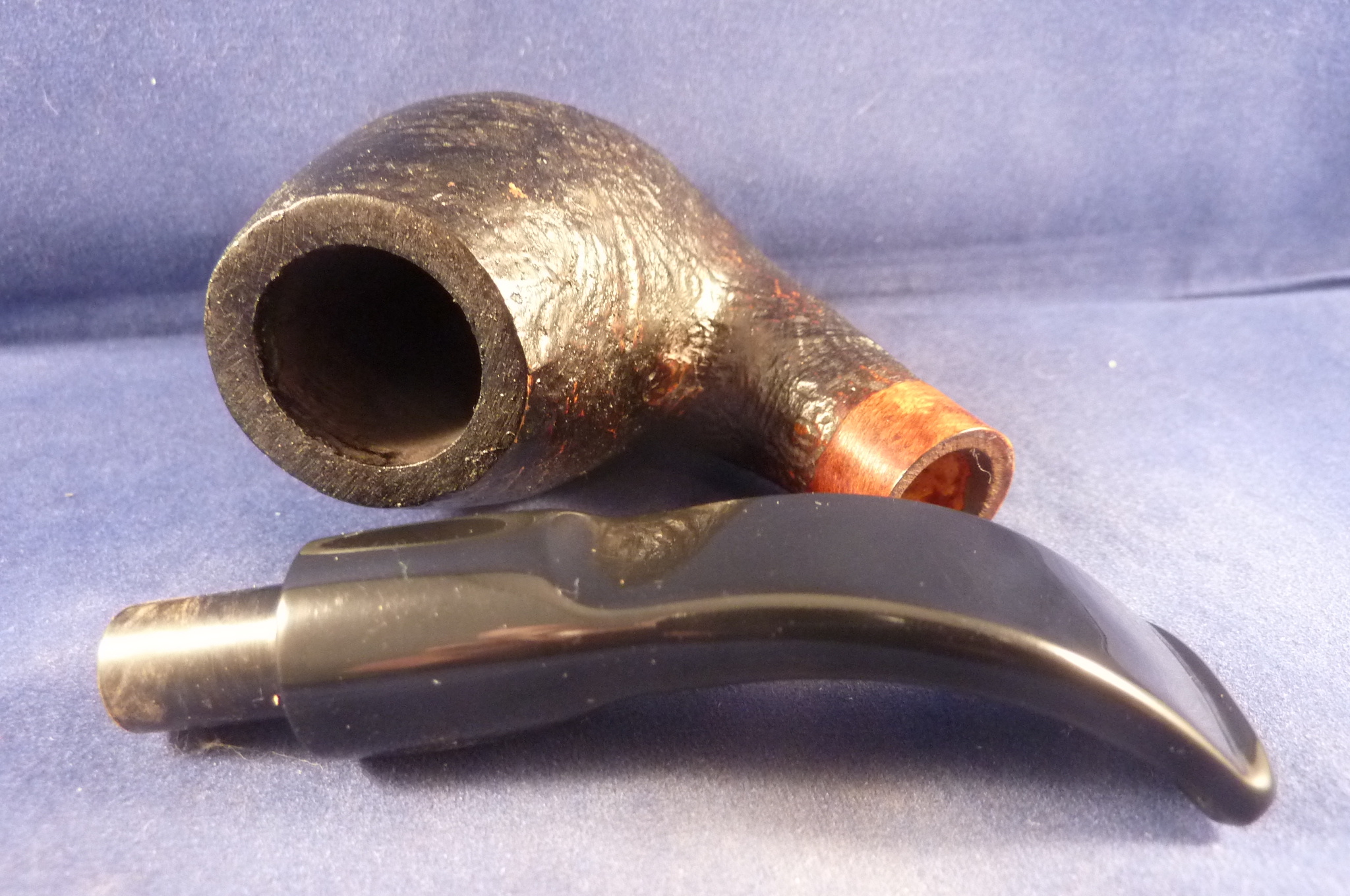 This is a briar pipe in a carved rusicated finish made in Italy for Giordano. Acrylic mouthpiece with a metal ring, 9 mm. filter.