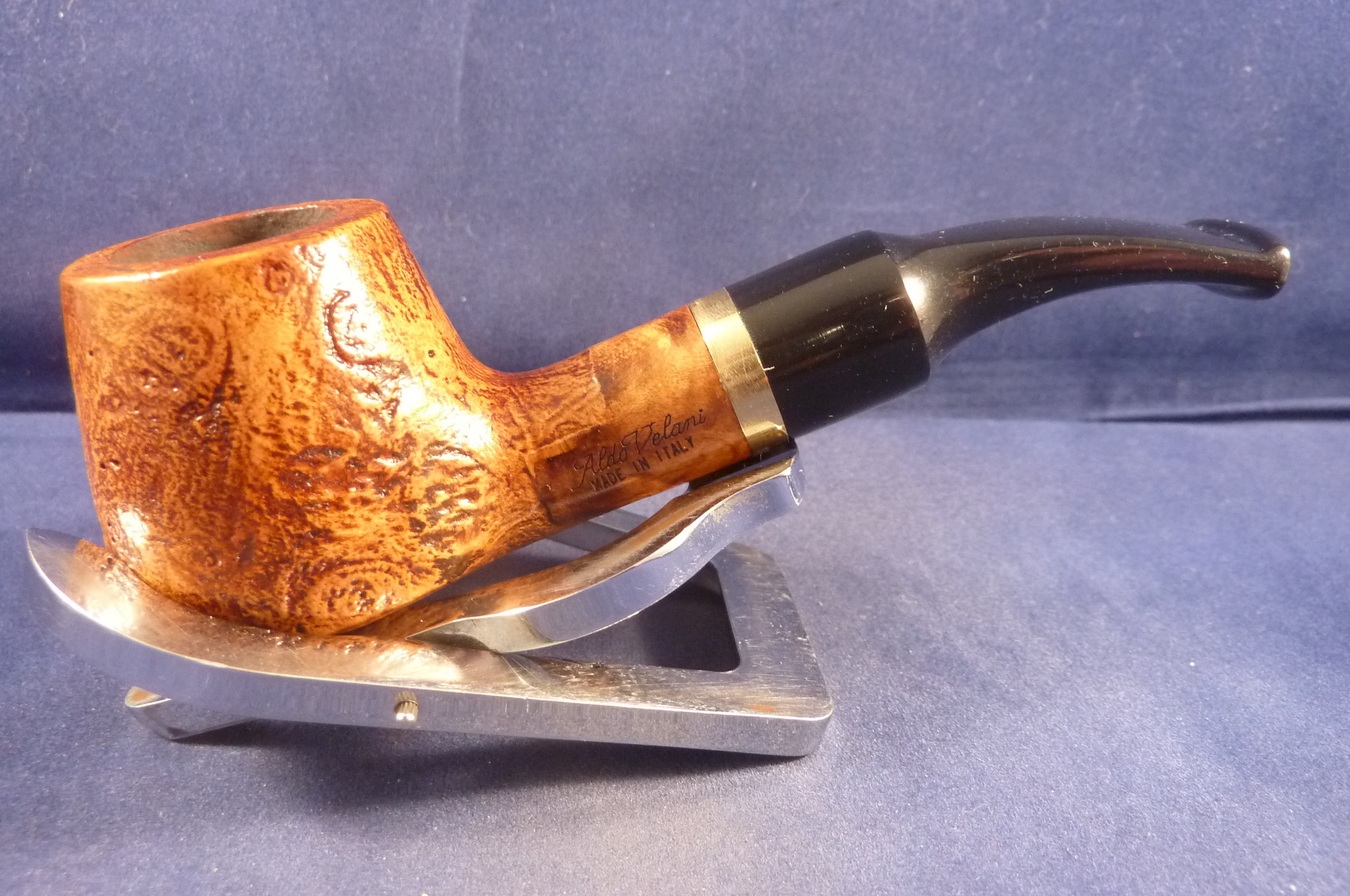 Small sandblasted briar pipe made by Aldo Velani in Italy. Acrylic mouthpiece with a brass ring, 9 mm. filter.