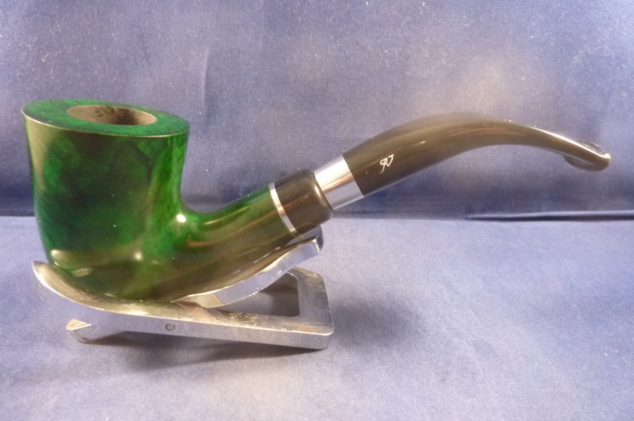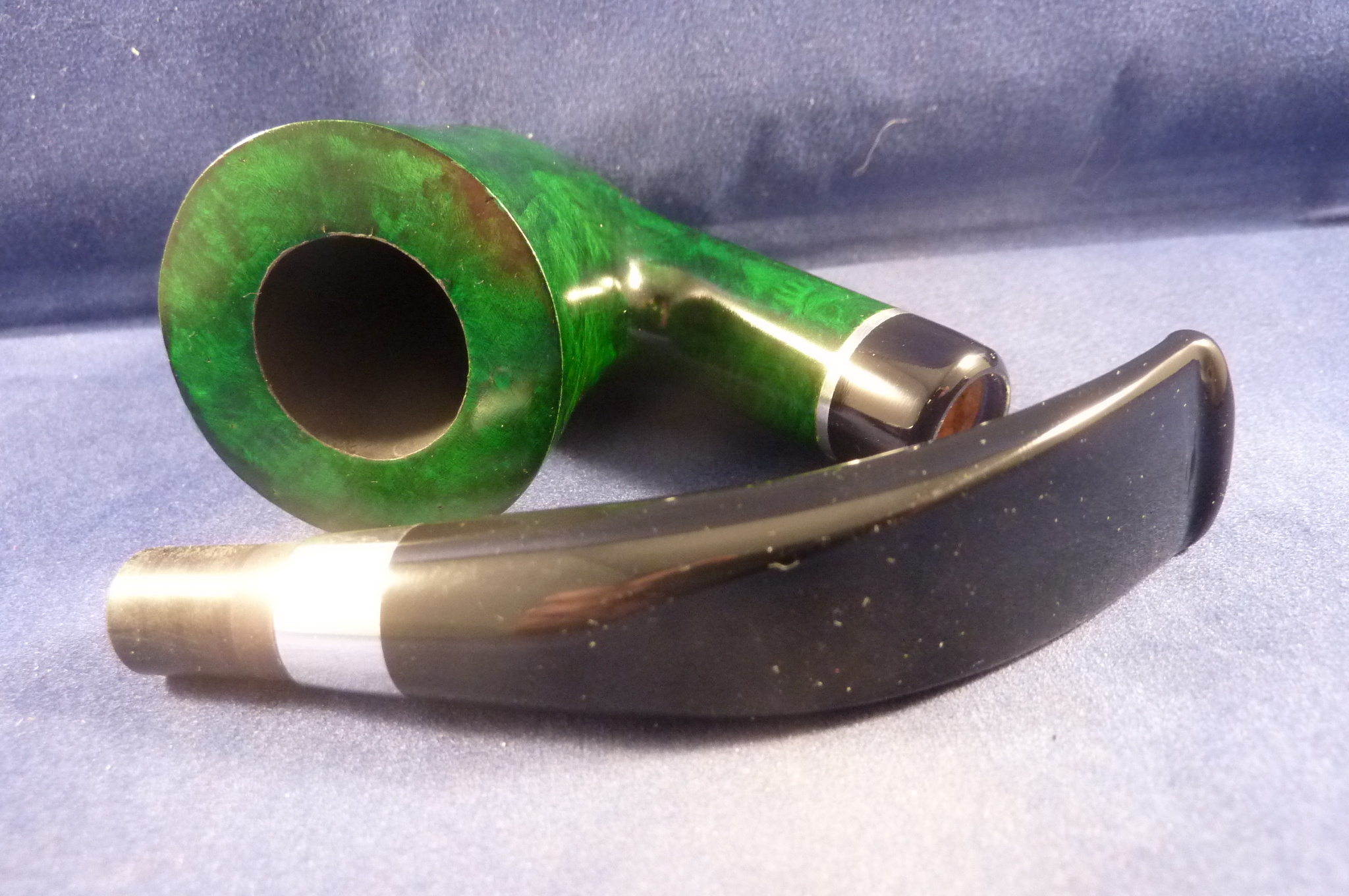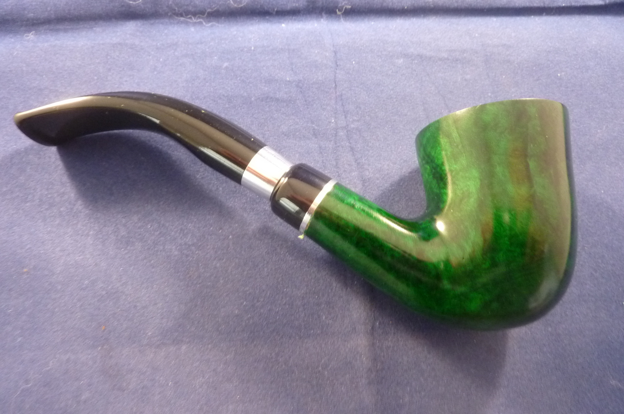 This is a brand new briar pipe made by Aldo Velani in Italy. Acrylic mouthpiece, 9 mm. filter. The metal application on the mouthpiece make the pipe look like a spigot.