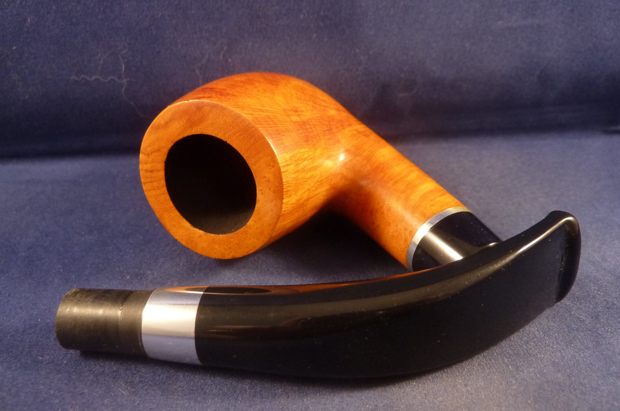 This is a brand new briar pipe made by Aldo Velani in Italy. Acrylic mouthpiece, 9 mm. filter. The metal application on the mouthpiece make the pipe look like a spigot.