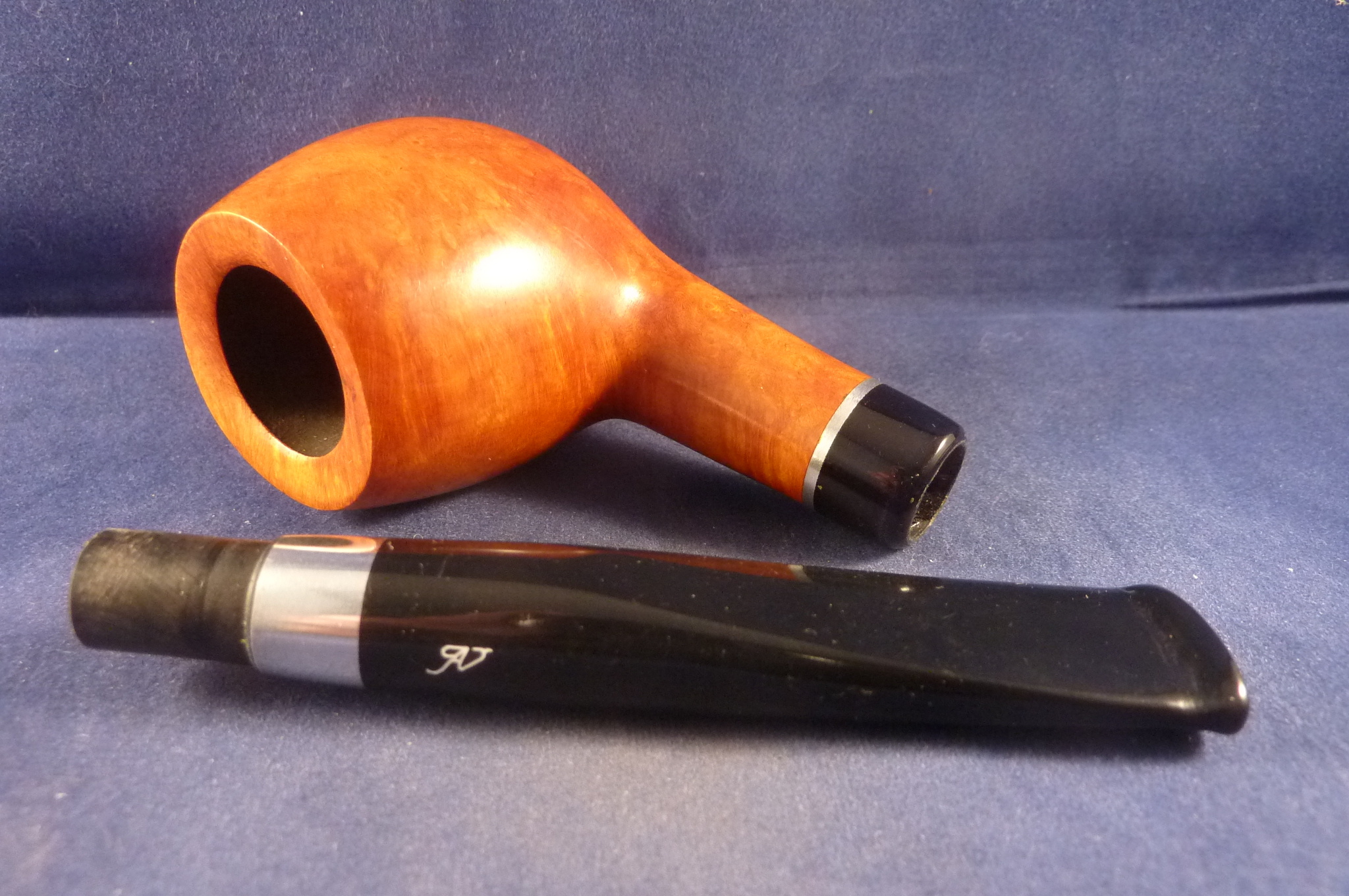 This is a brand new briar pipe made by Aldo Velani in Italy. Acrylic mouthpiece, 9 mm. filter. The metal application on the mouthpiece make the pipe look like a spigot.
