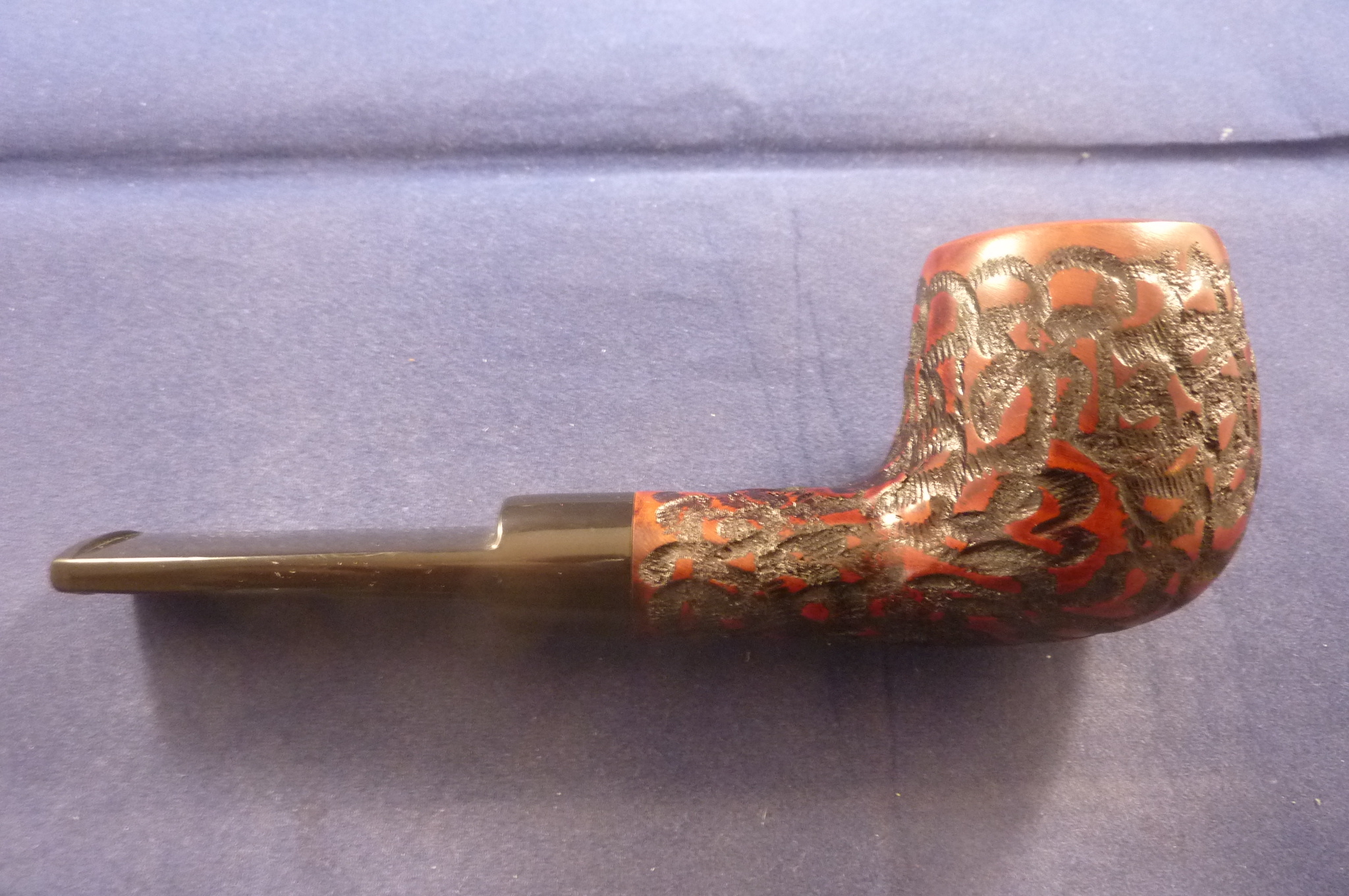 This is a brand new pipe made by L'Anatra in Italy. This Italian pipe has really great colours and has been beautiful sandblasted. Acrylic mouthpiece, with 9 mm. filter.
